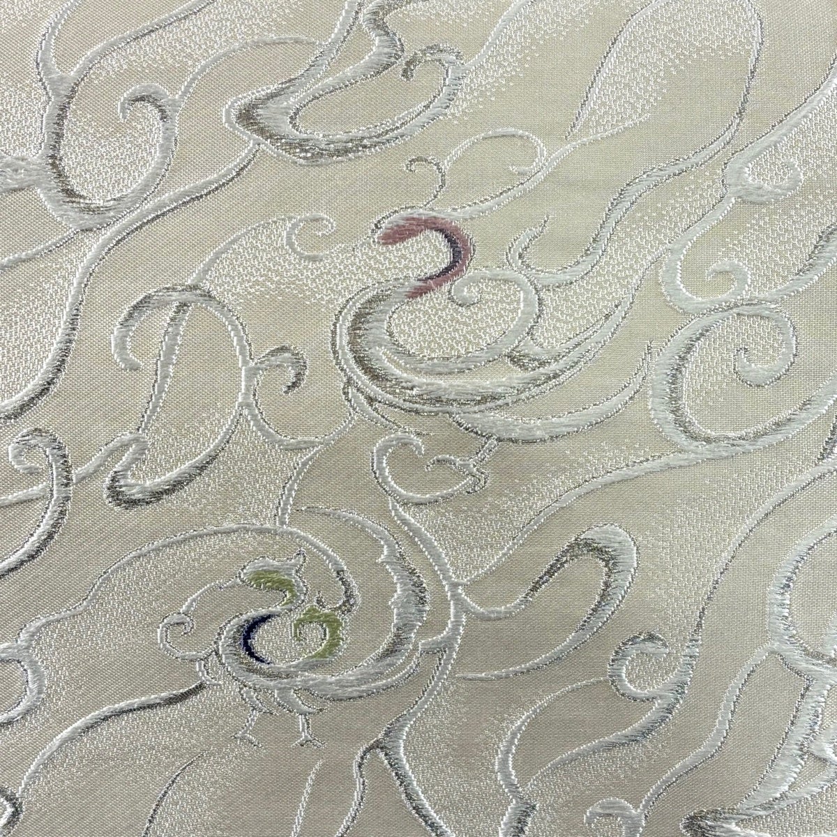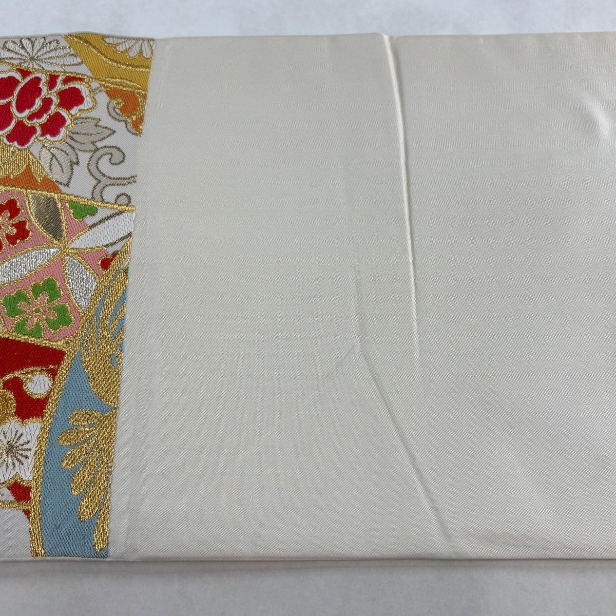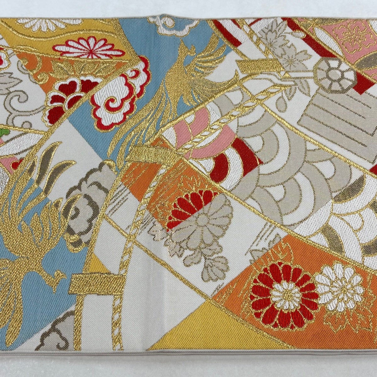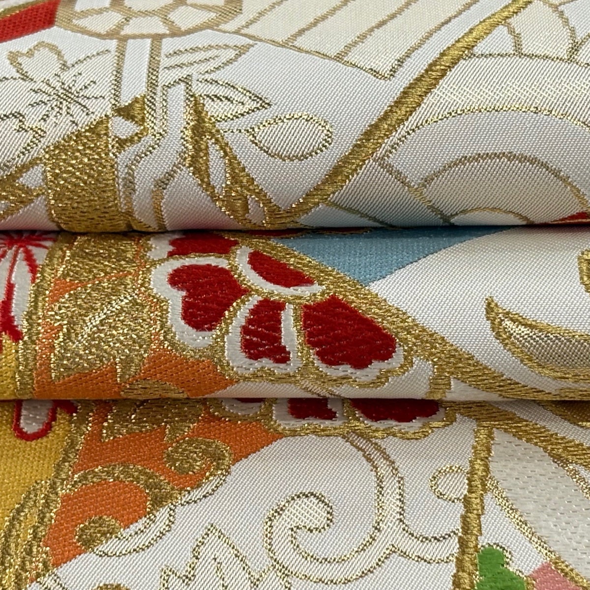 【美品】 袋帯 逸品 じゅらく 落款あり 帝王紫 花鳥 扇面 刺繍 箔 金色 お太鼓柄 正絹