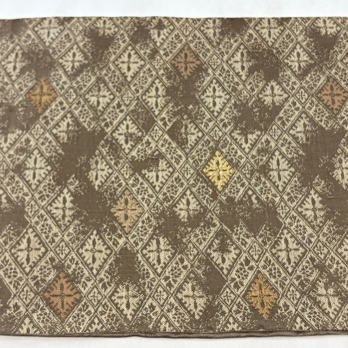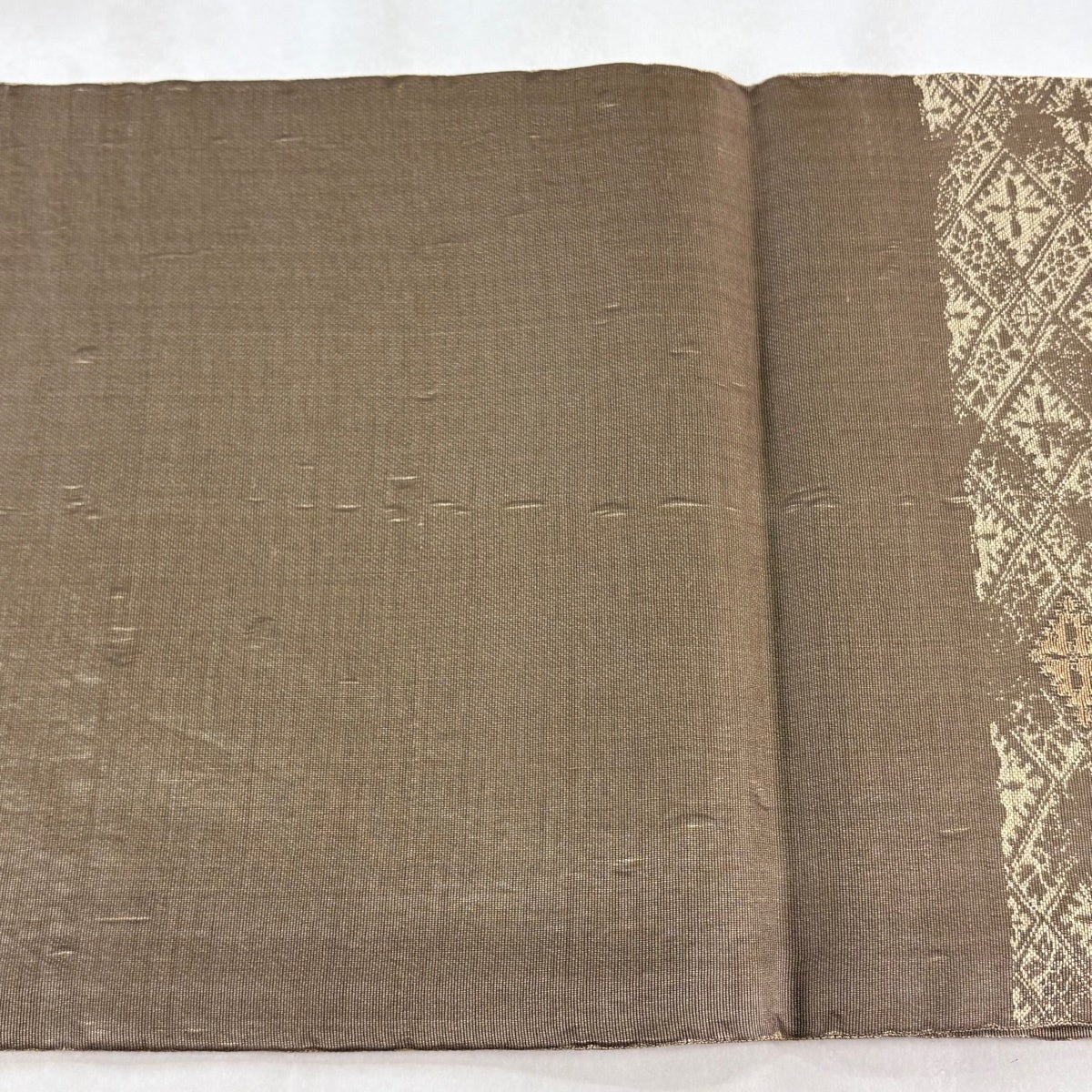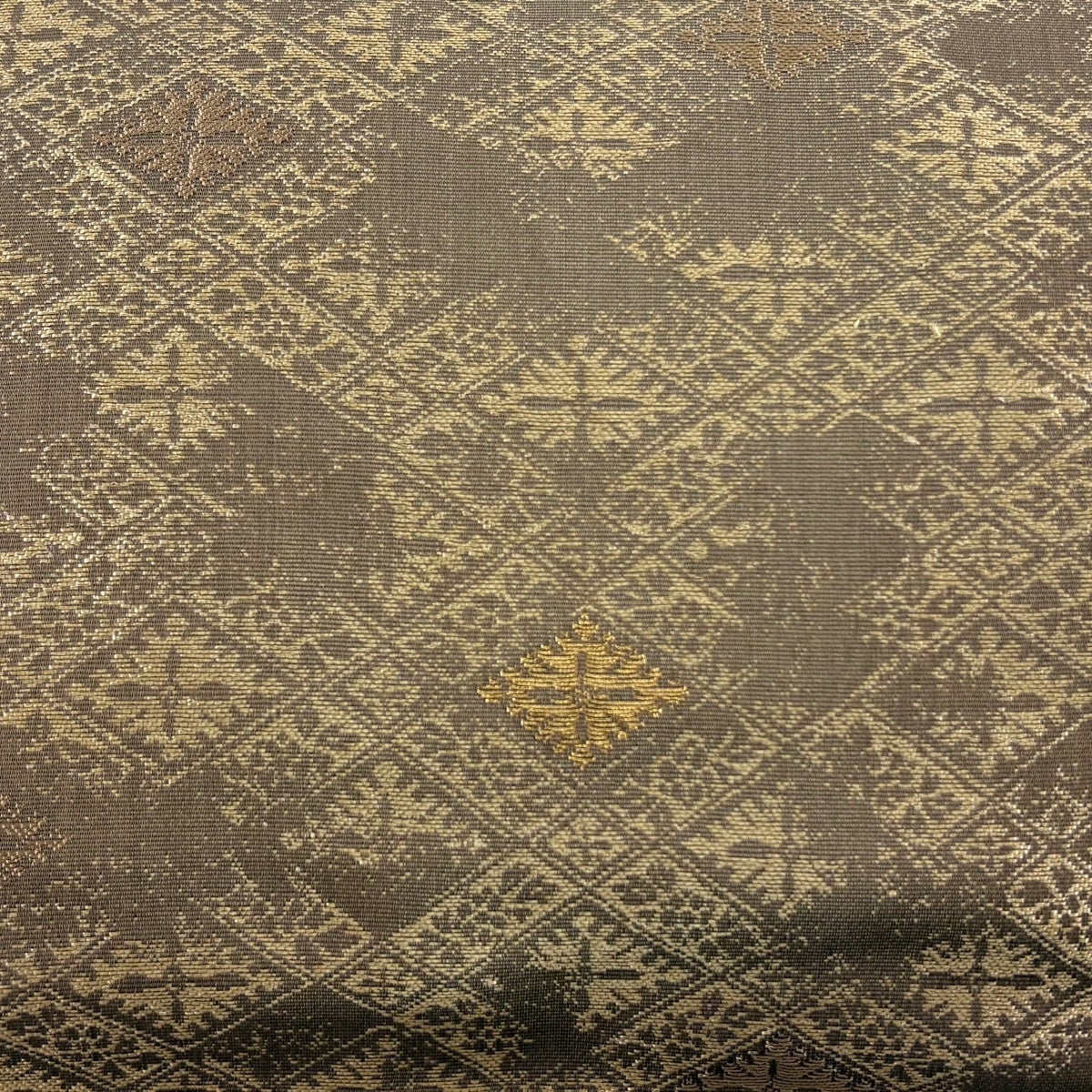 袋帯 逸品 加納幸 落款あり 黄金繭 印度ムガ蚕 夏帯 菱格子 草花 金糸 灰茶 六通 正絹