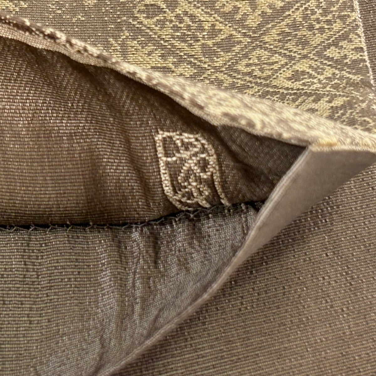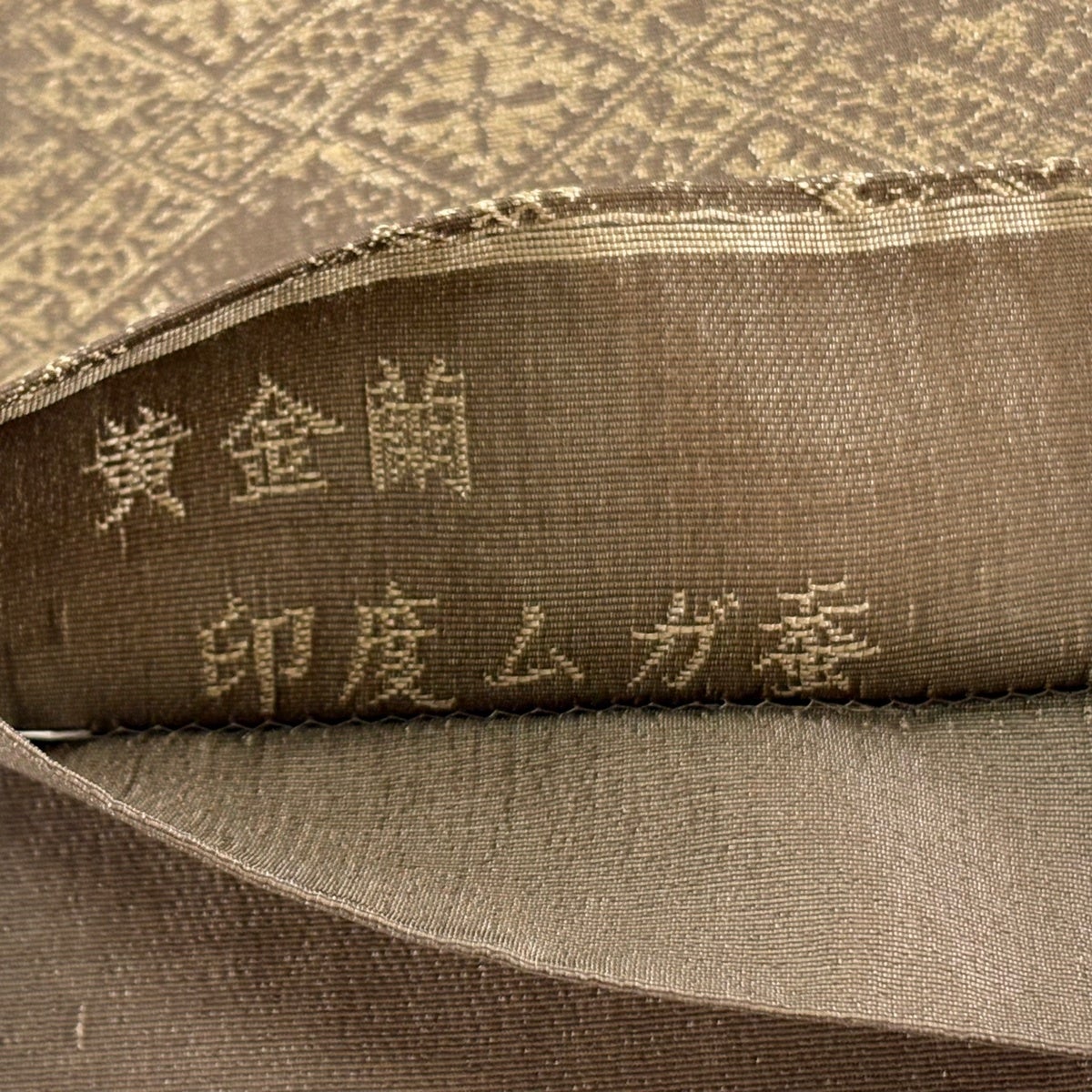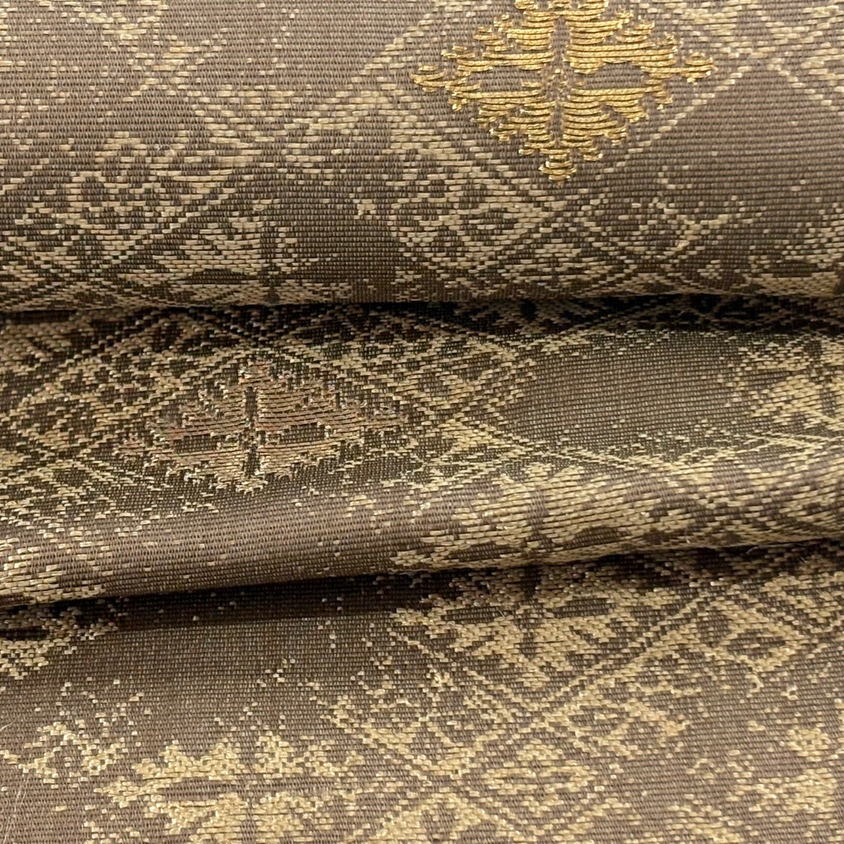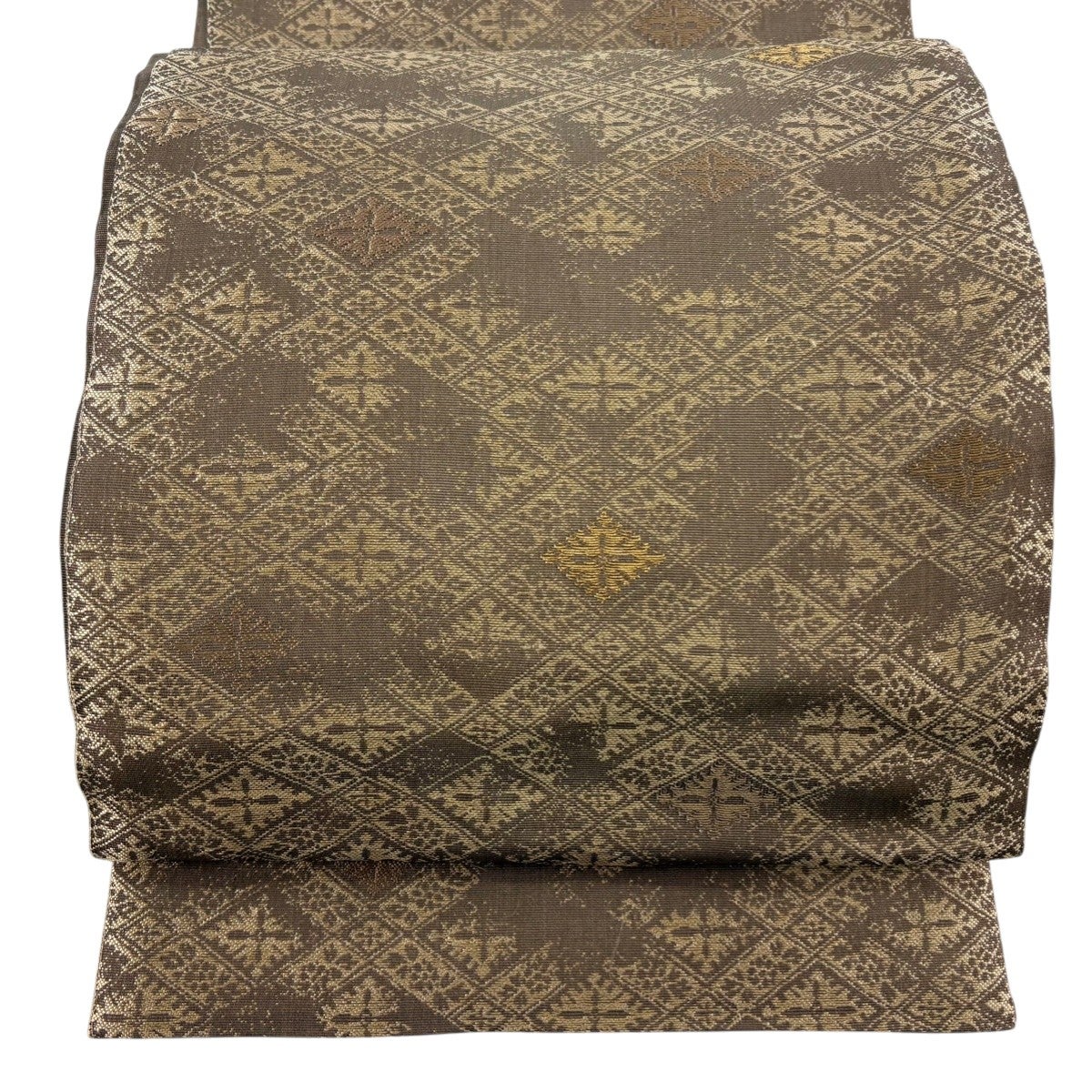 袋帯 逸品 加納幸 落款あり 黄金繭 印度ムガ蚕 夏帯 菱格子 草花 金糸 灰茶 六通 正絹