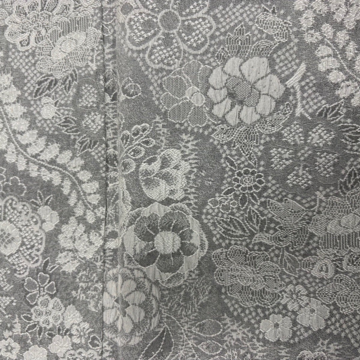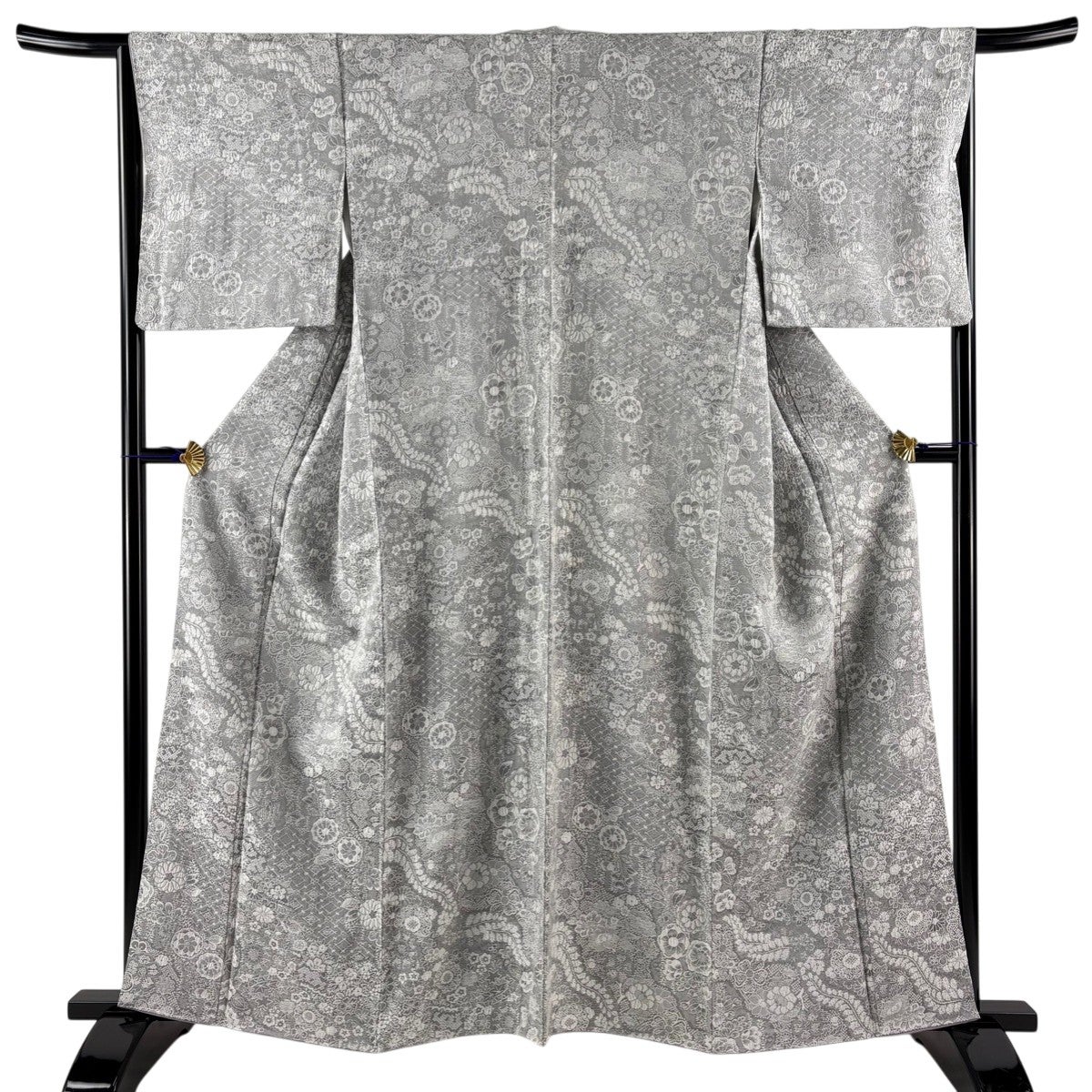 【美品】 小紋 身丈165cm 裄丈65cm M 袷 山岡古都 落款あり 草花 菱 紋意匠 灰色 正絹 逸品