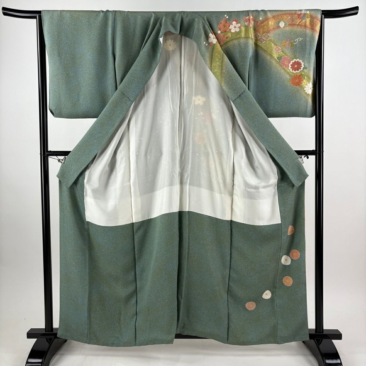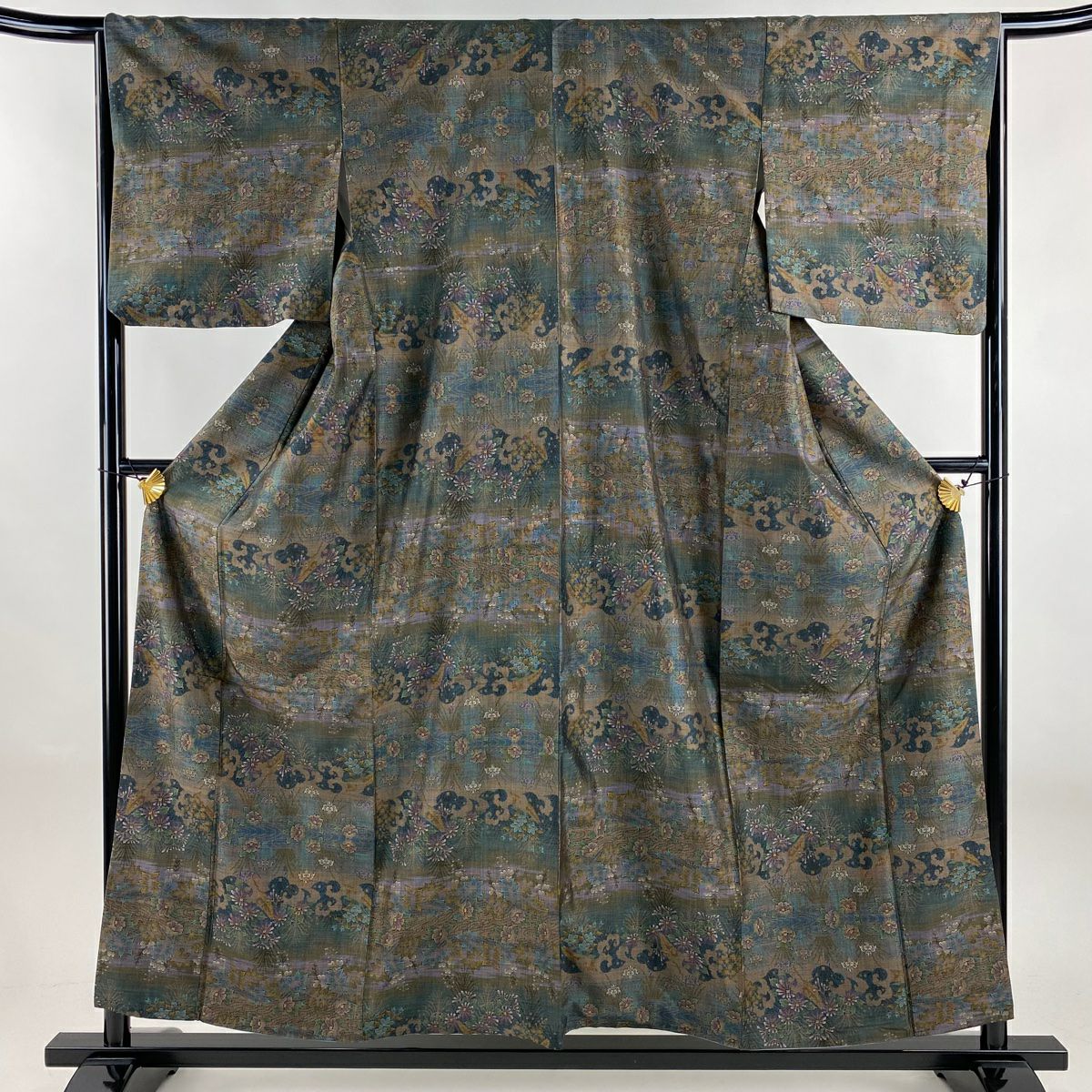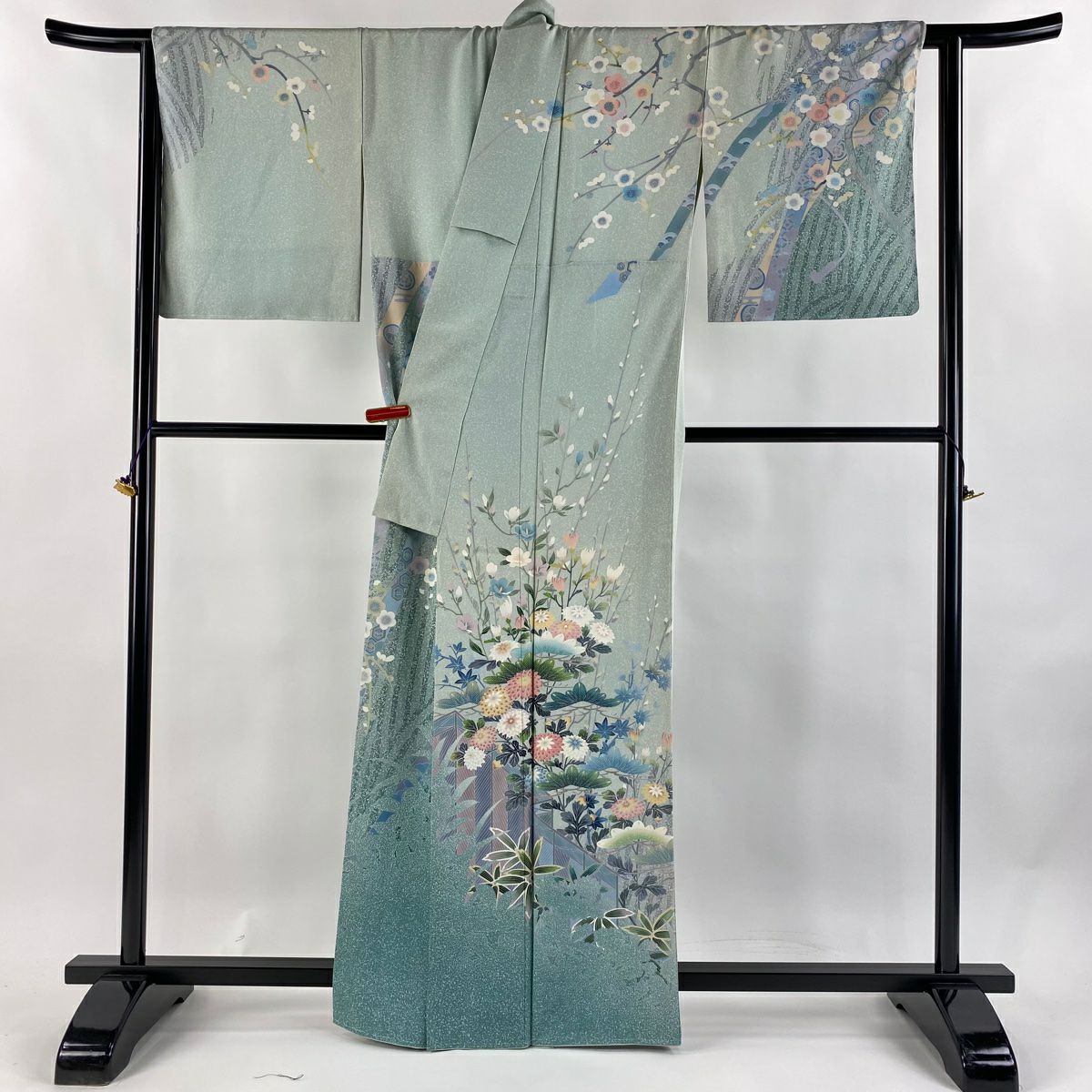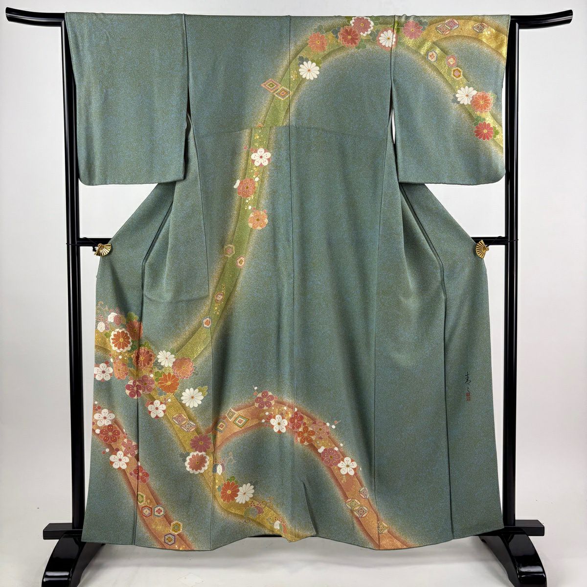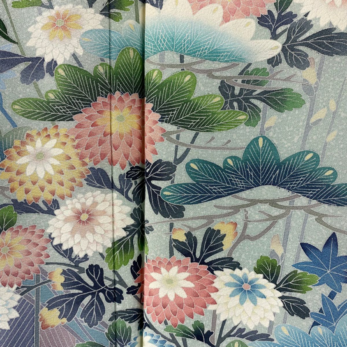 訪問着 身丈160cm 裄丈65.5cm M 袷 松井青々 落款あり 菊 梅 金糸 金銀彩 灰緑 正絹 逸品