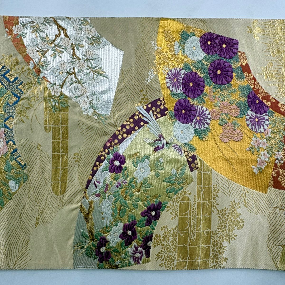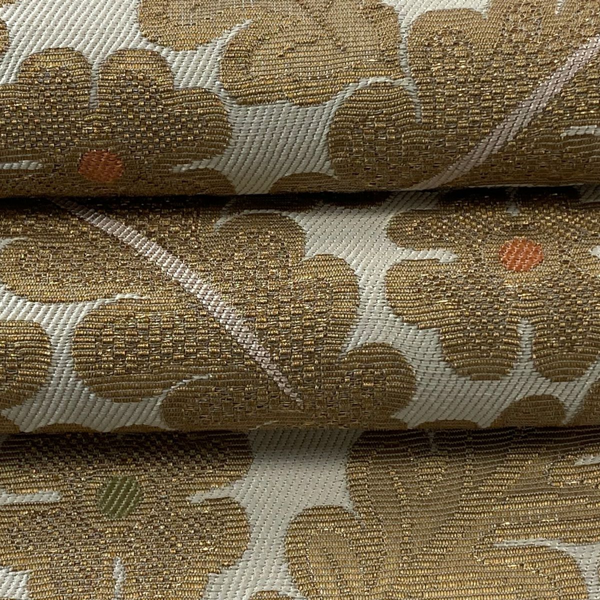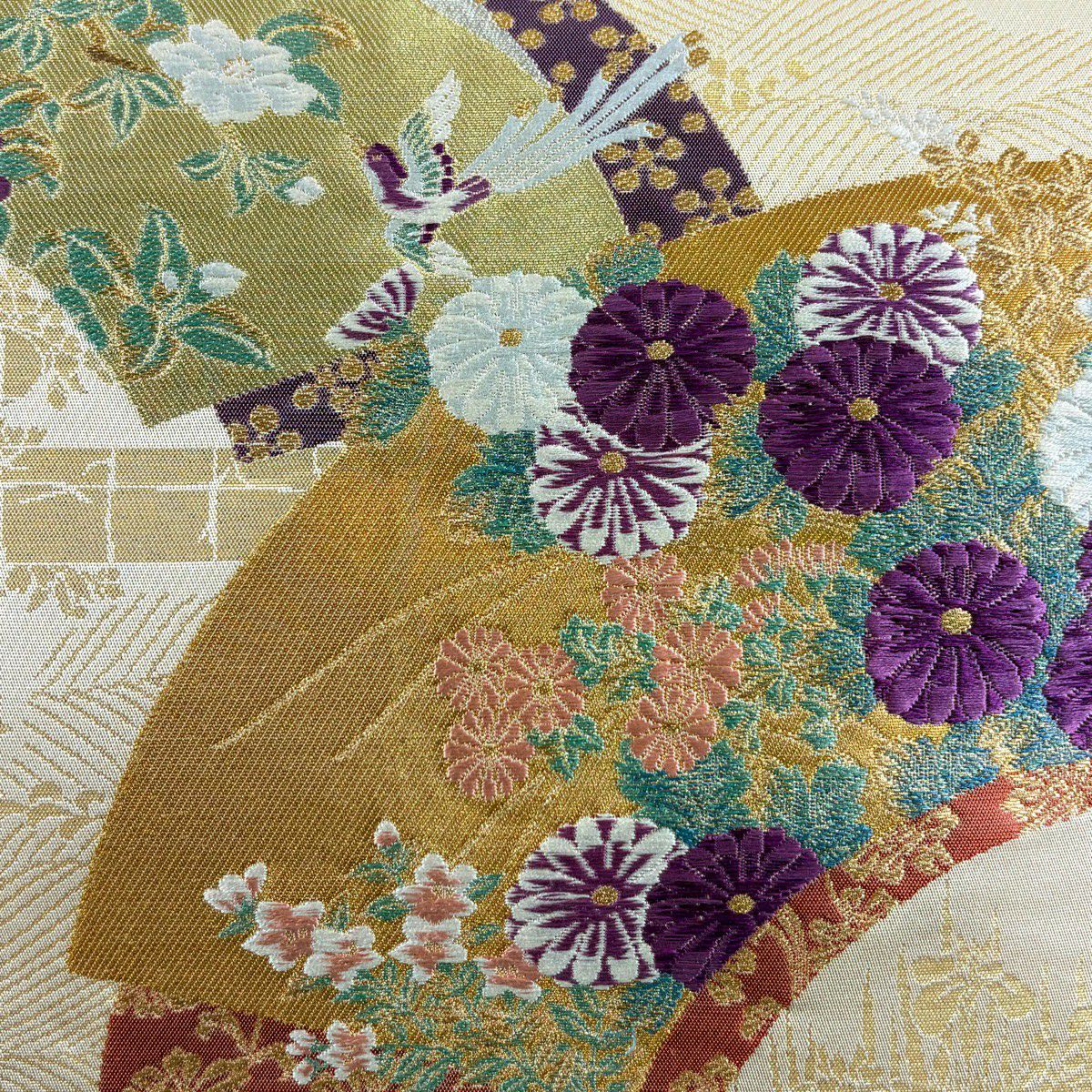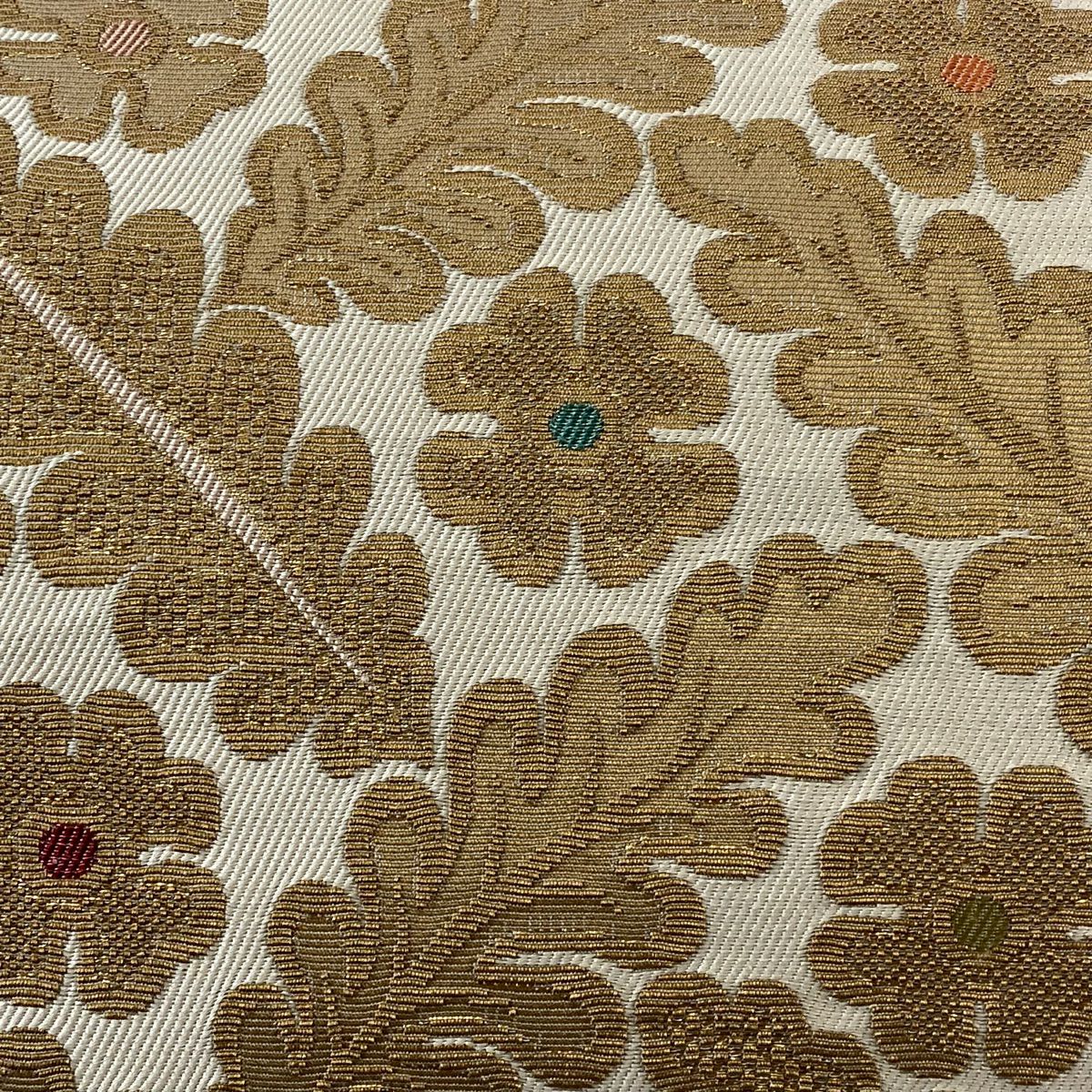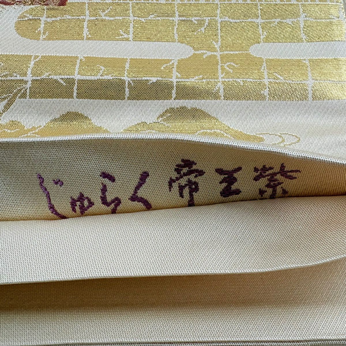 【美品】 袋帯 逸品 じゅらく 落款あり 証紙あり 帝王紫 扇面 花鳥 金糸 箔 ベージュ 六通 正絹