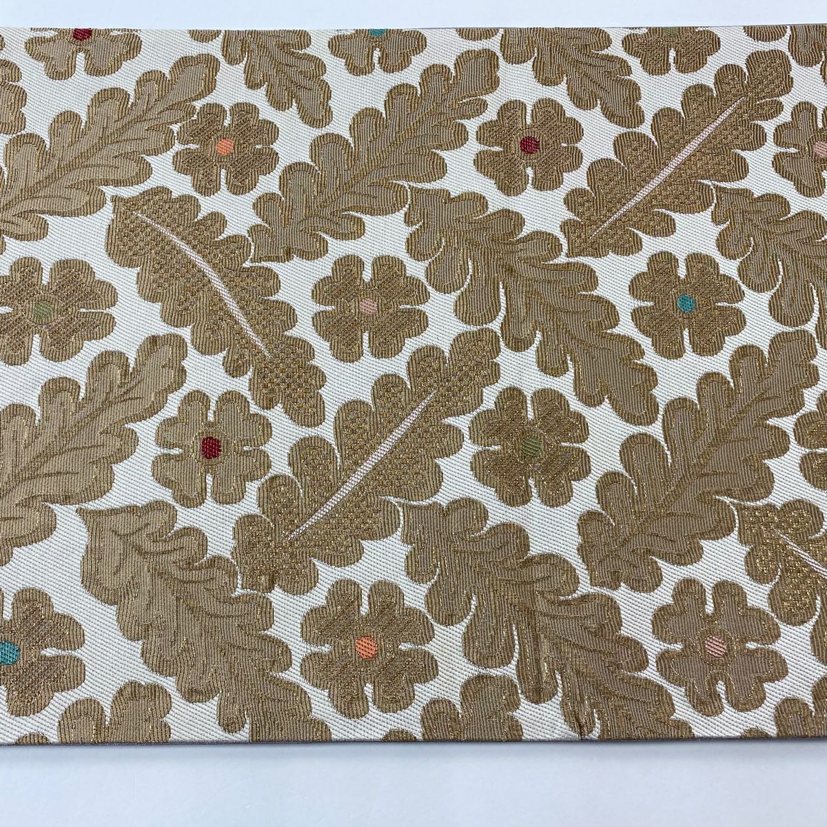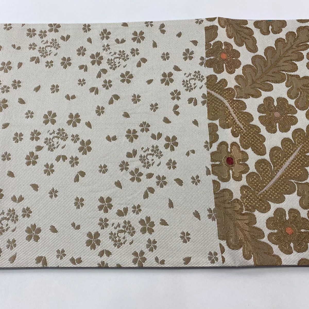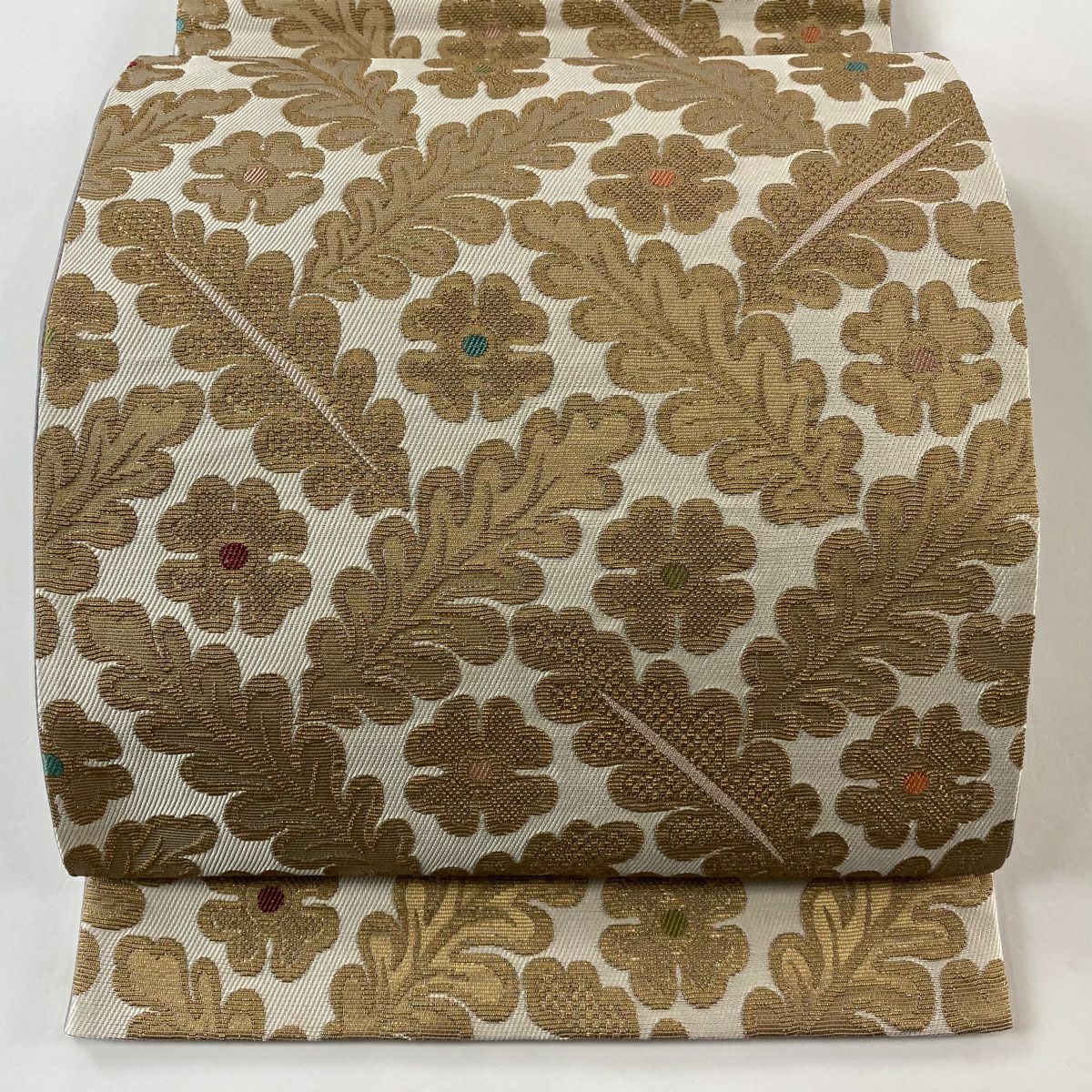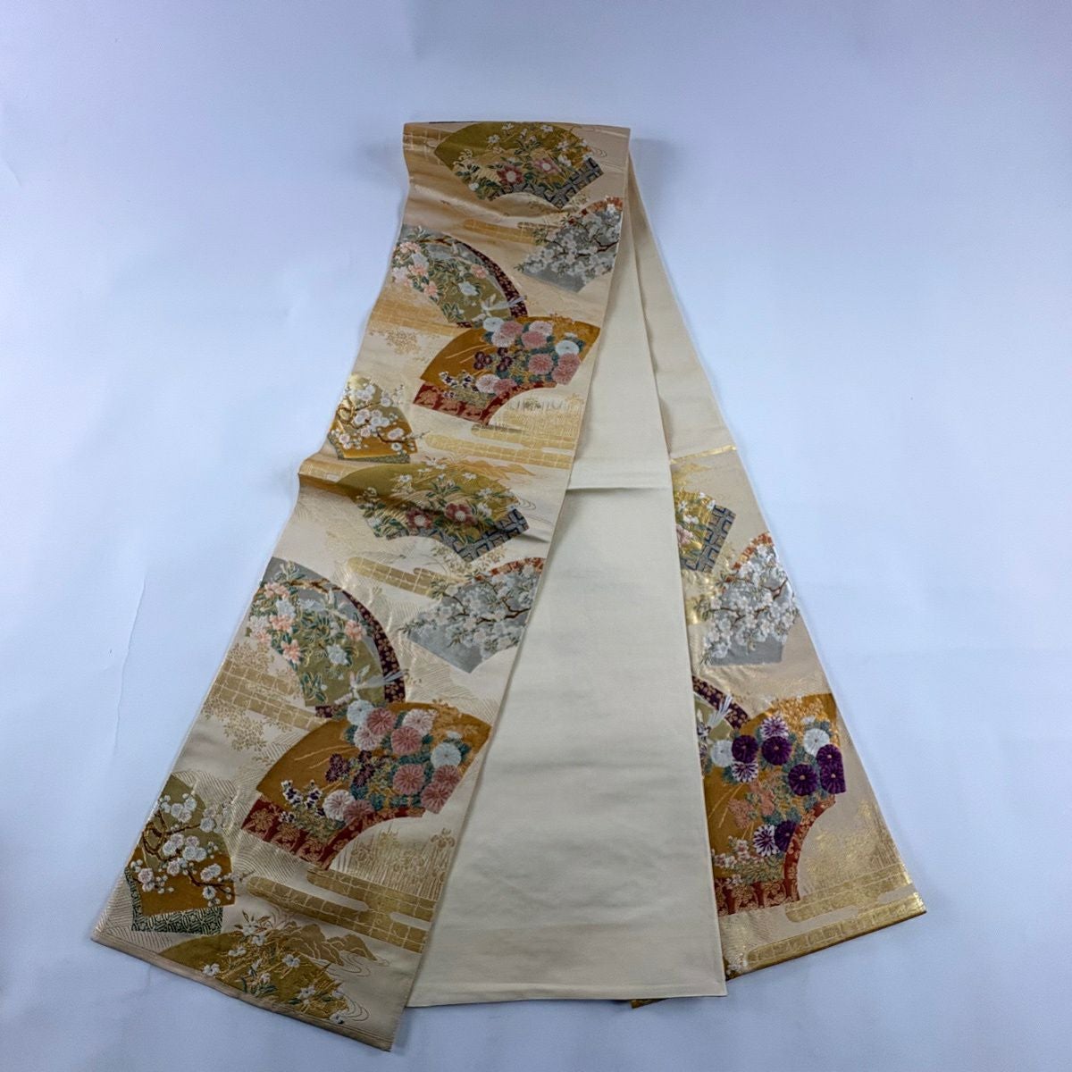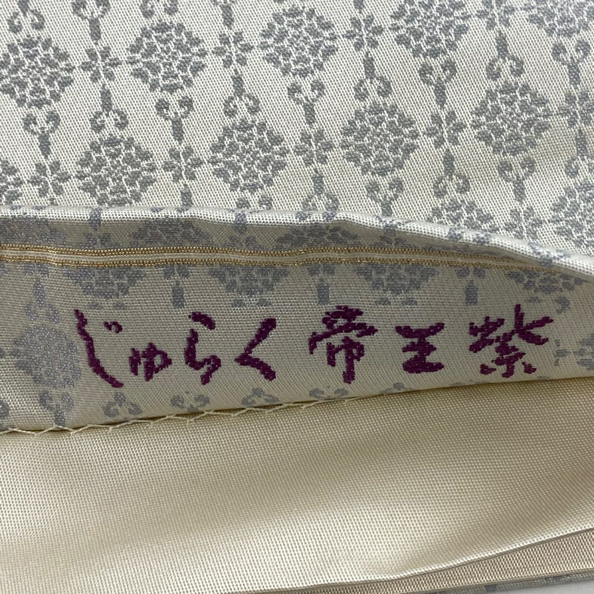 【美品】 袋帯 逸品 じゅらく 落款あり 証紙あり 帝王紫 扇面 花鳥 金糸 箔 ベージュ 六通 正絹
