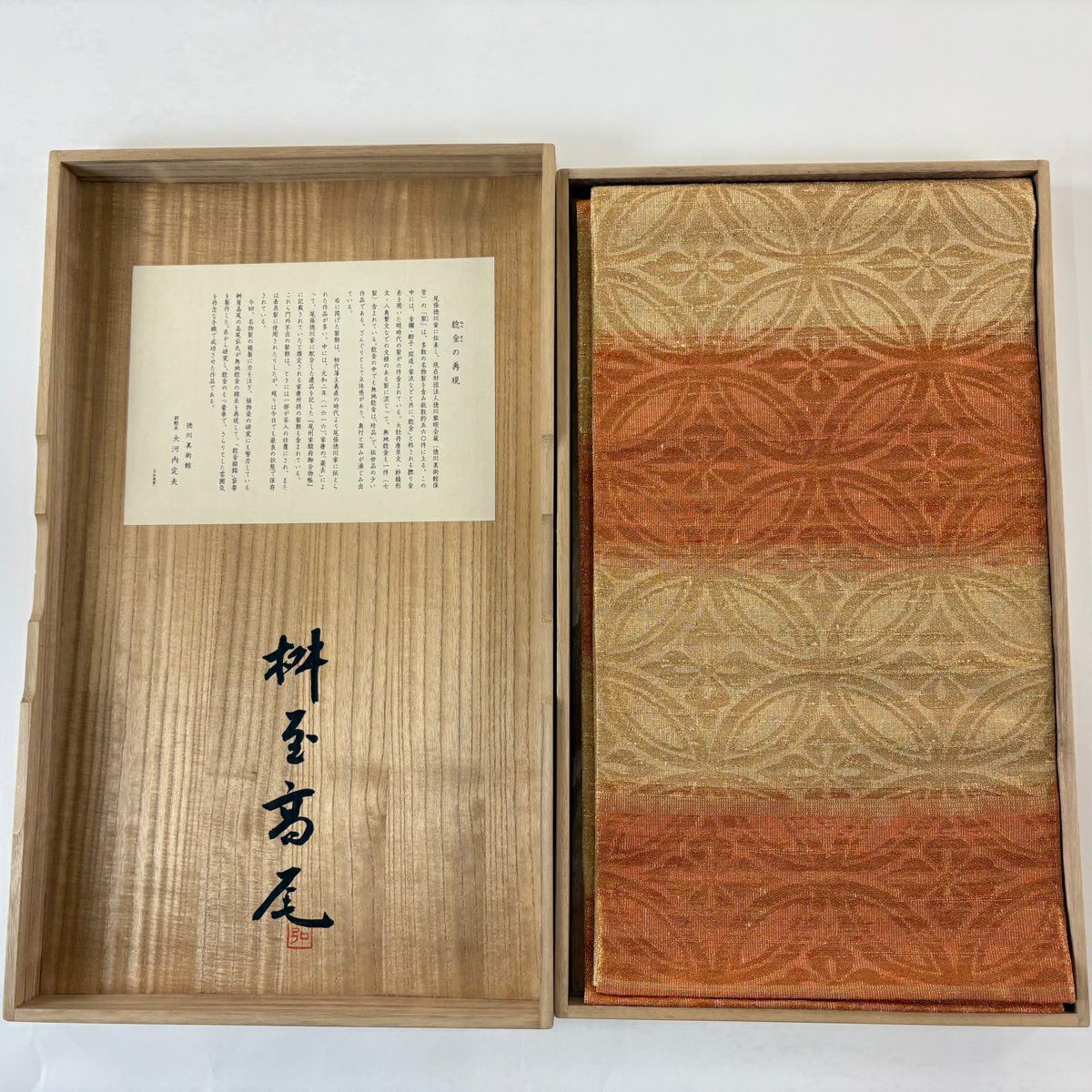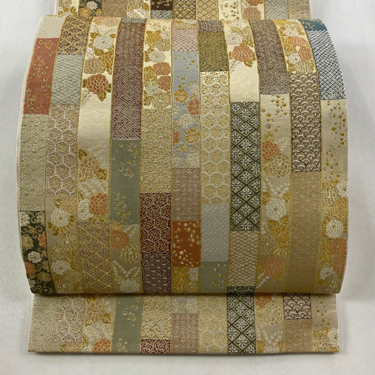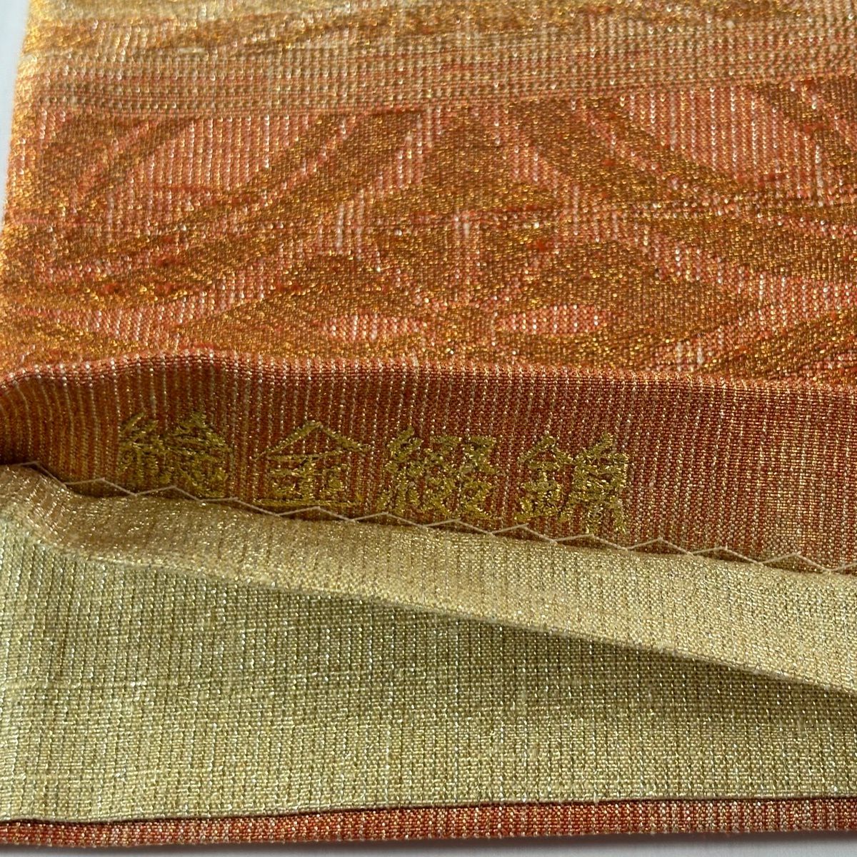袋帯 逸品 桝屋高尾 落款あり 関西仕立て 共箱有 七宝文 段縞模様 金銀糸 ねん金綴錦 金色 全通 正絹