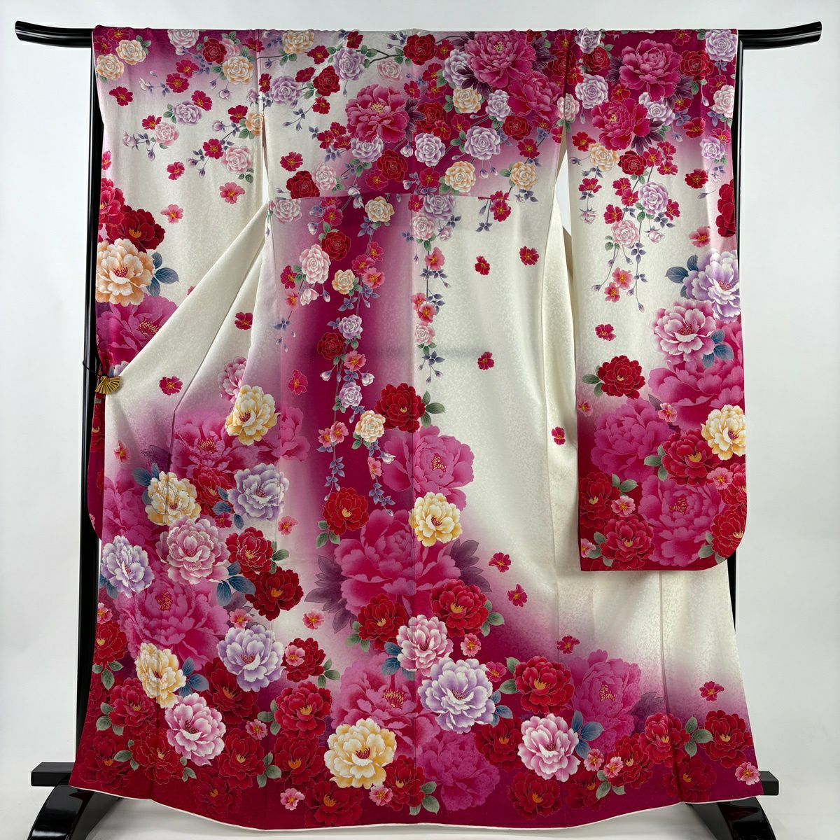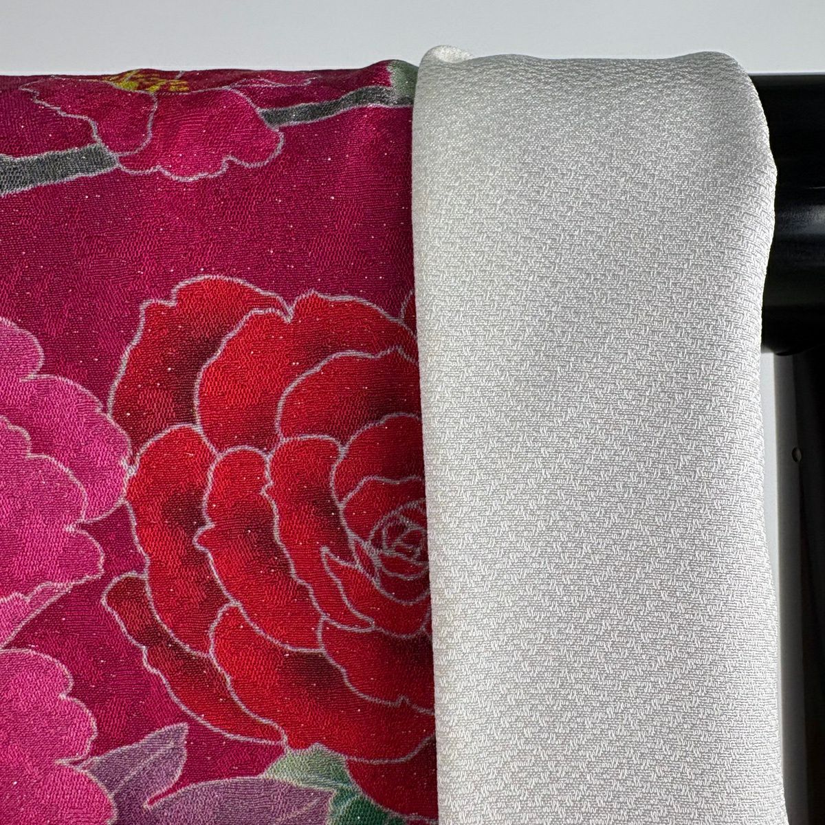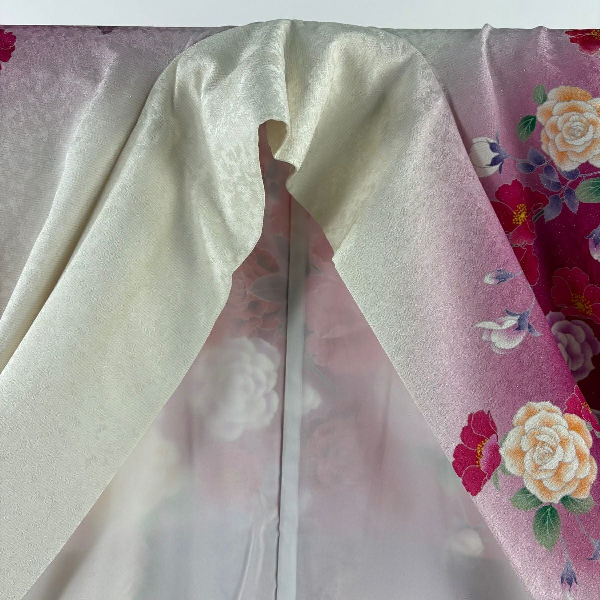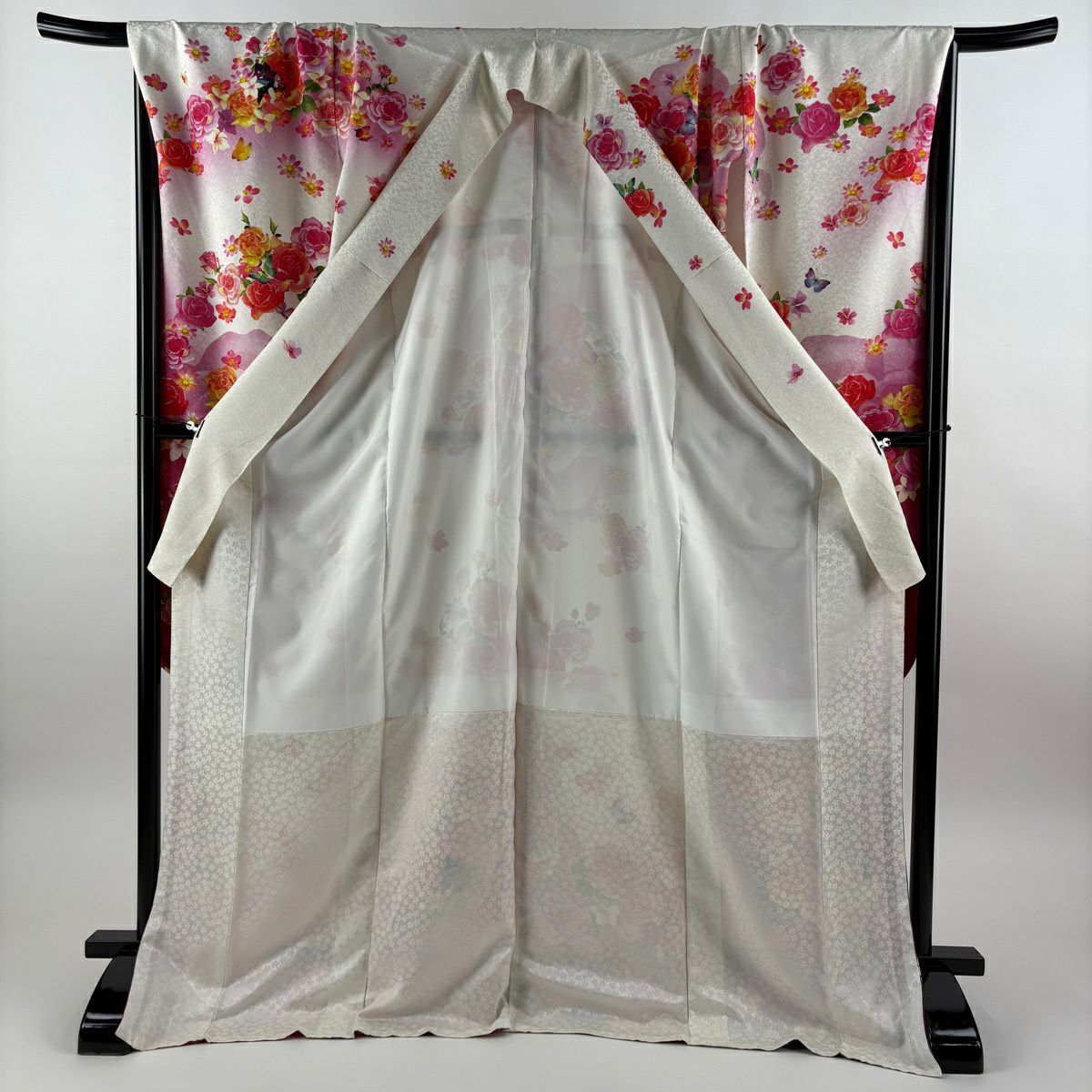 【美品】 振袖 身丈165.5cm 裄丈67.5cm L 袷 牡丹 薔薇 銀通し ラメ 濃ピンク 正絹 逸品
