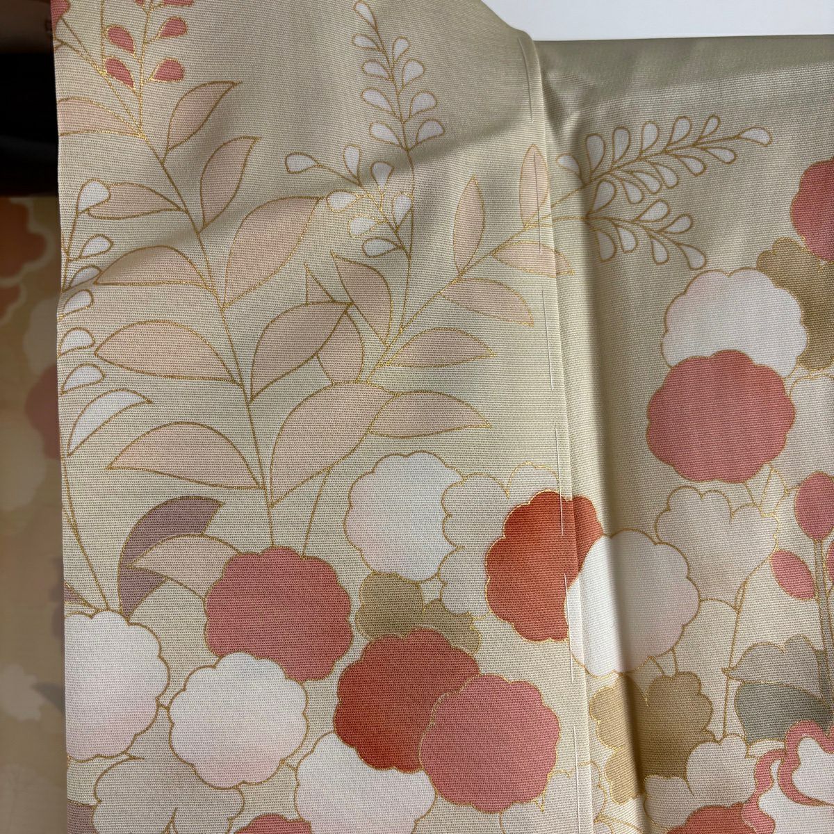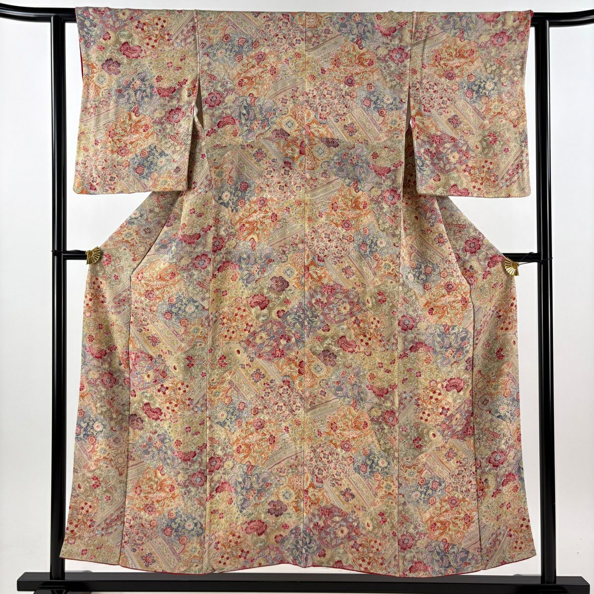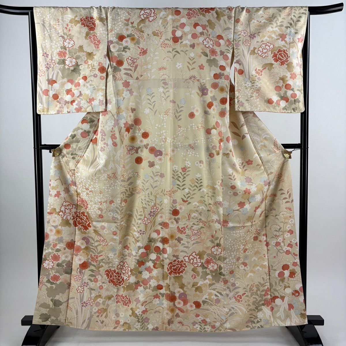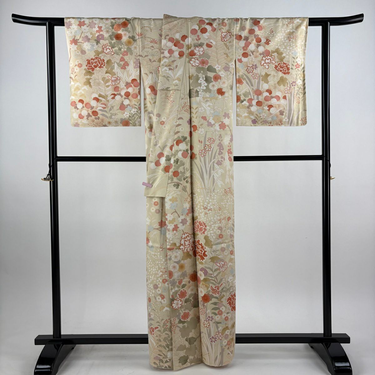 【美品】 訪問着 身丈161.5cm 裄丈66cm M 袷 牡丹 草花 金糸 金彩 ベージュ 正絹 逸品
