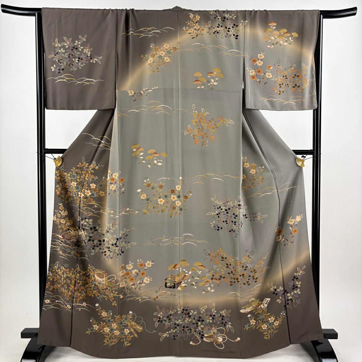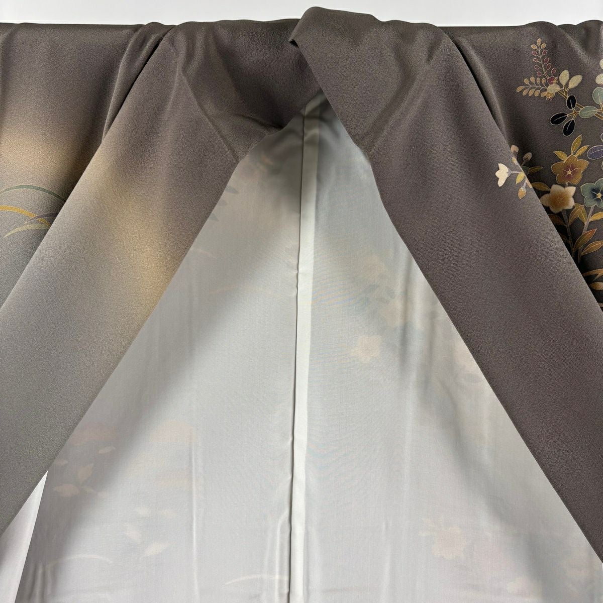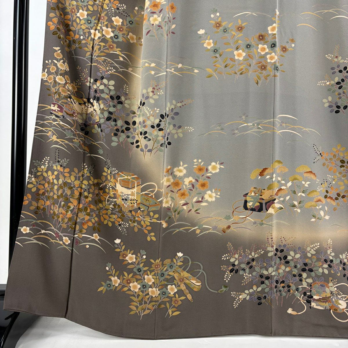 訪問着 身丈164cm 裄丈67.5cm L 袷 田村哲彦 落款あり 文箱 秋草 ぼかし 灰茶 正絹 逸品