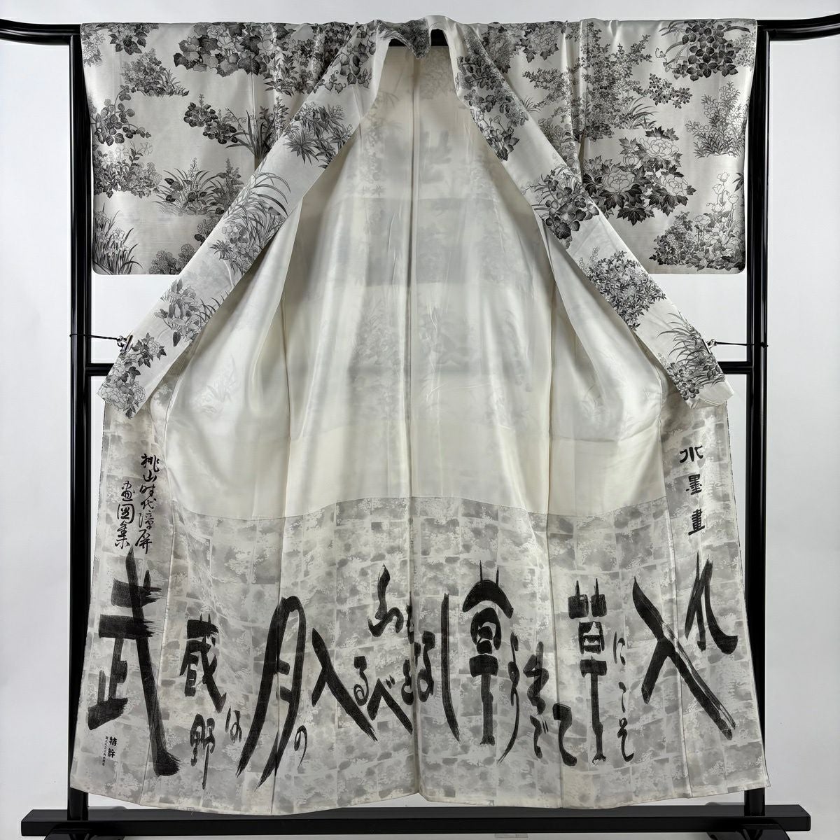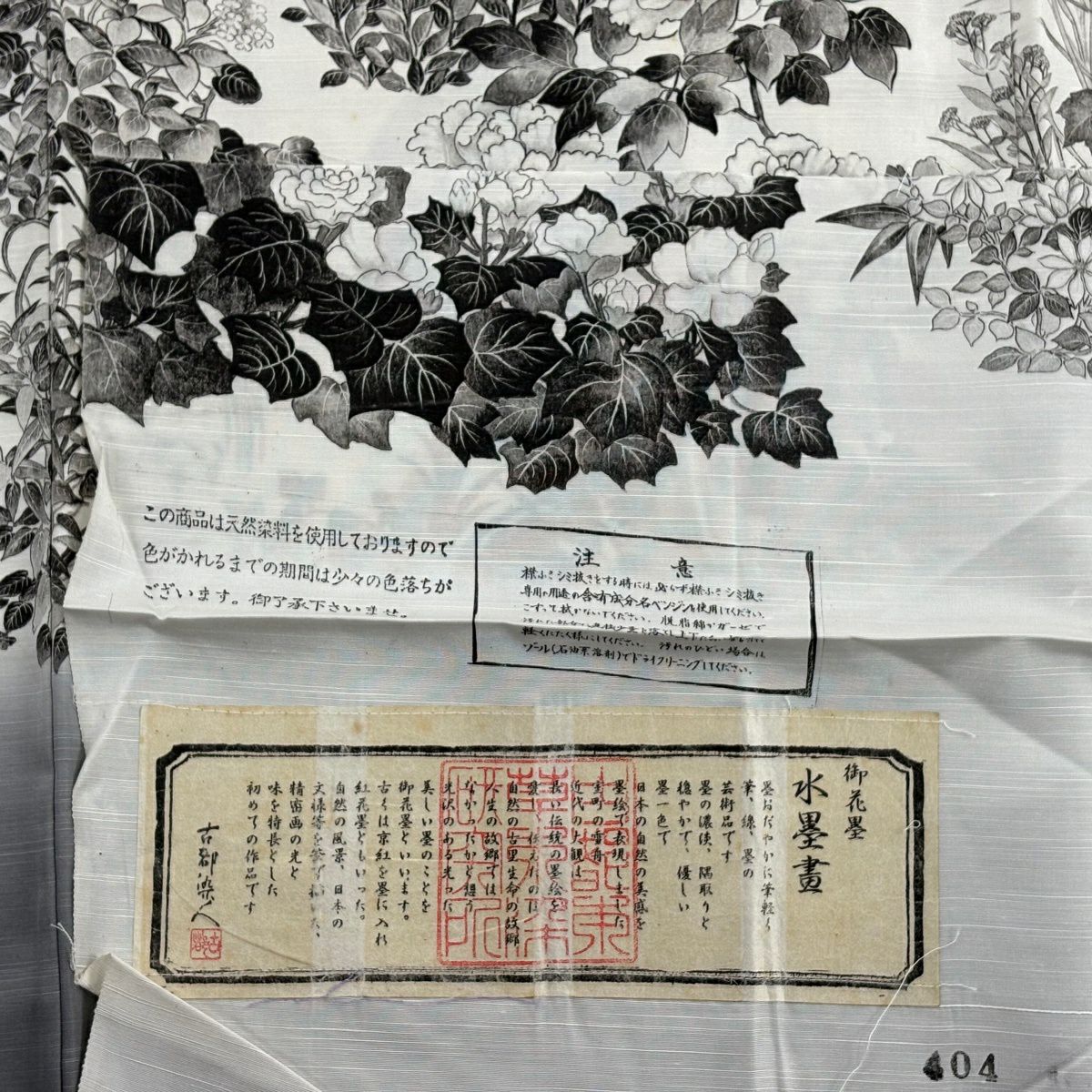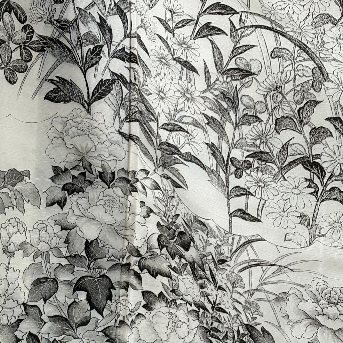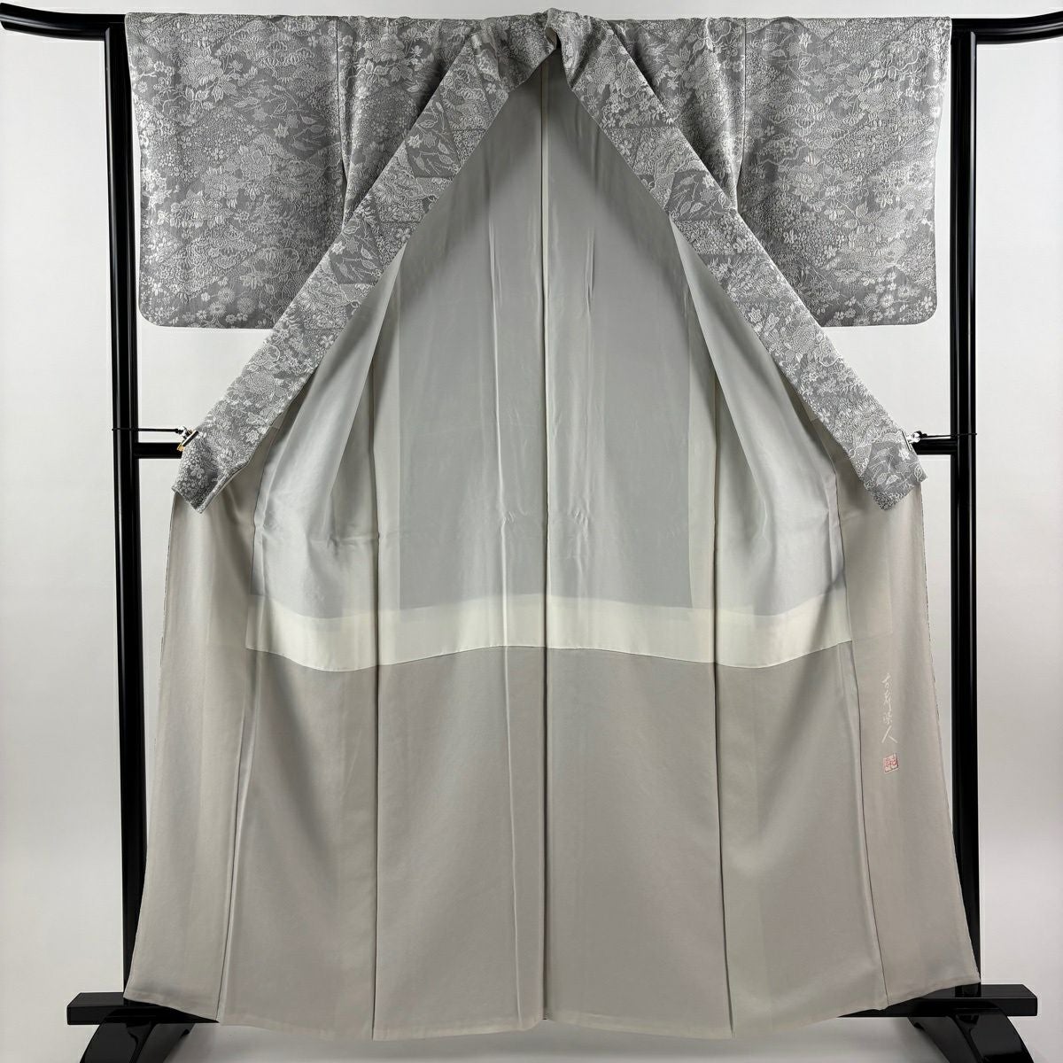 訪問着 身丈153.5cm 裄丈66cm M 袷 山岡古都 落款あり 証紙あり 草花 牡丹 灰白 正絹 逸品