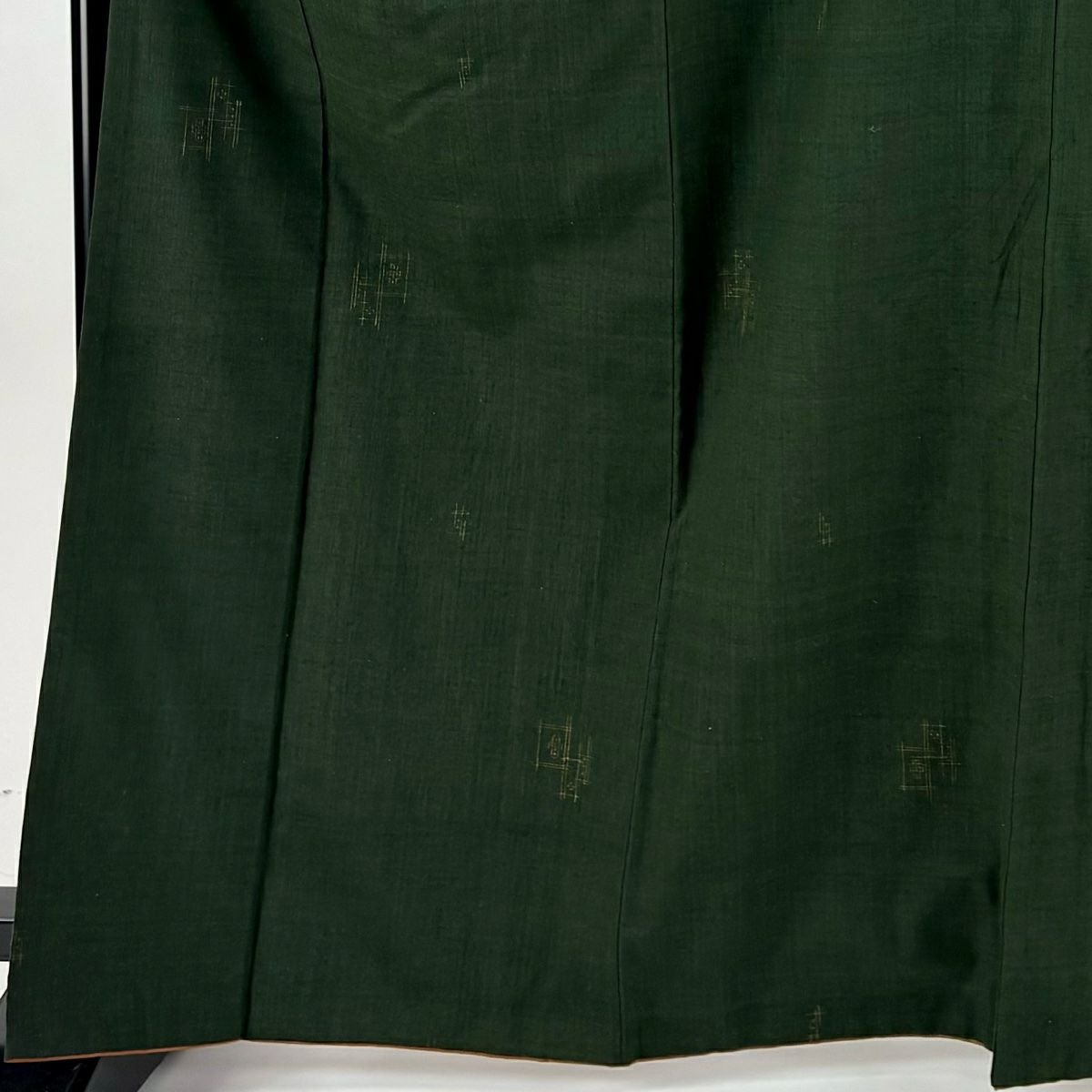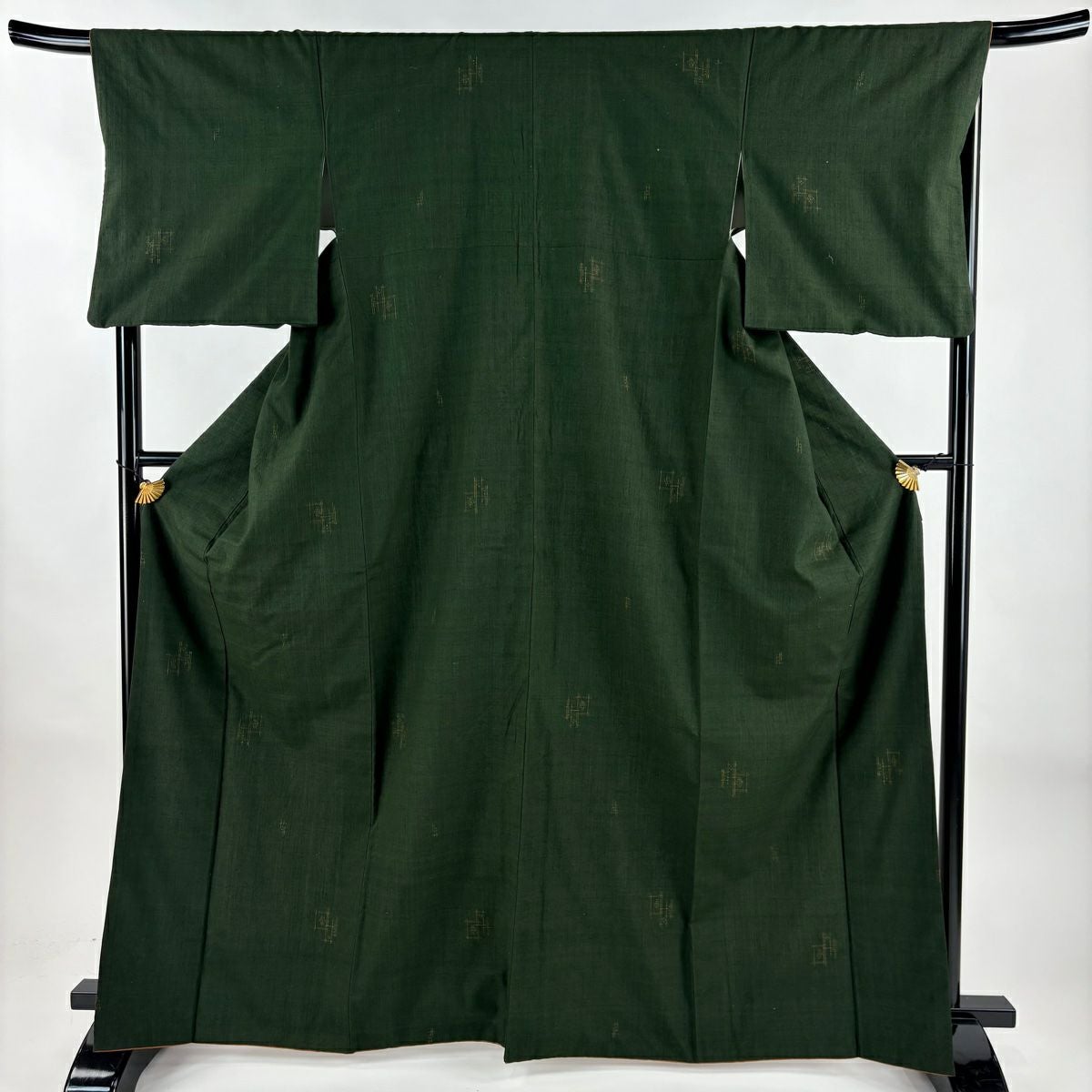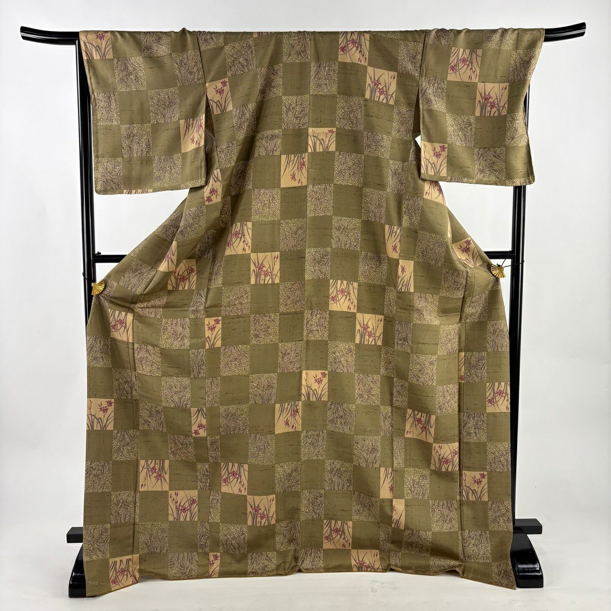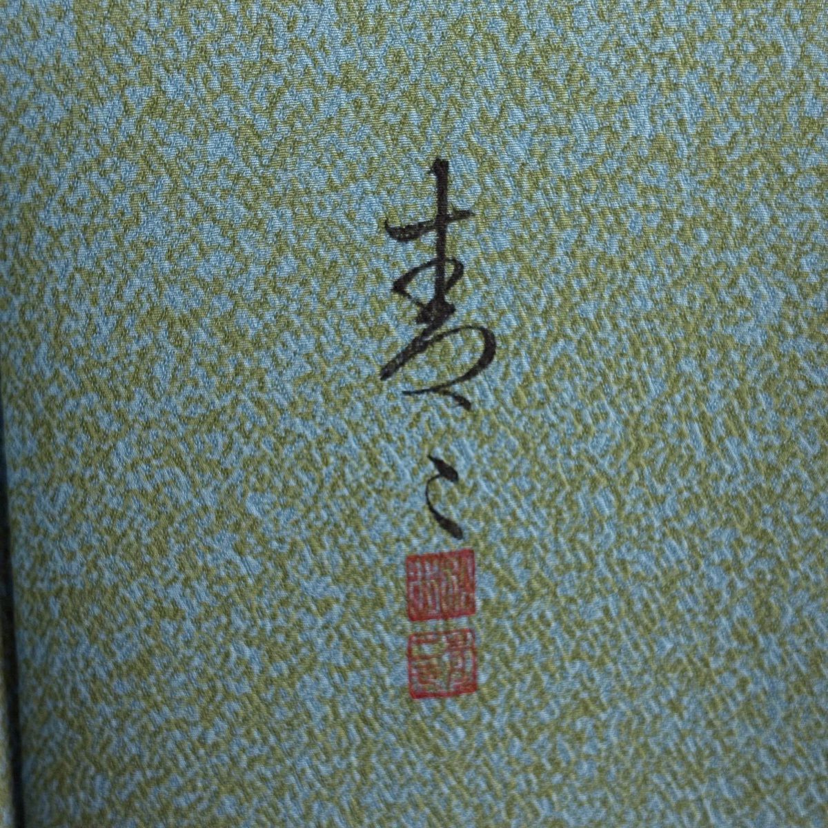 【美品】 小紋 身丈176.5cm 裄丈69.5cm L 袷 紬地 落款あり 市松 勿忘草 茶緑色 正絹 逸品
