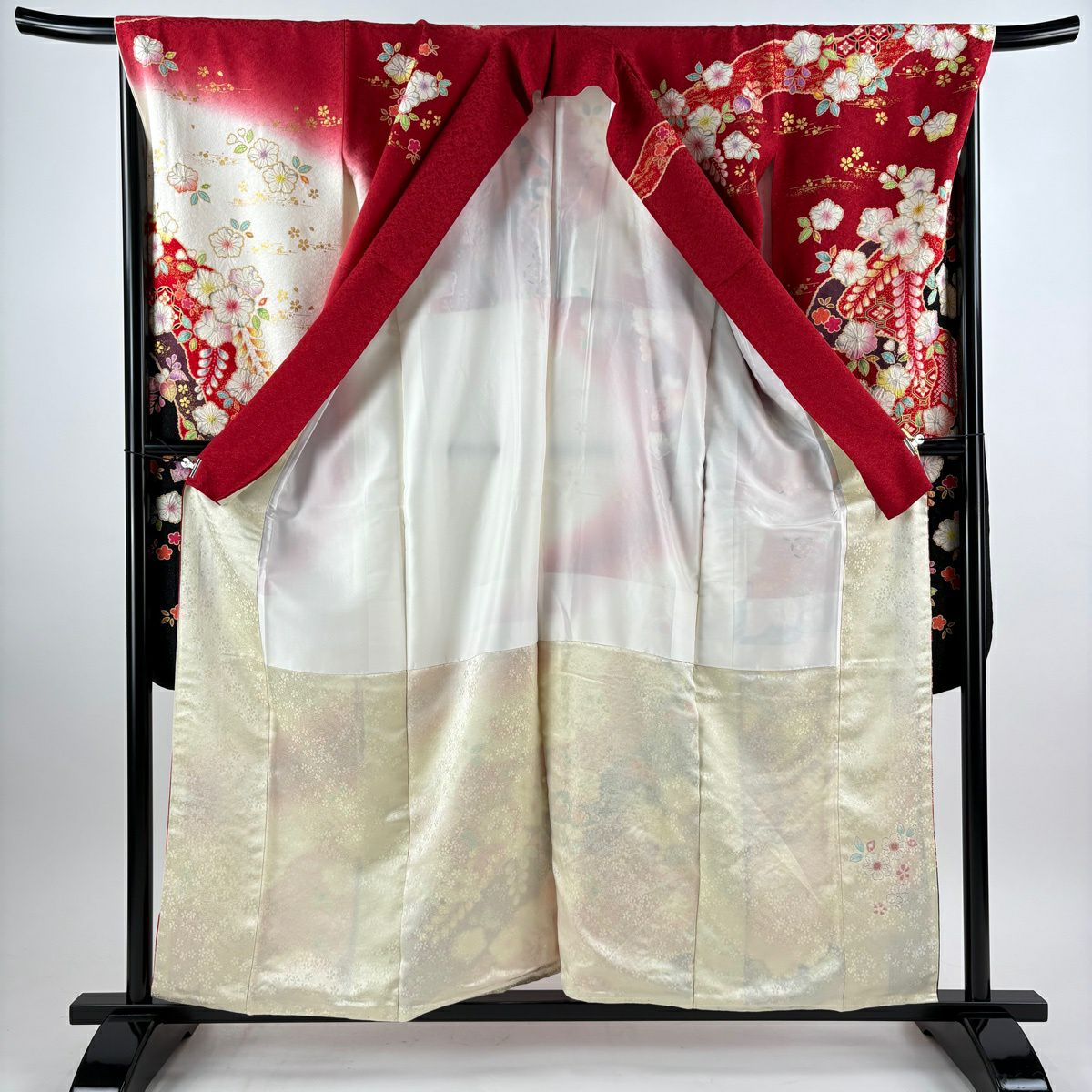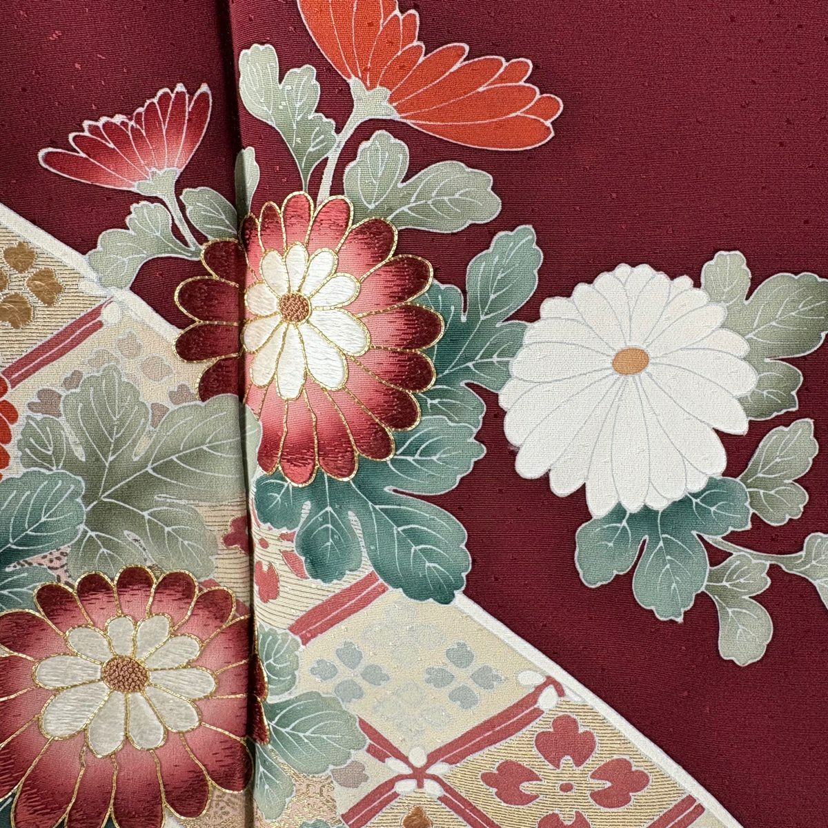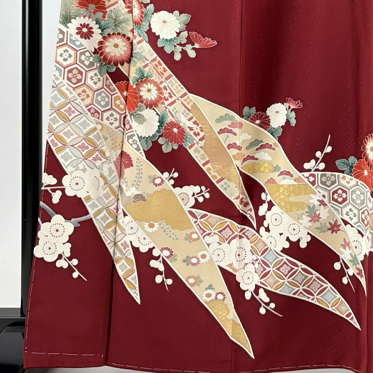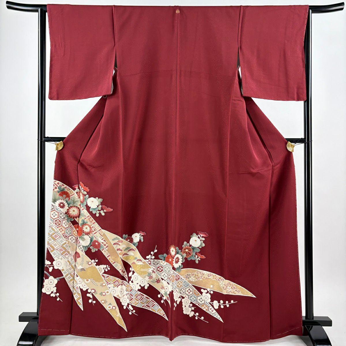 色留袖 身丈166.5cm 裄丈64.5cm M 袷 千總 菊 枝梅 刺繍 金彩 えんじ色 正絹 逸品 一つ紋
