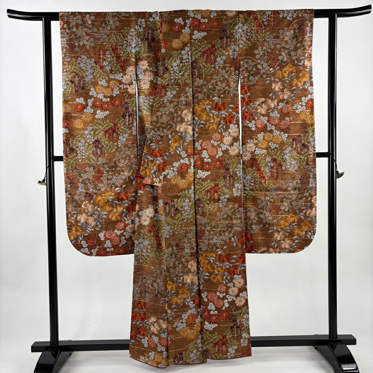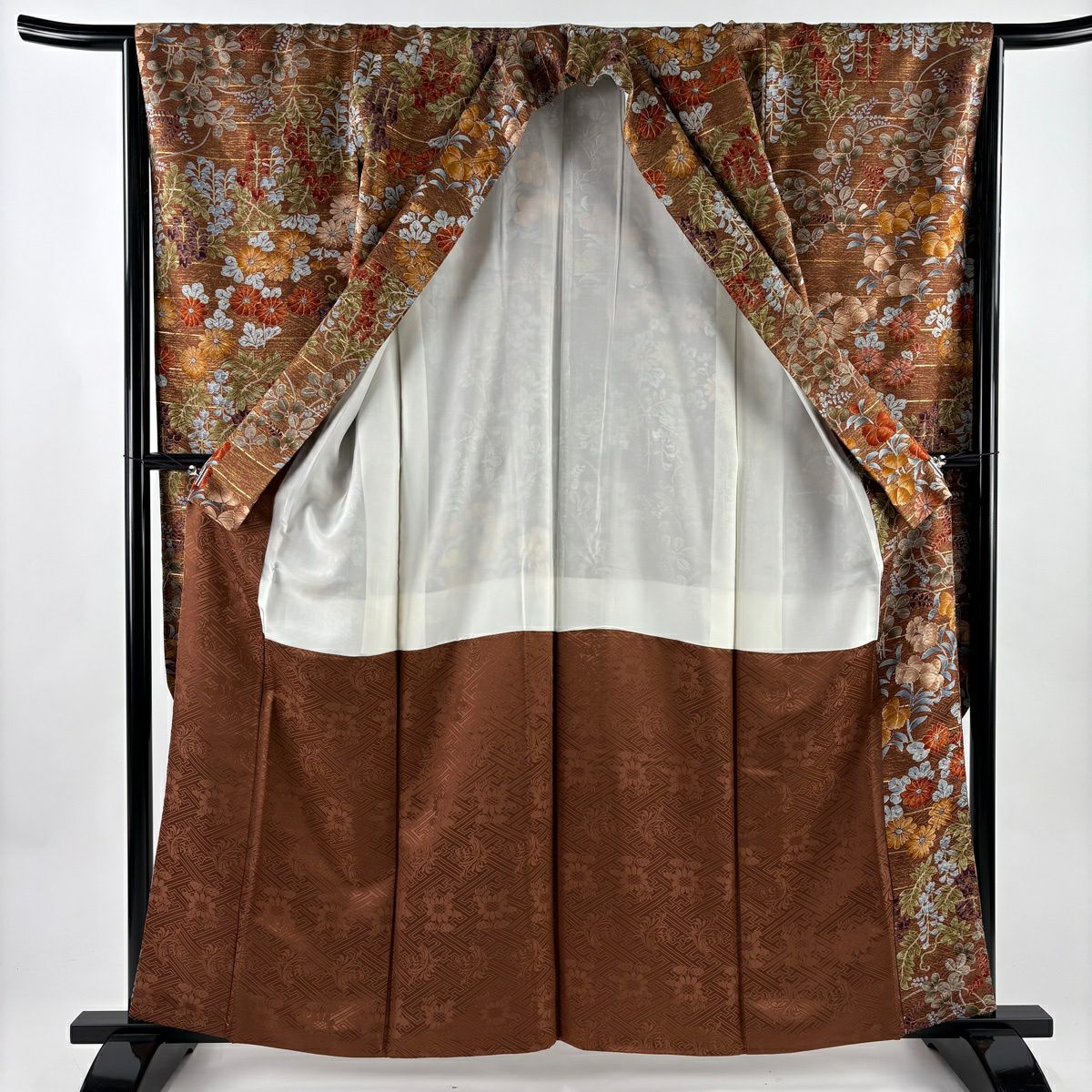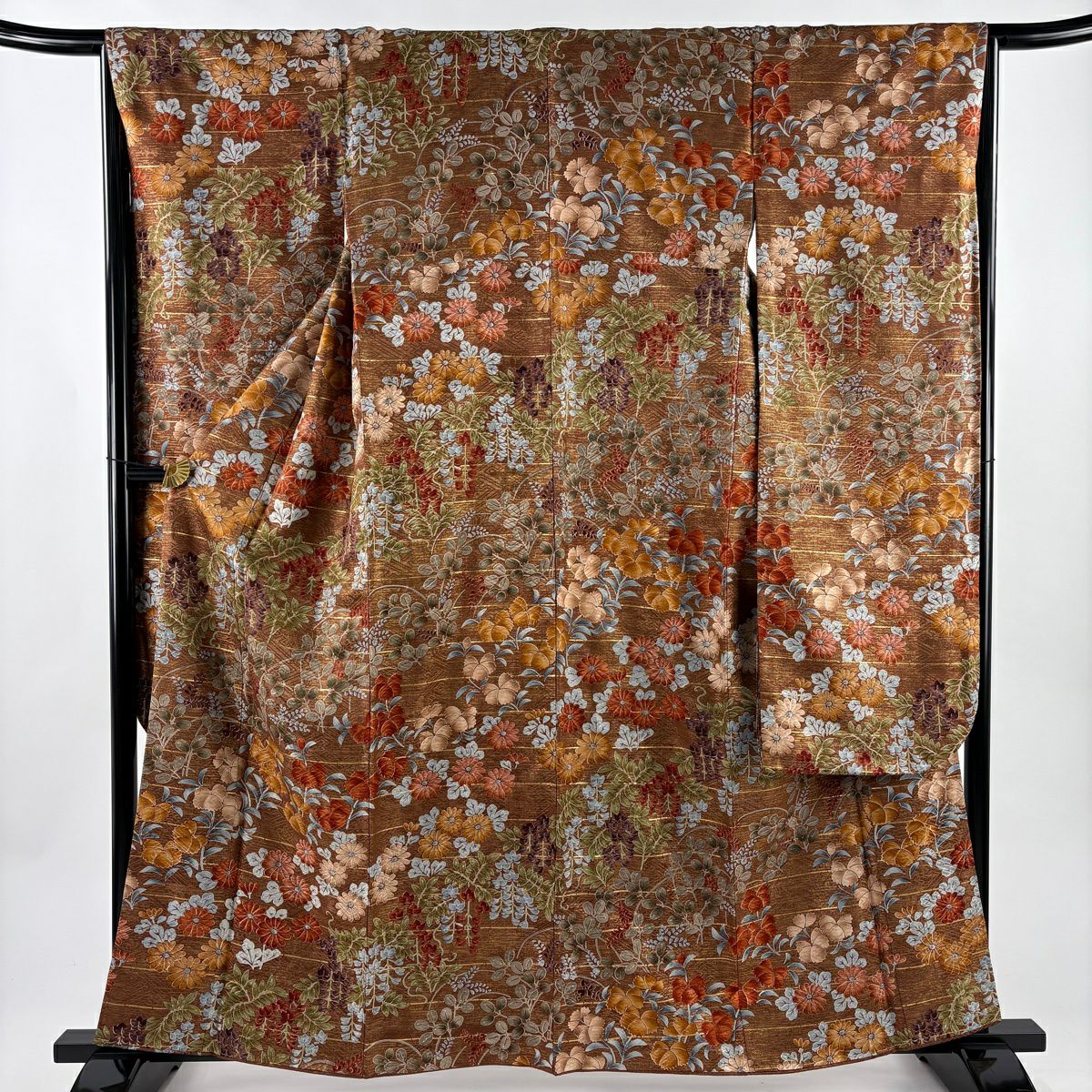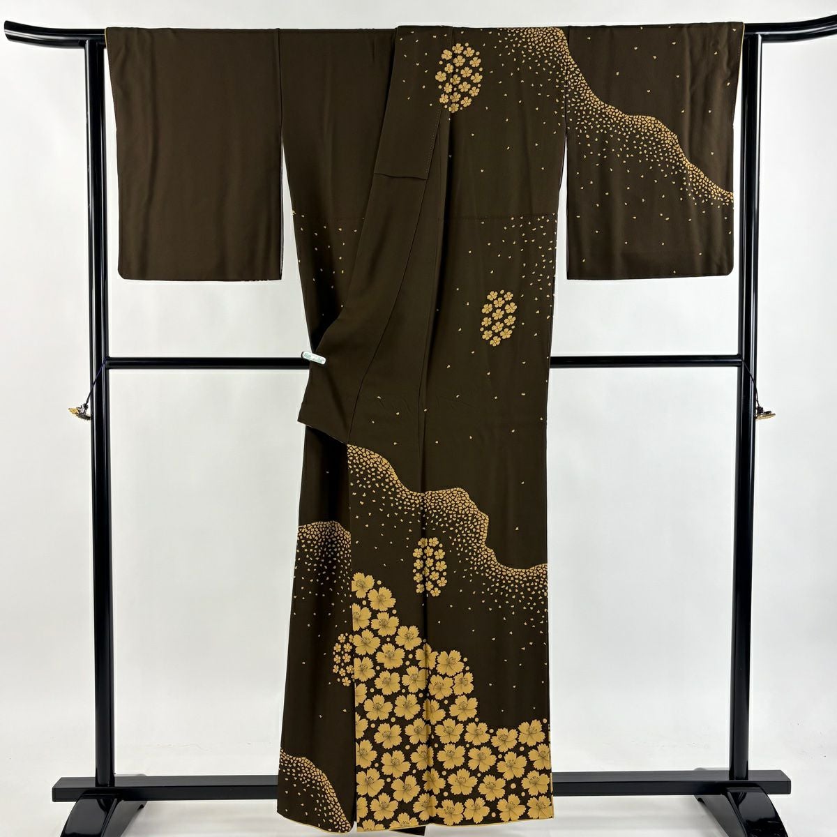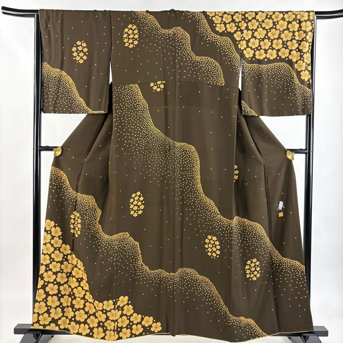 訪問着 身丈158.5cm 裄丈66cm M 袷 菅有鬼一 落款あり 花 幾何学 金彩 焦茶色 正絹 逸品