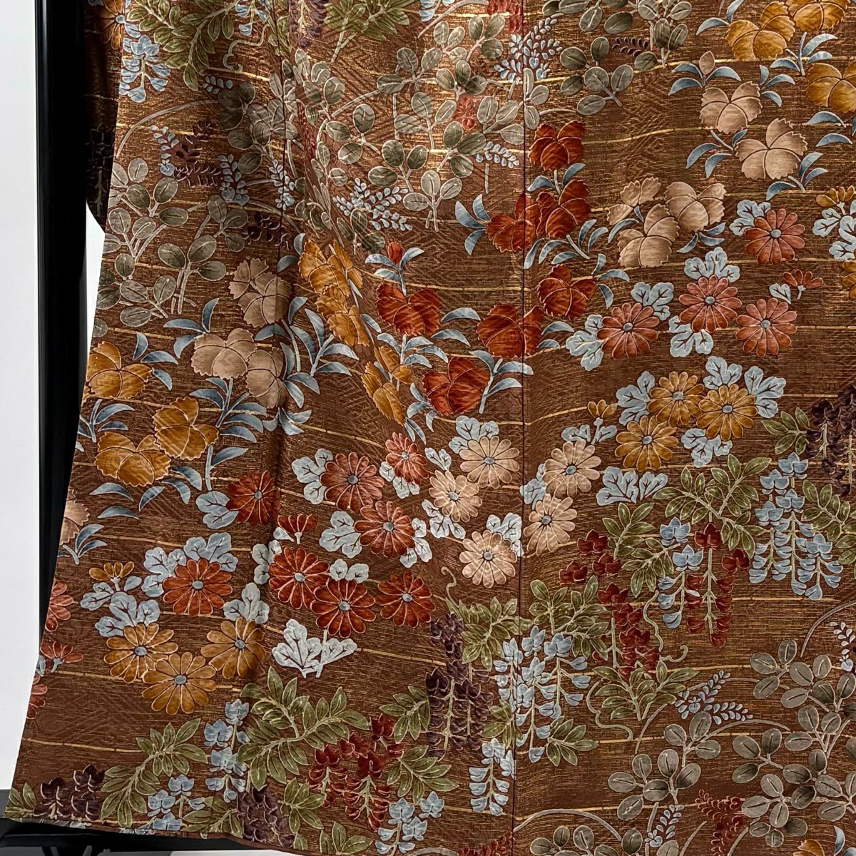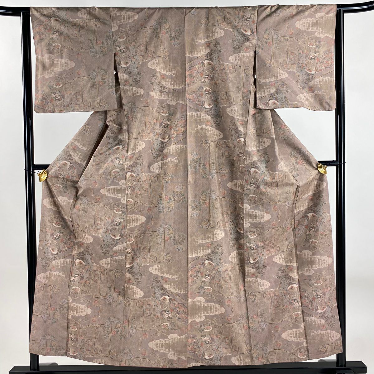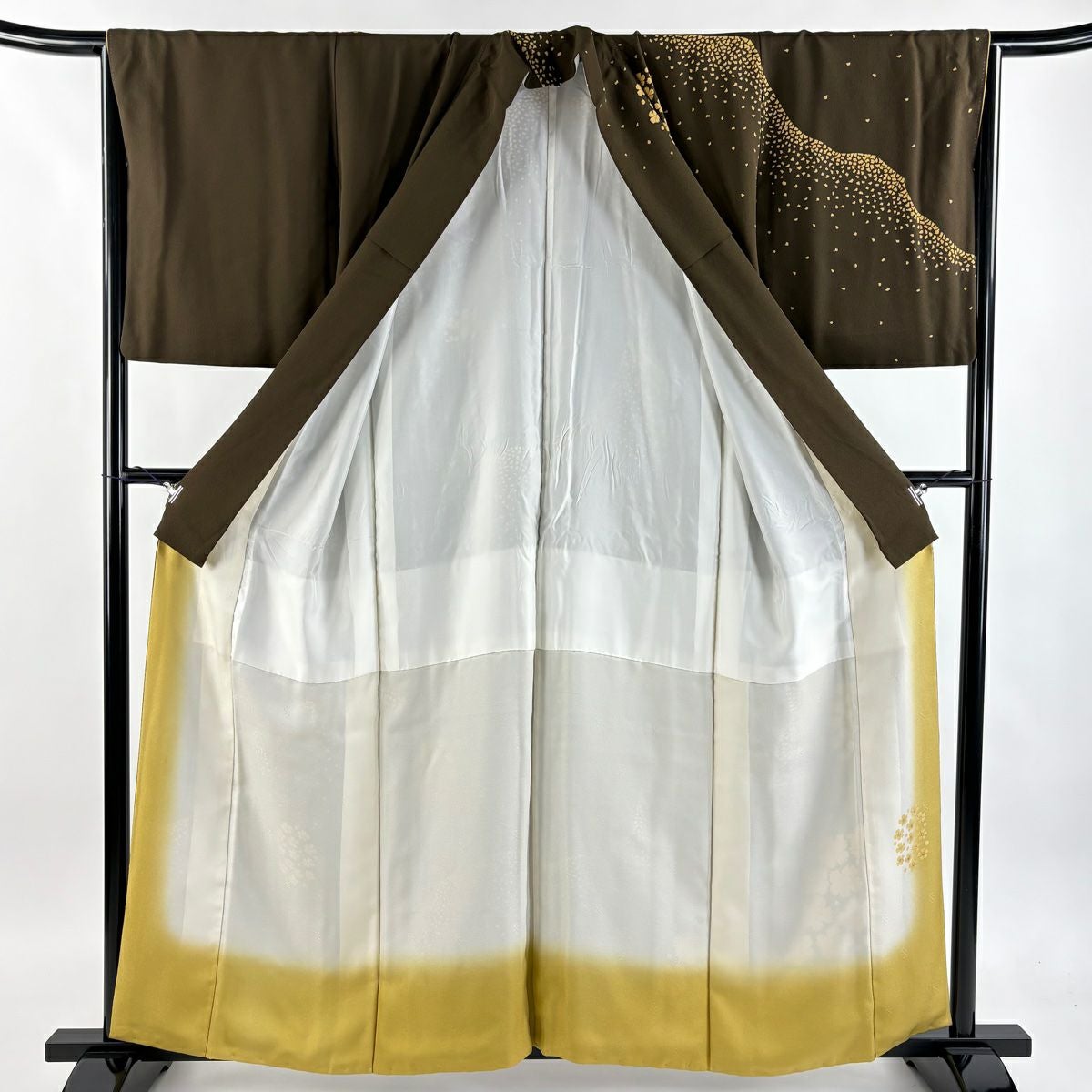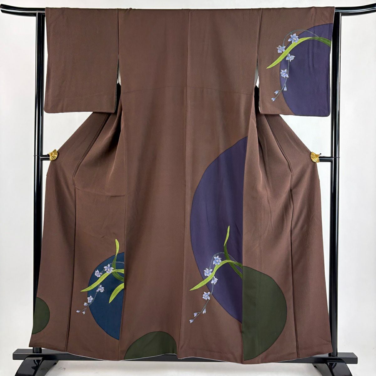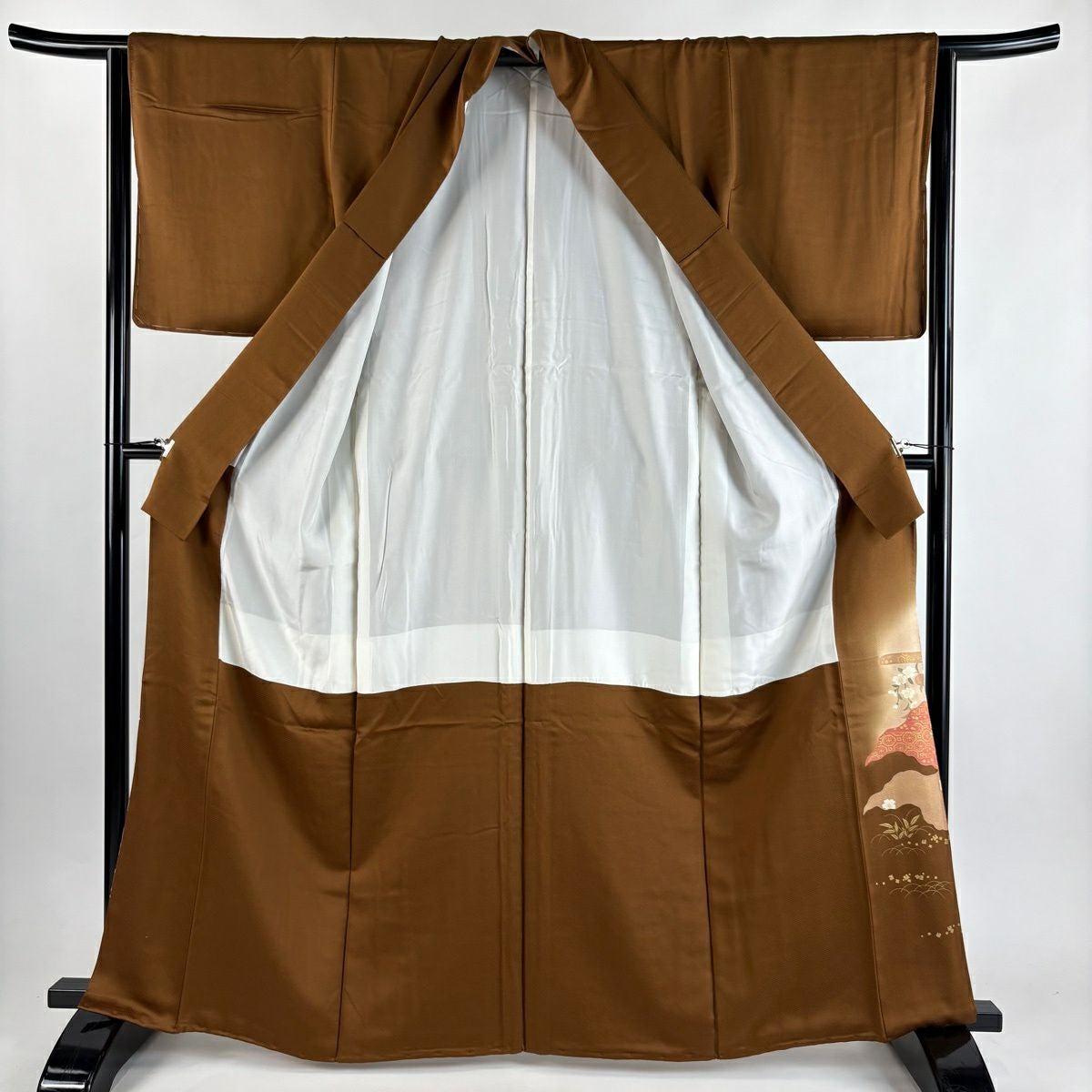 訪問着 身丈158.5cm 裄丈66cm M 袷 菅有鬼一 落款あり 花 幾何学 金彩 焦茶色 正絹 逸品