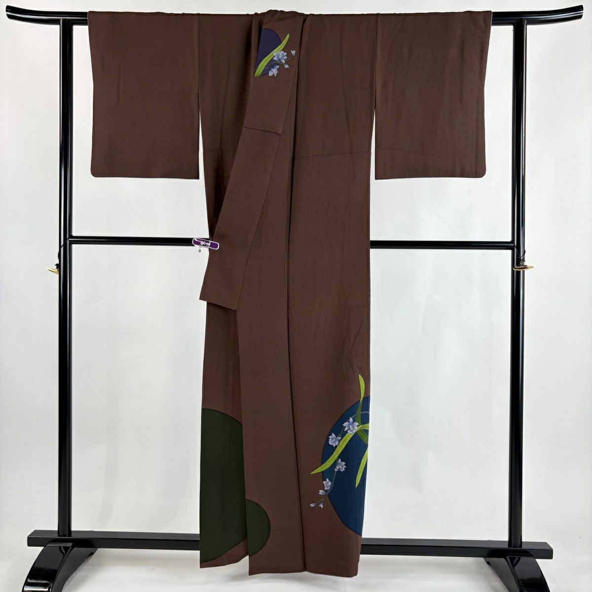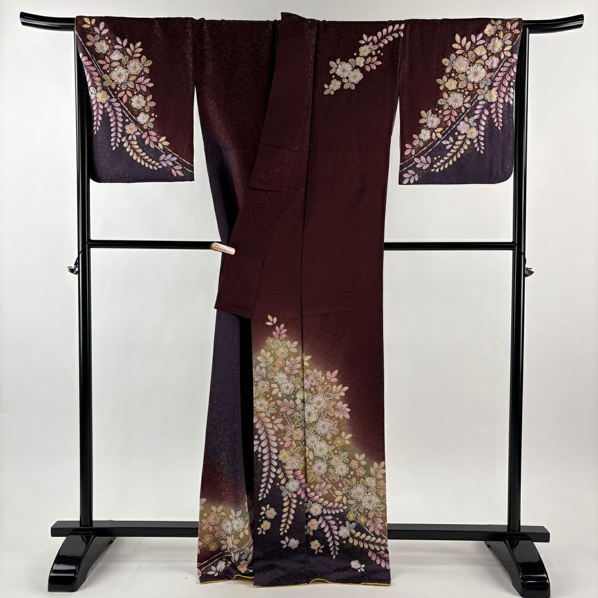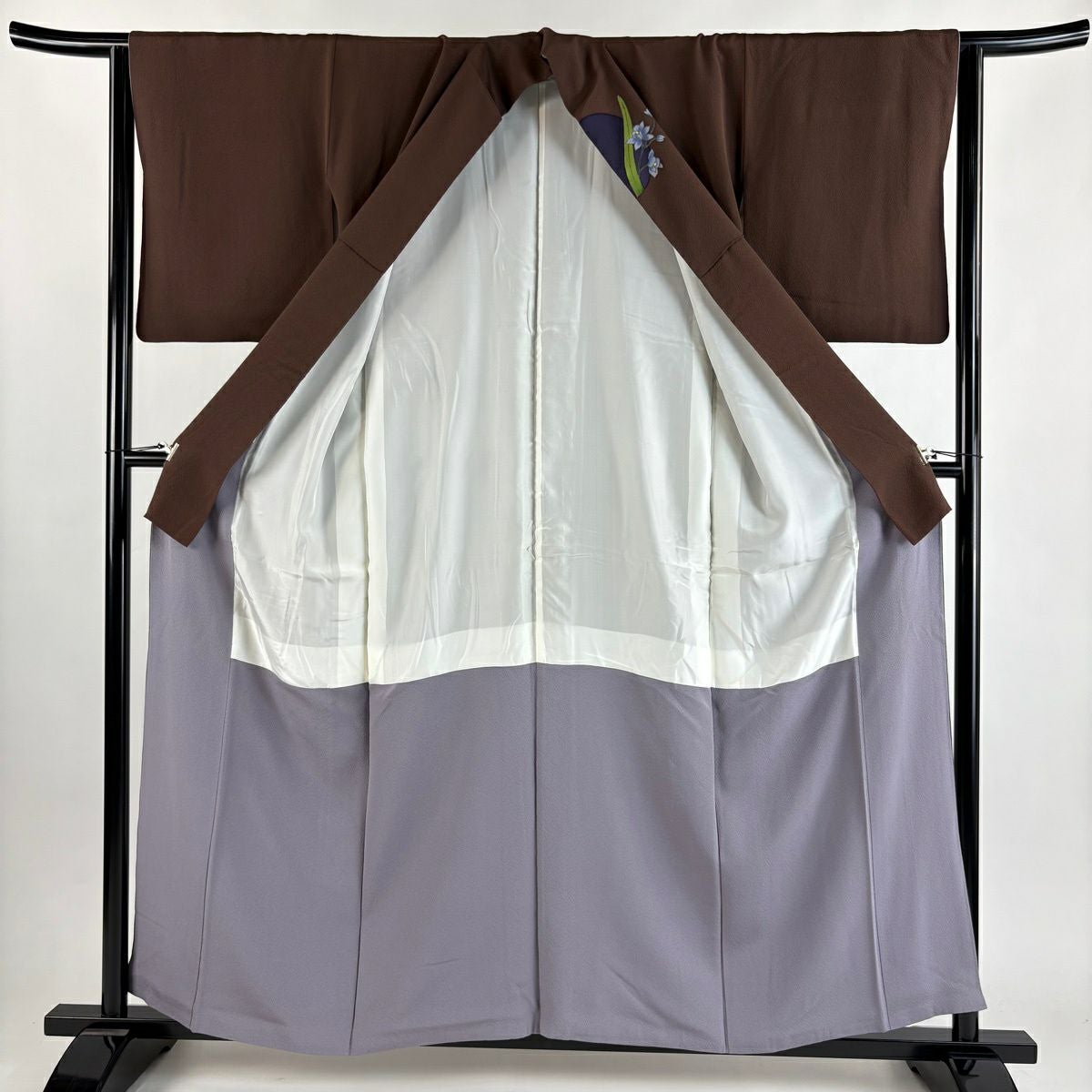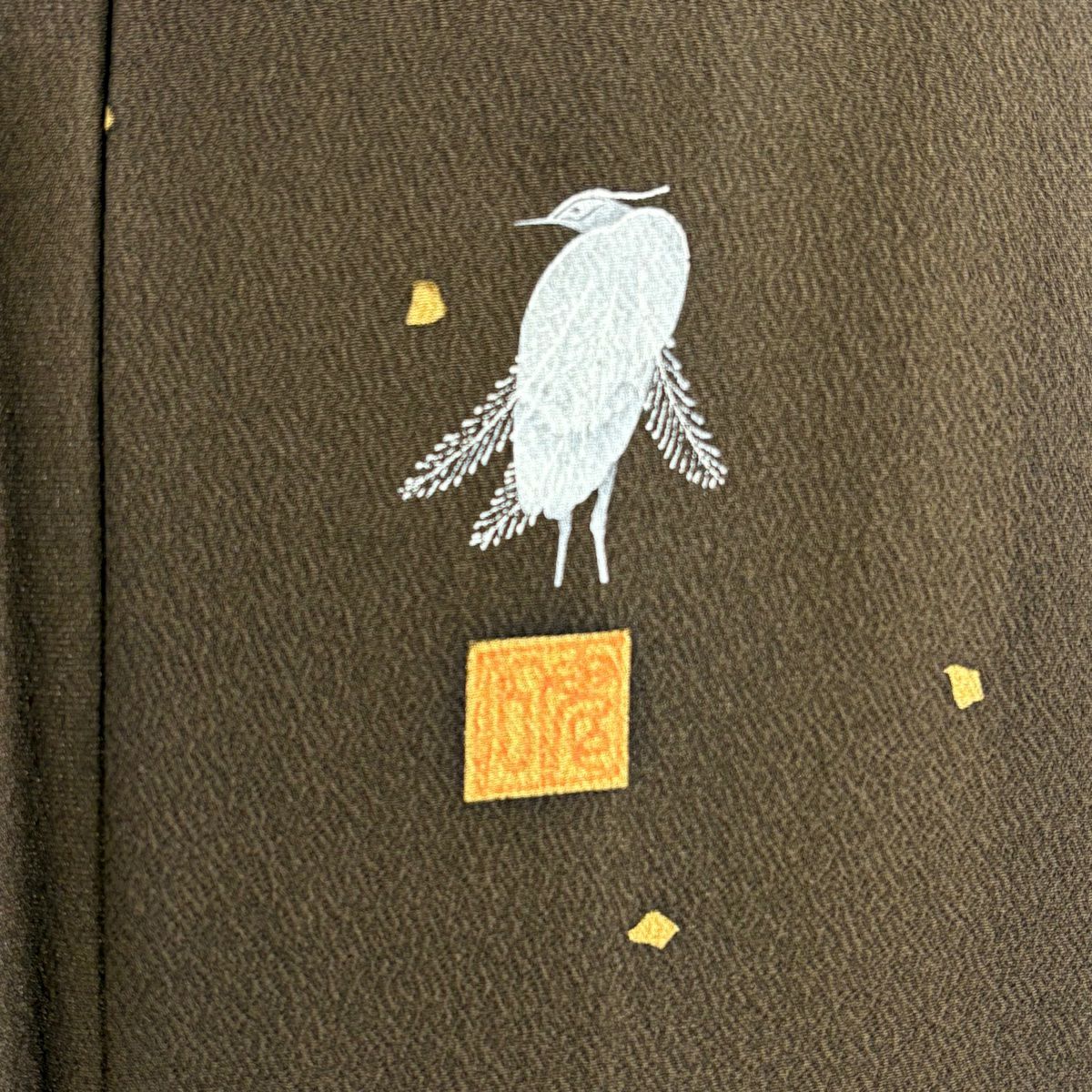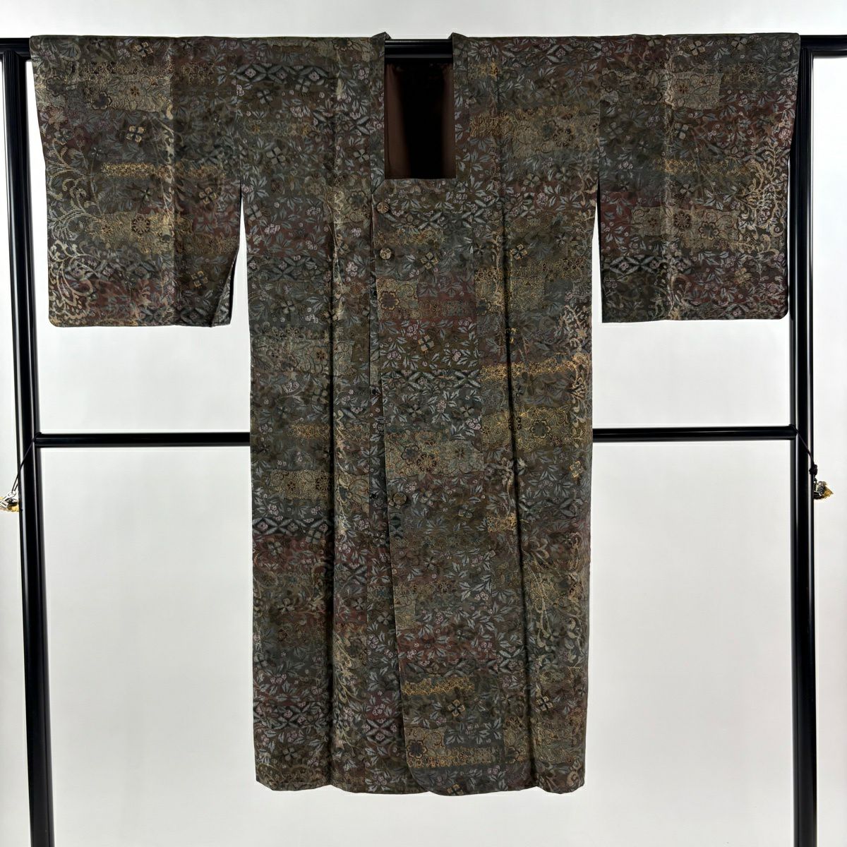 訪問着 身丈158.5cm 裄丈66cm M 袷 菅有鬼一 落款あり 花 幾何学 金彩 焦茶色 正絹 逸品