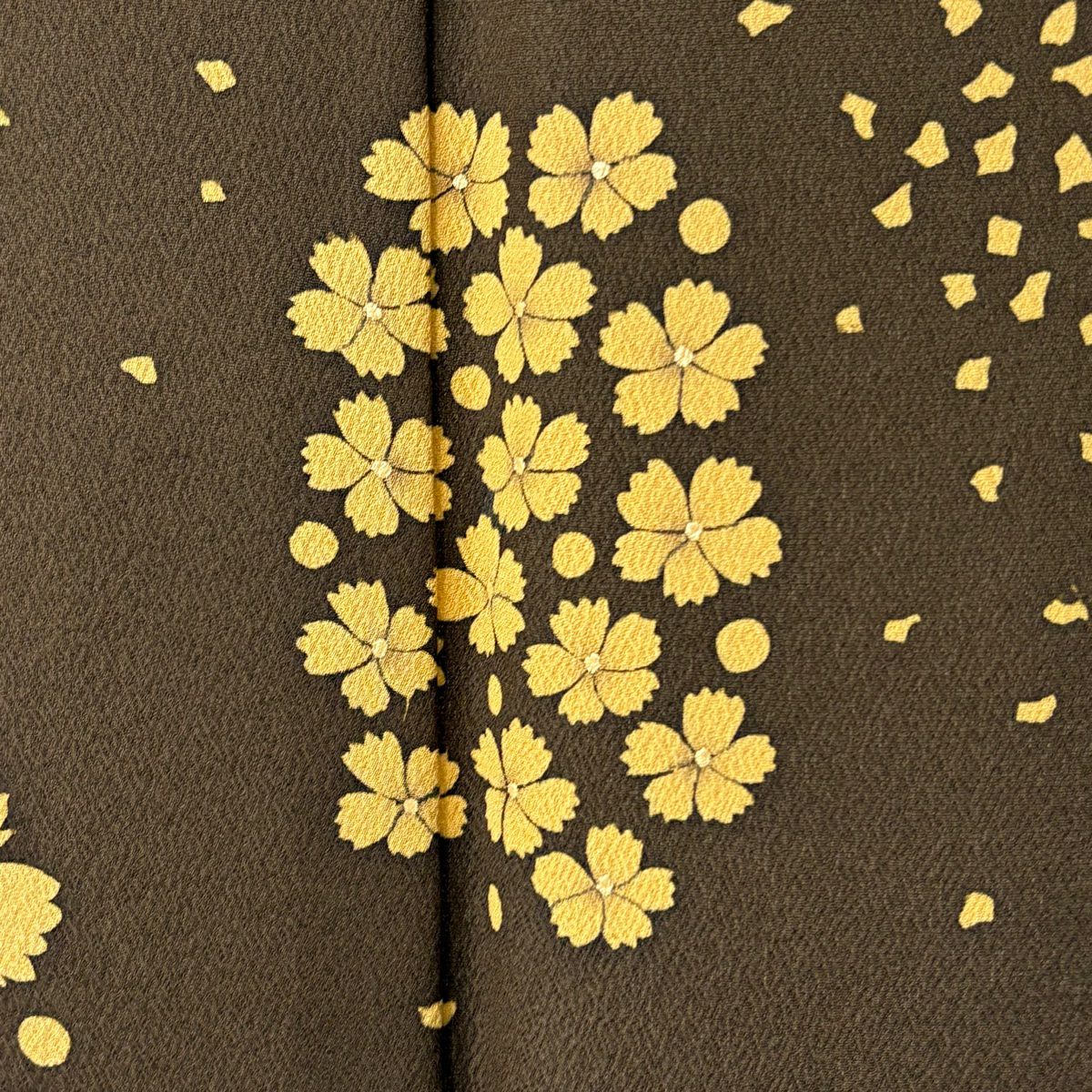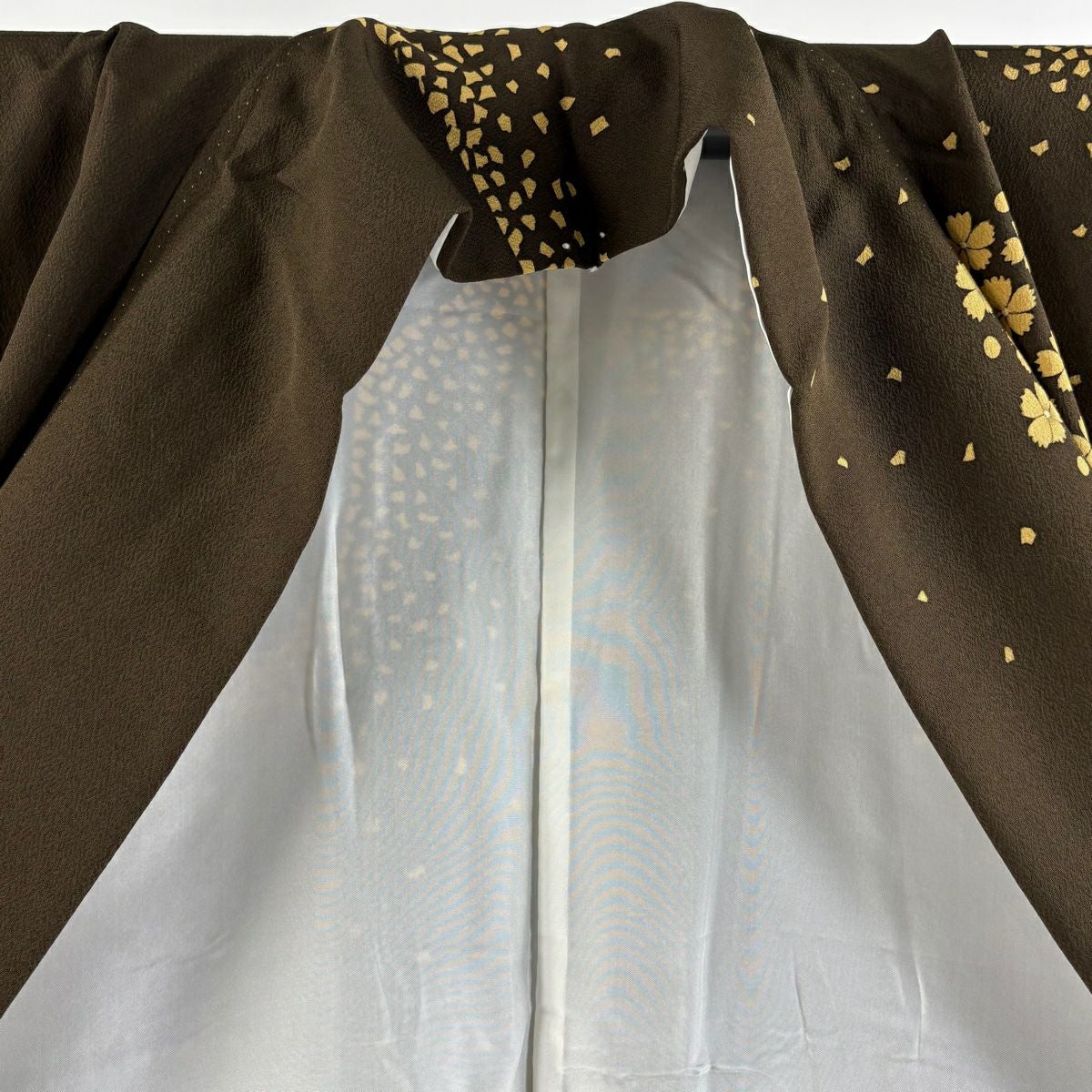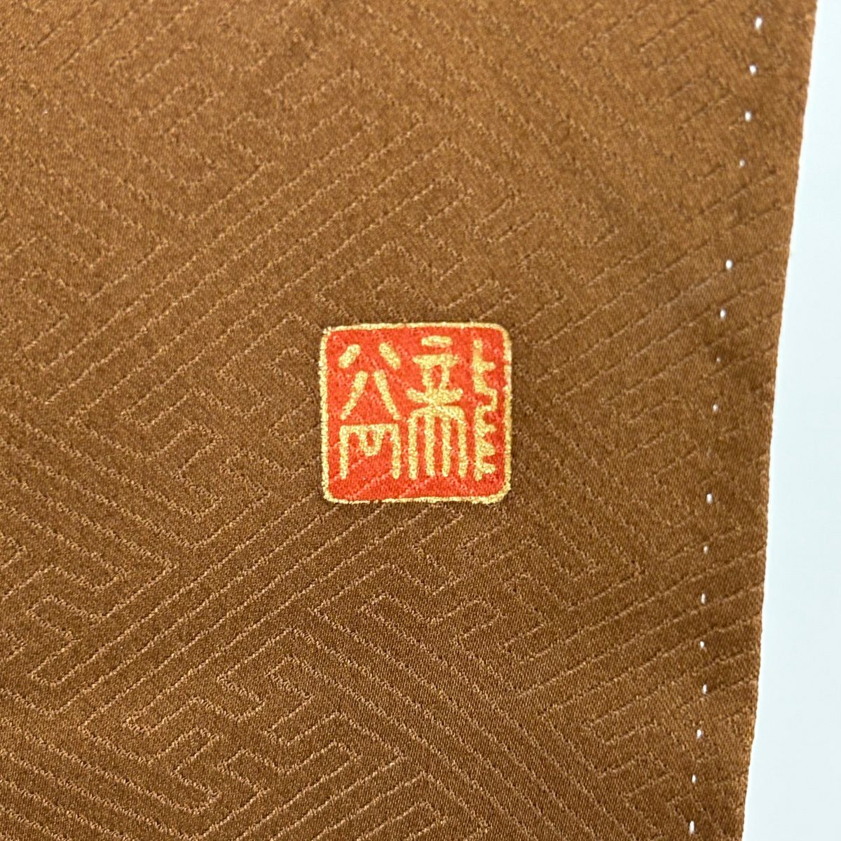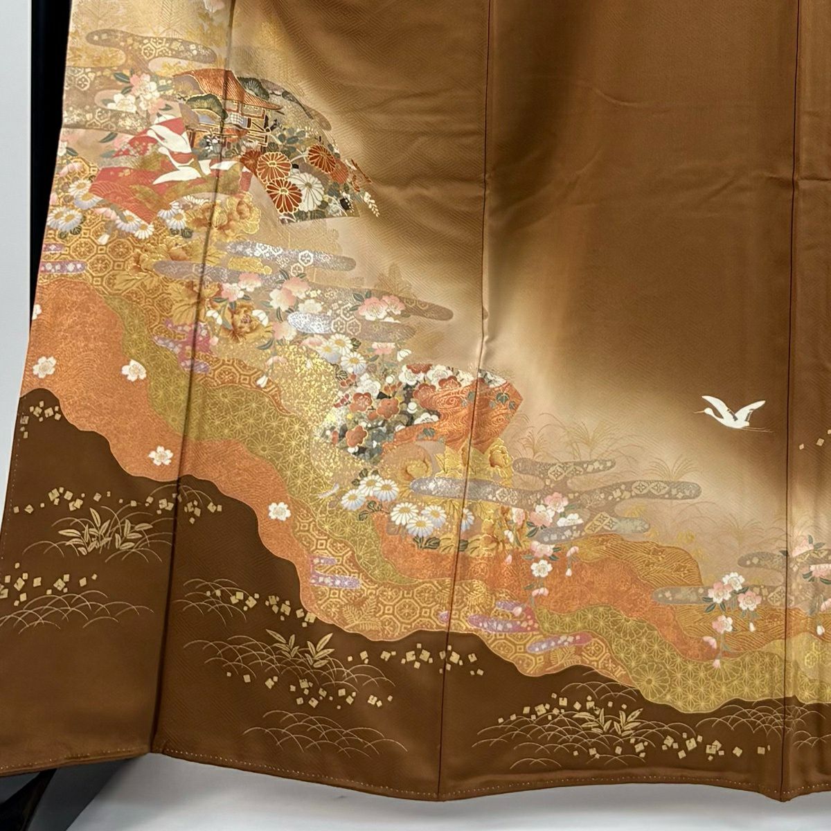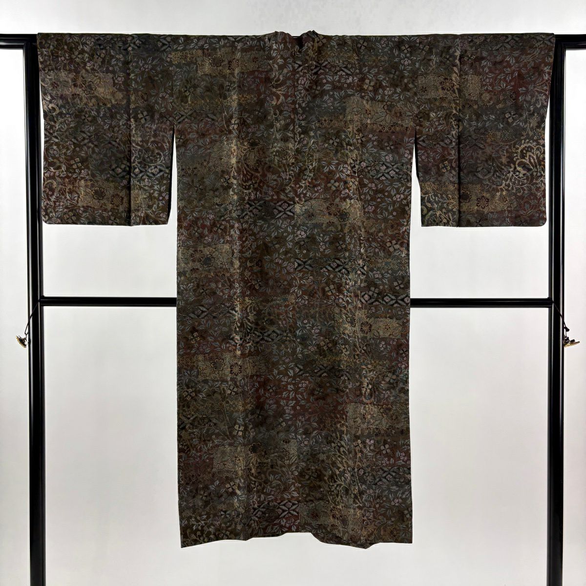 訪問着 身丈158.5cm 裄丈66cm M 袷 菅有鬼一 落款あり 花 幾何学 金彩 焦茶色 正絹 逸品