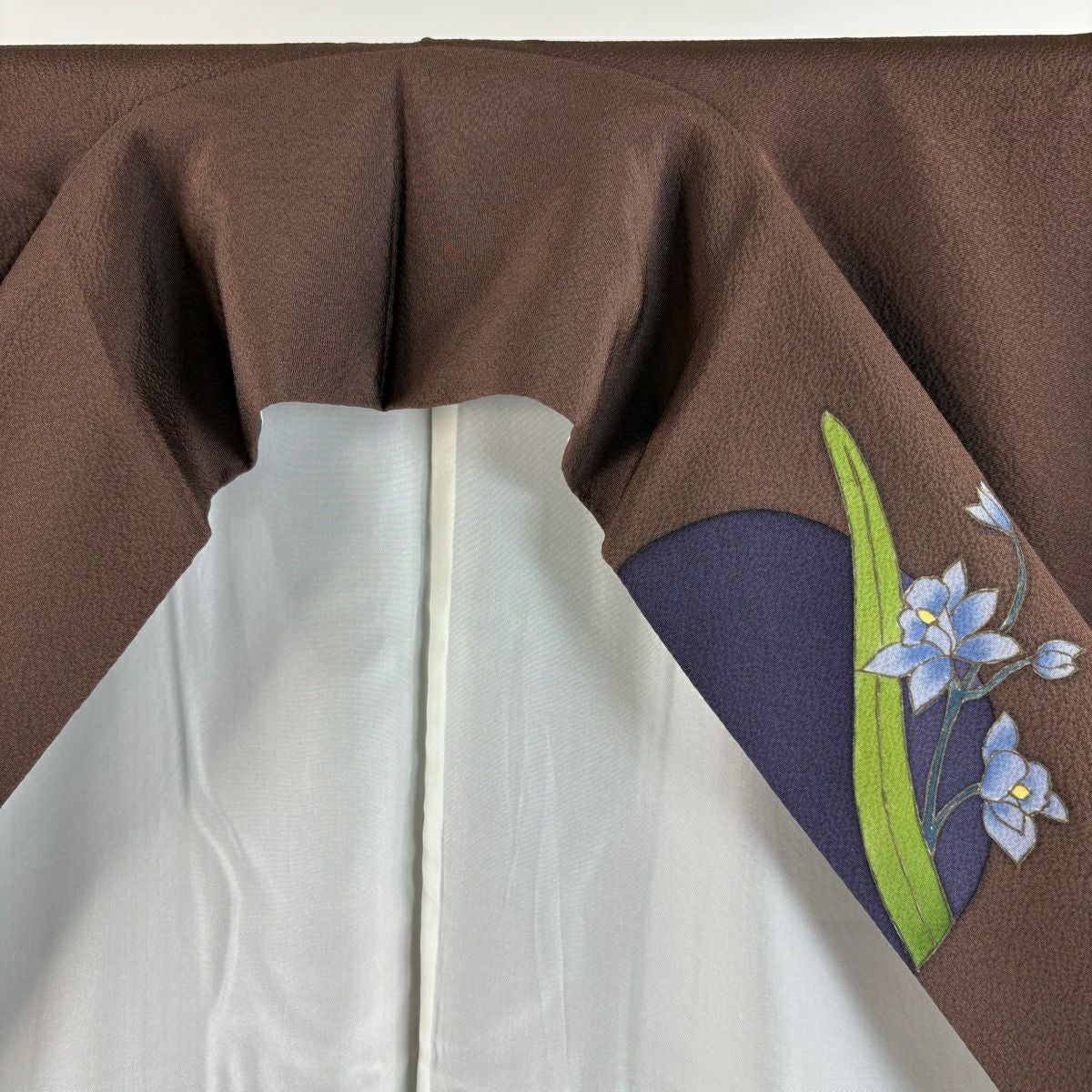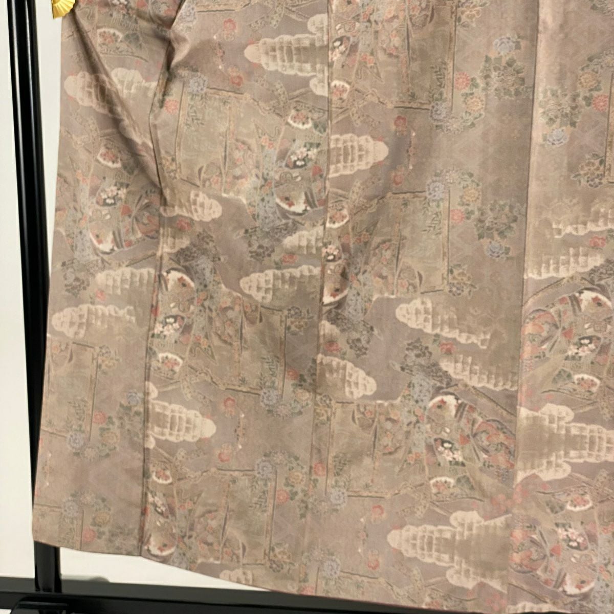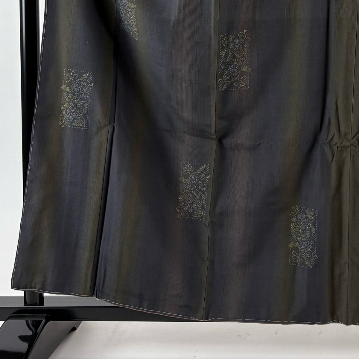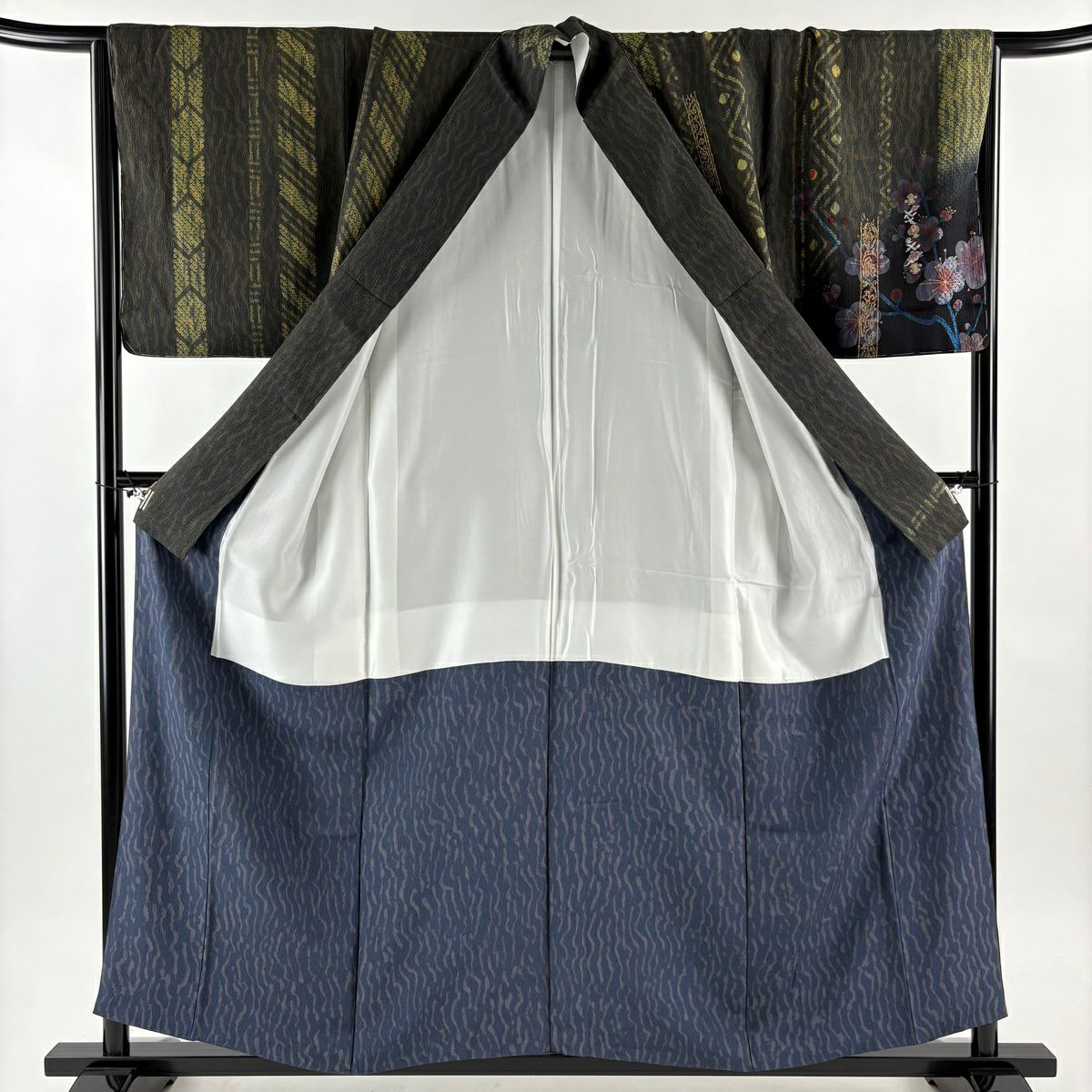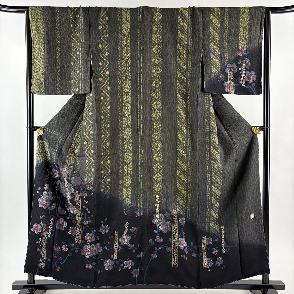 訪問着 身丈158.5cm 裄丈66cm M 袷 菅有鬼一 落款あり 花 幾何学 金彩 焦茶色 正絹 逸品