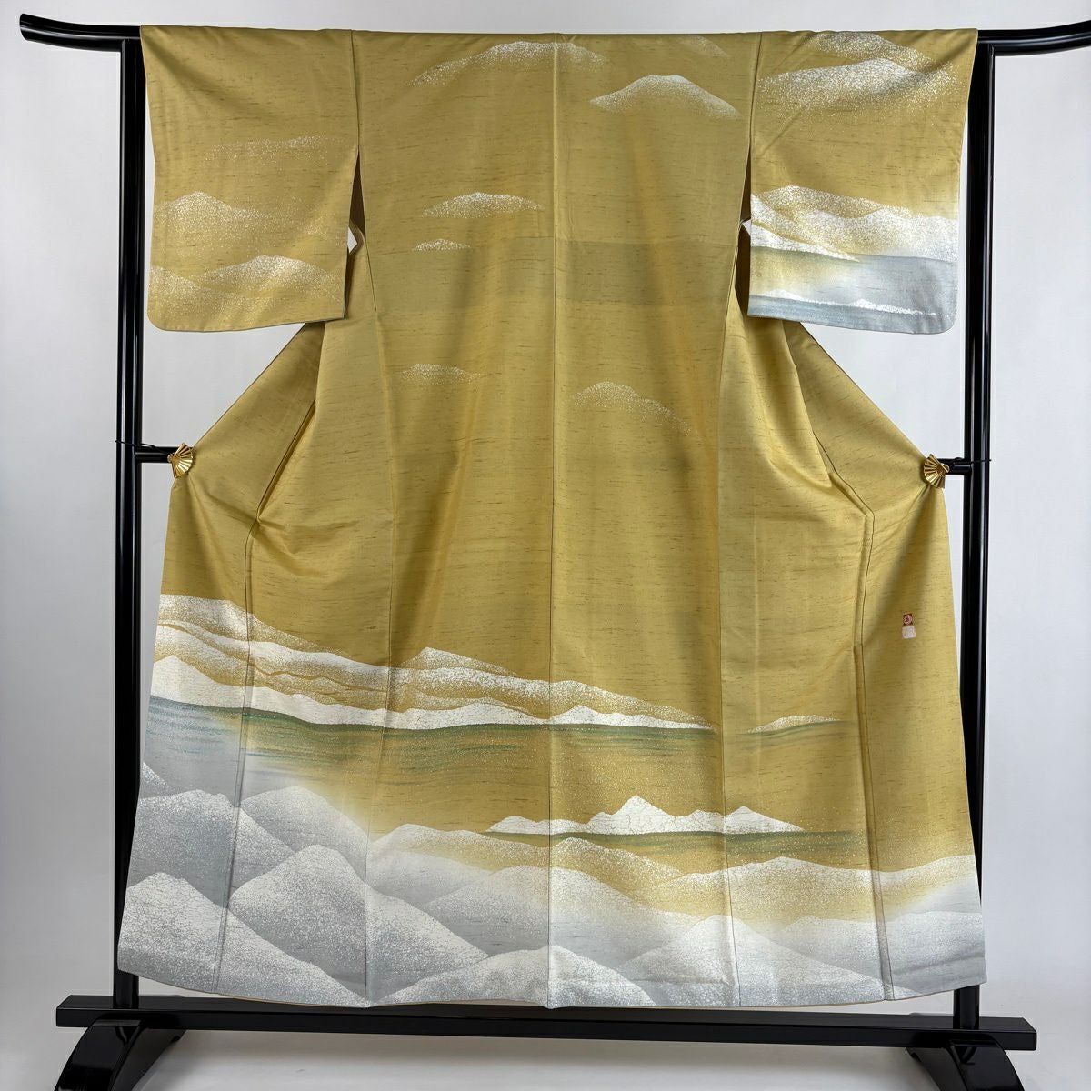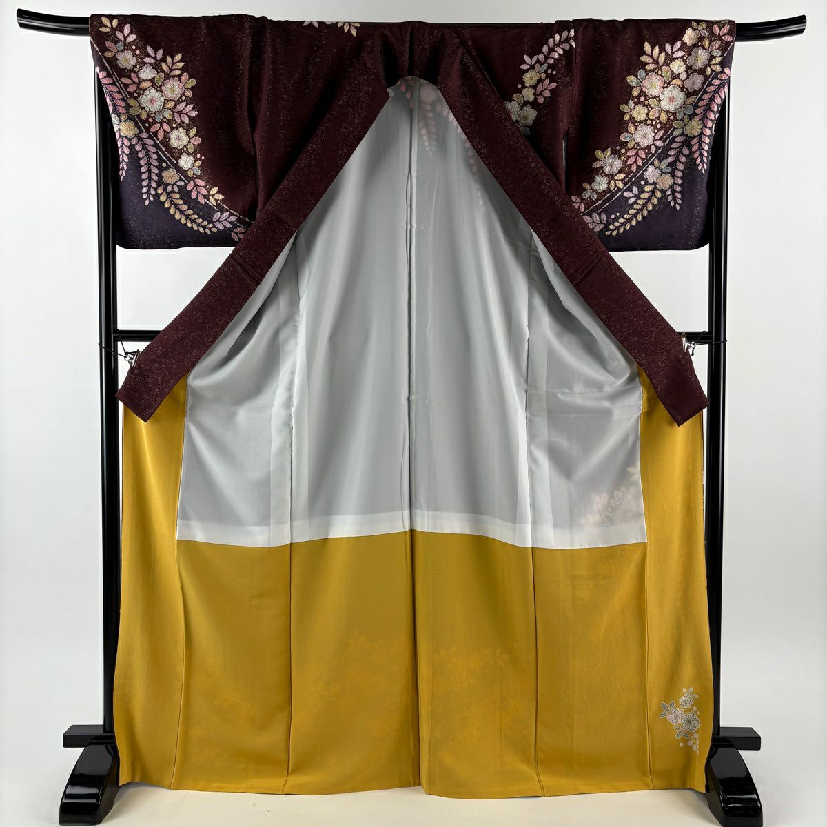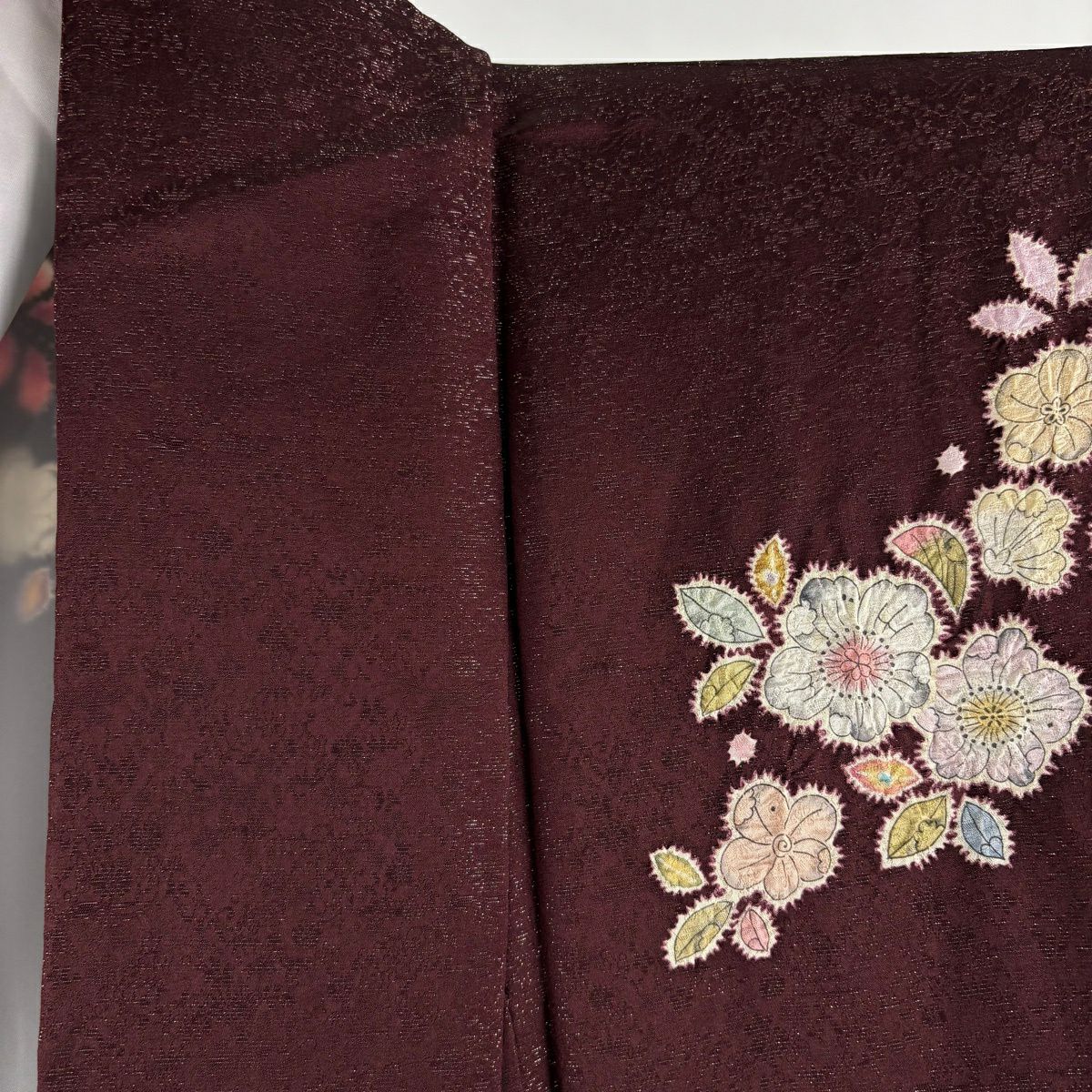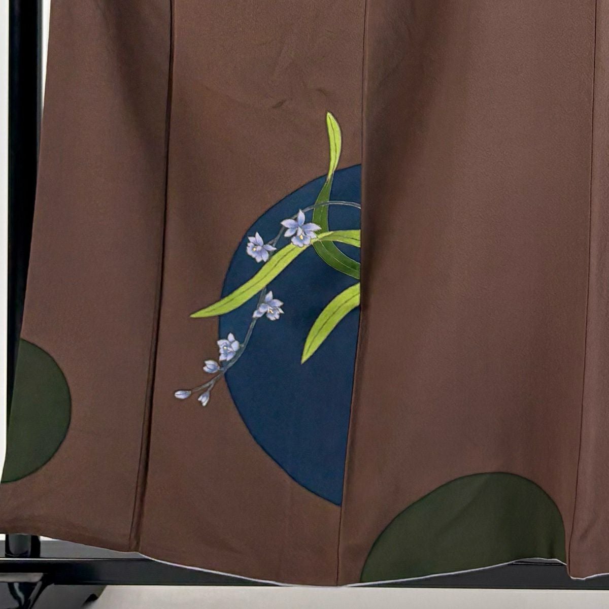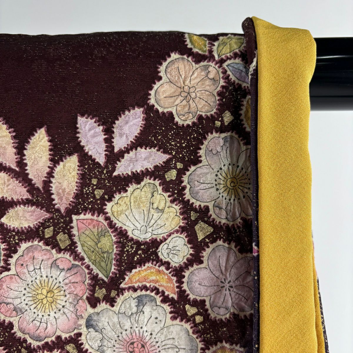 訪問着 身丈158.5cm 裄丈66cm M 袷 菅有鬼一 落款あり 花 幾何学 金彩 焦茶色 正絹 逸品