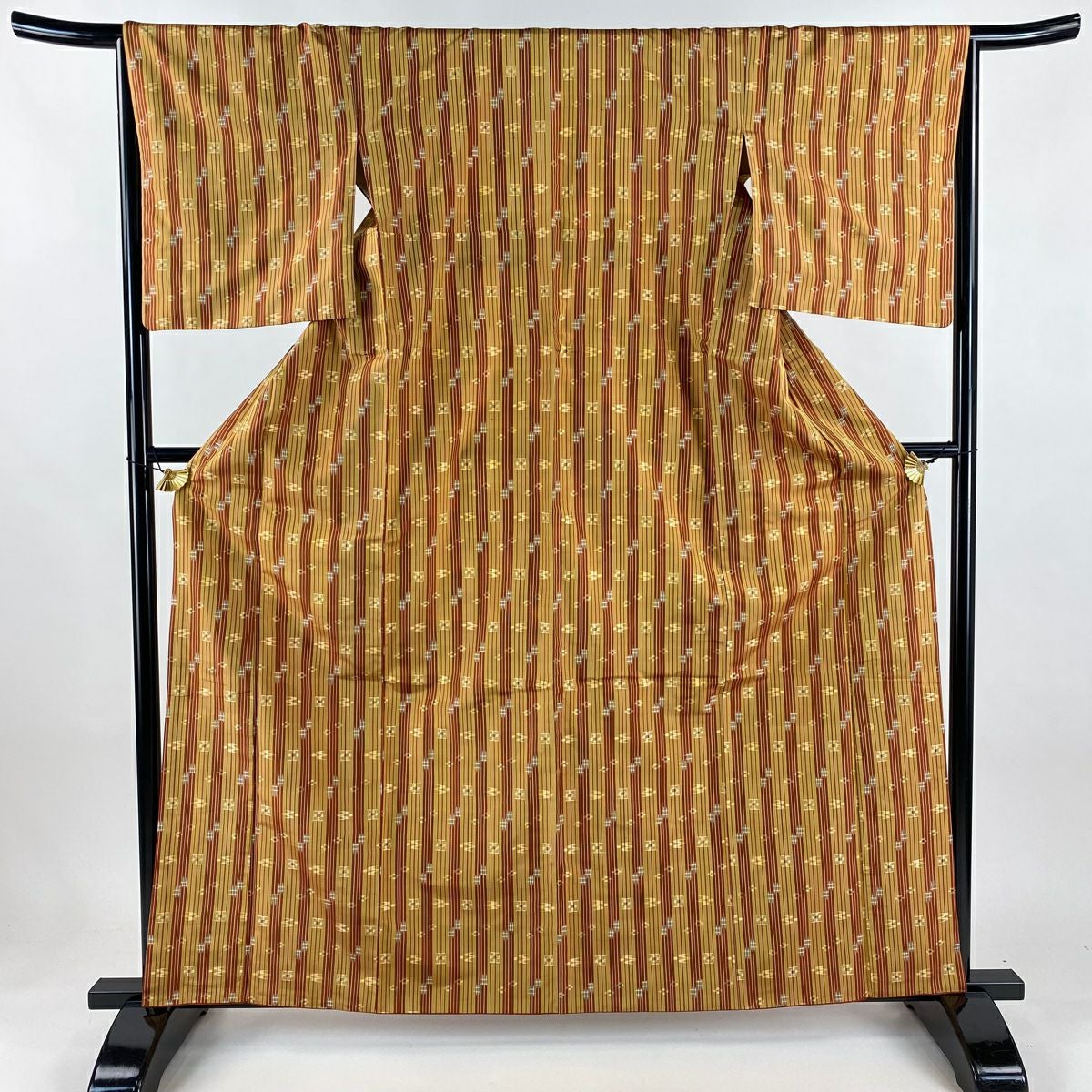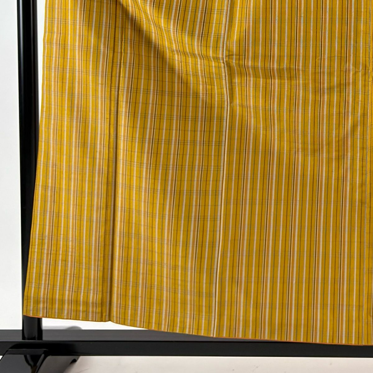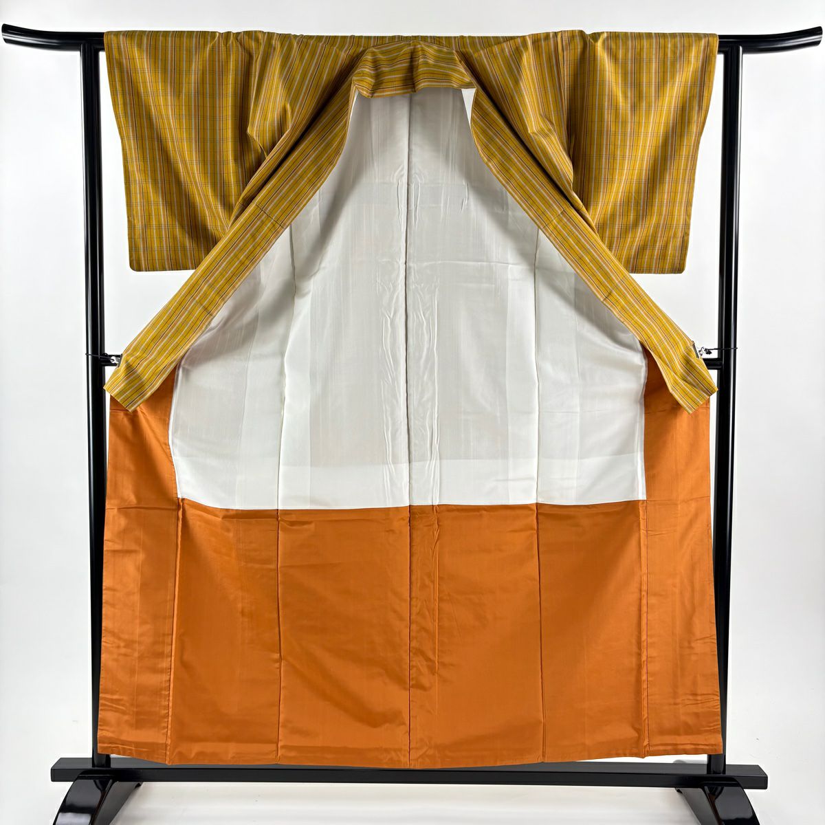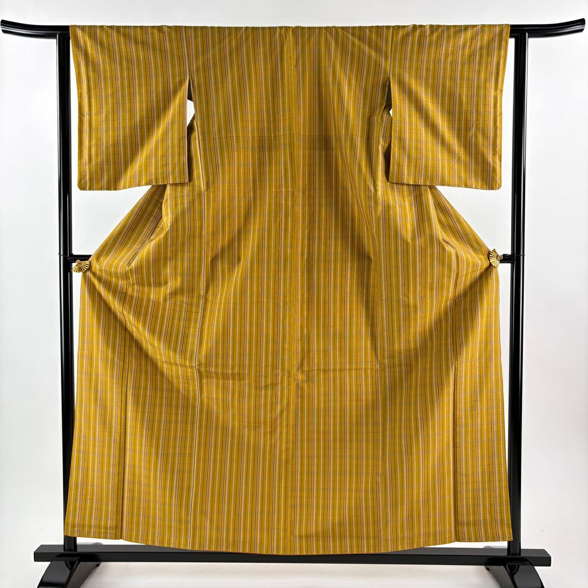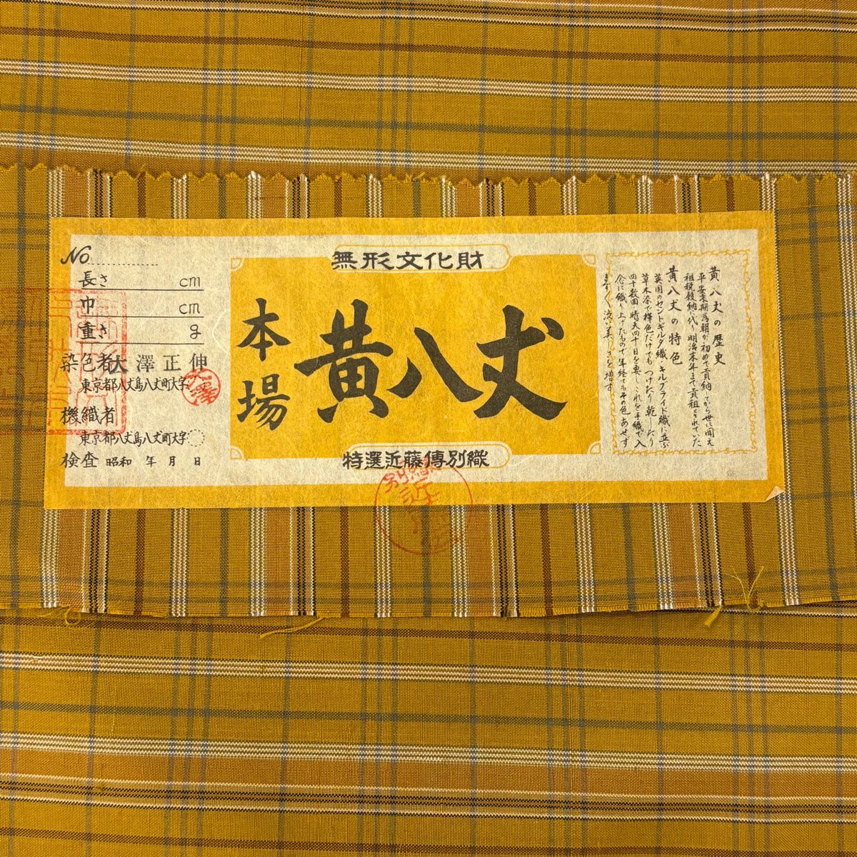 【美品】 紬 身丈159cm 裄丈62.5cm S 袷 黄八丈 証紙あり 格子 平織 山吹茶色 正絹 逸品