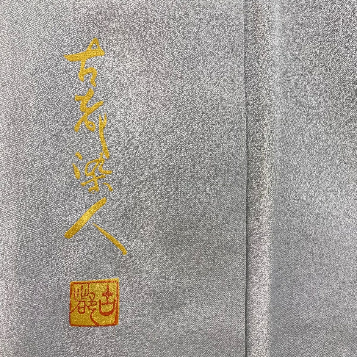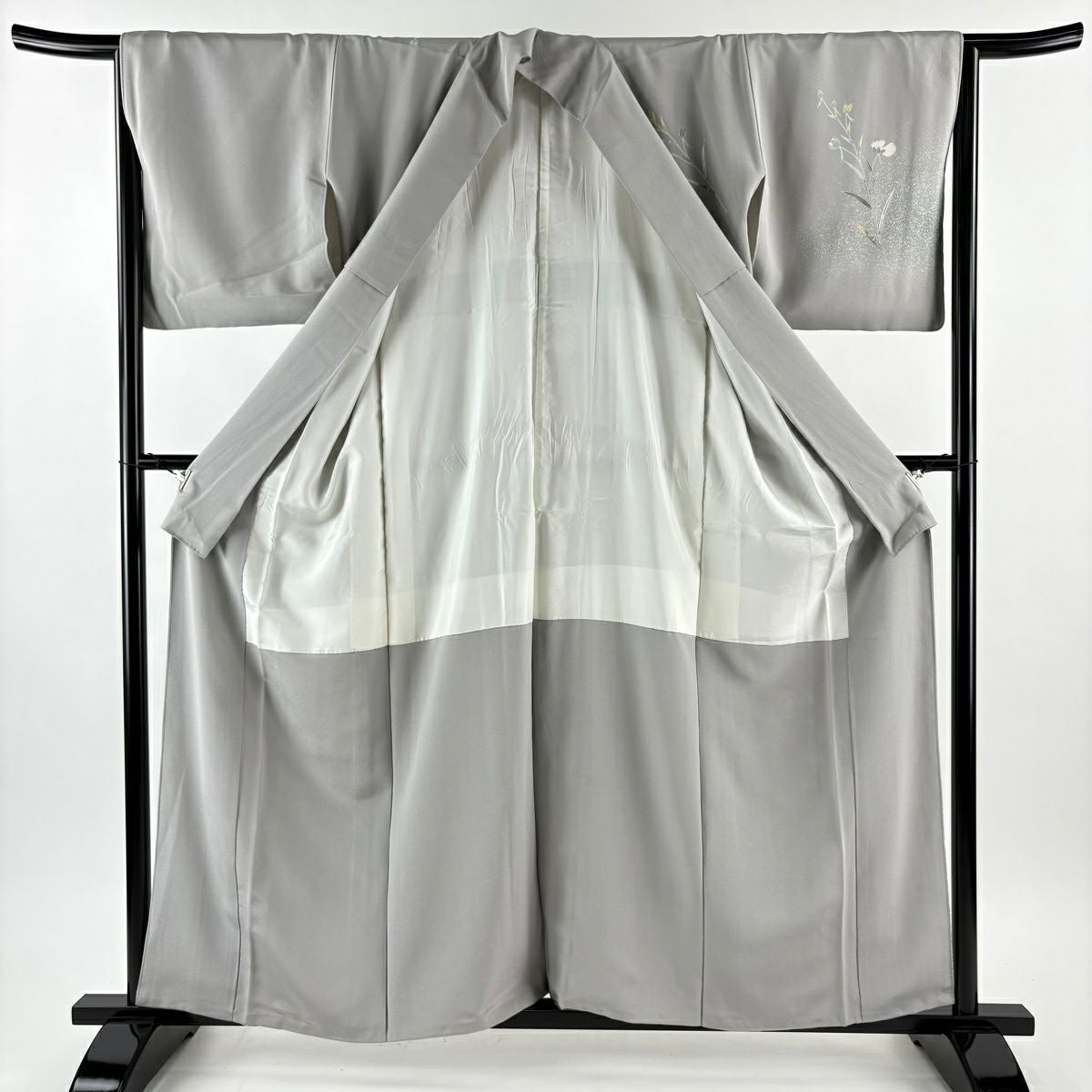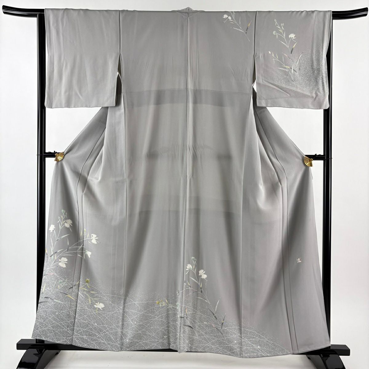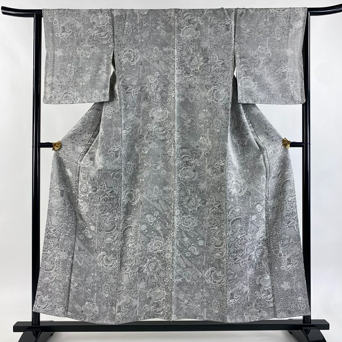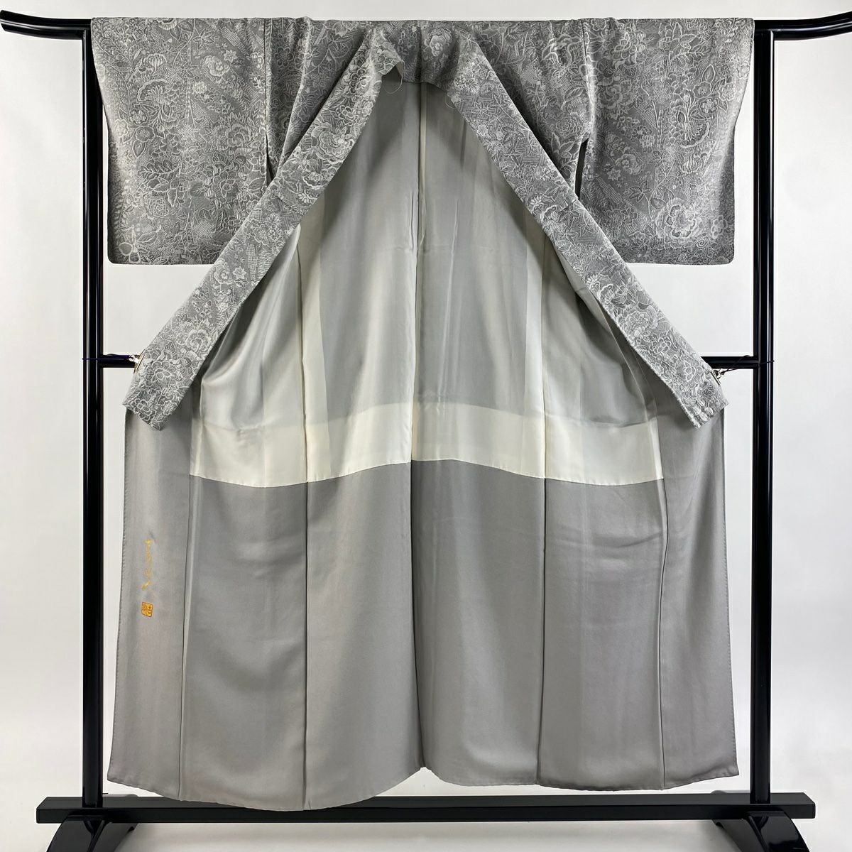 【在庫一掃】 小紋 身丈155cm 裄丈65cm M 袷 山岡古都 紋意匠 落款あり 草花 灰色 正絹 逸品