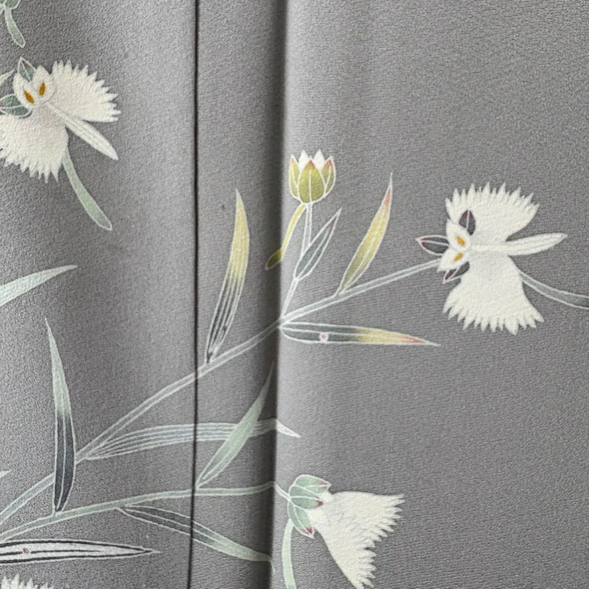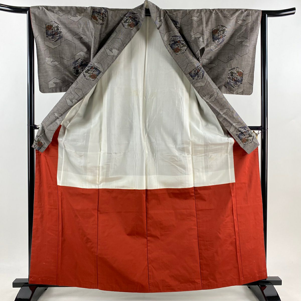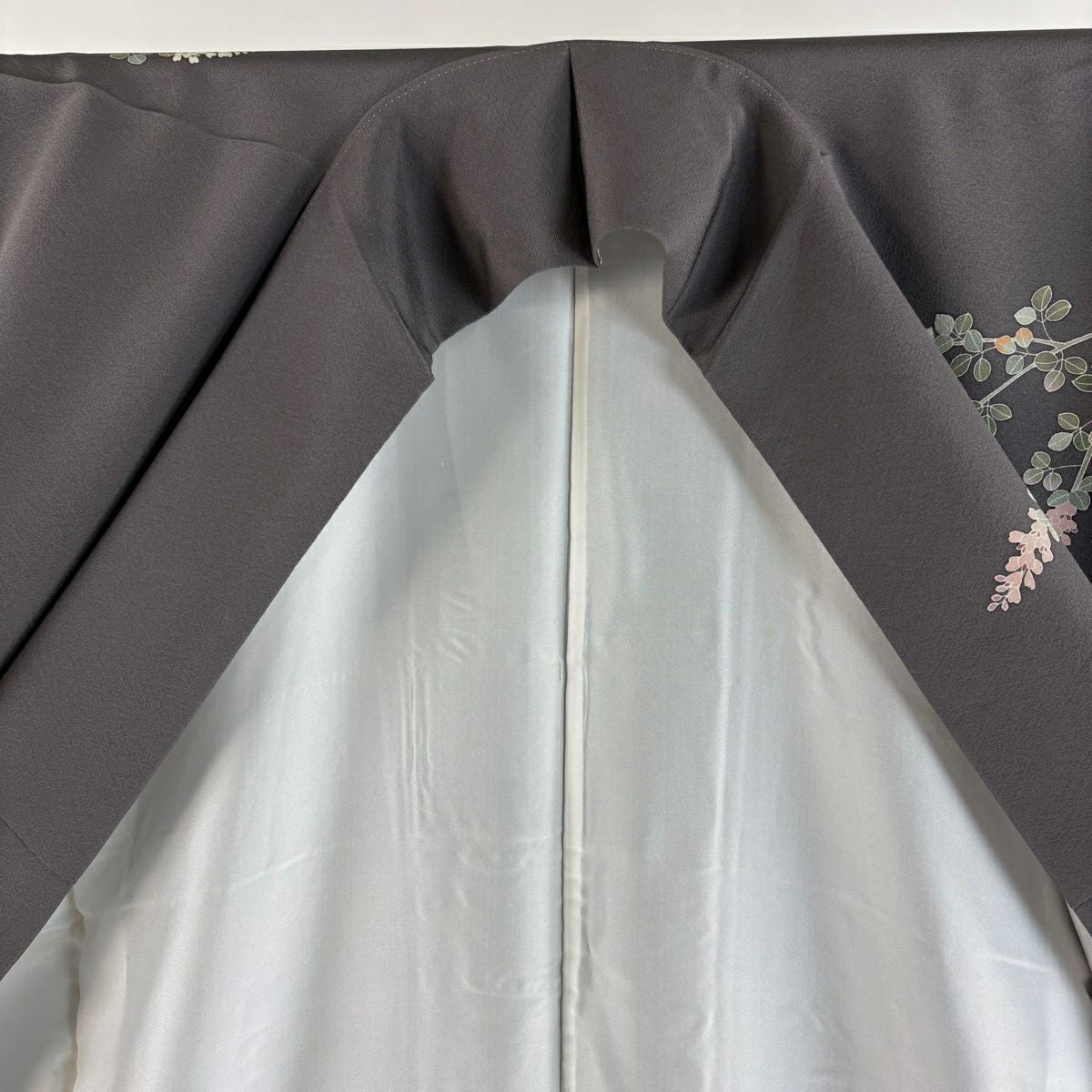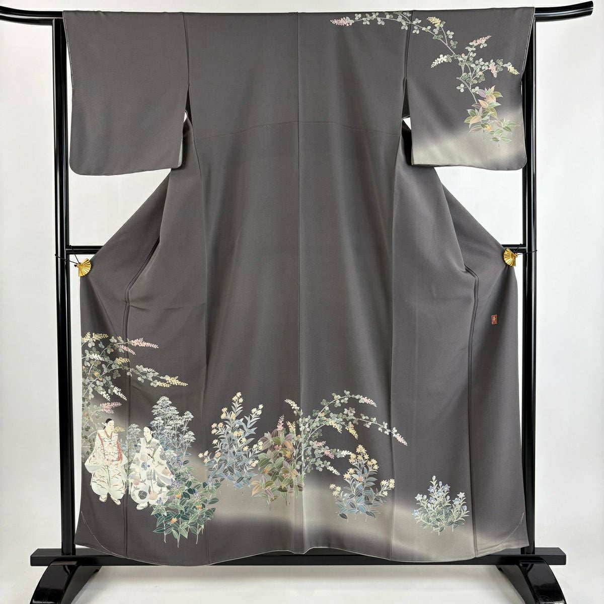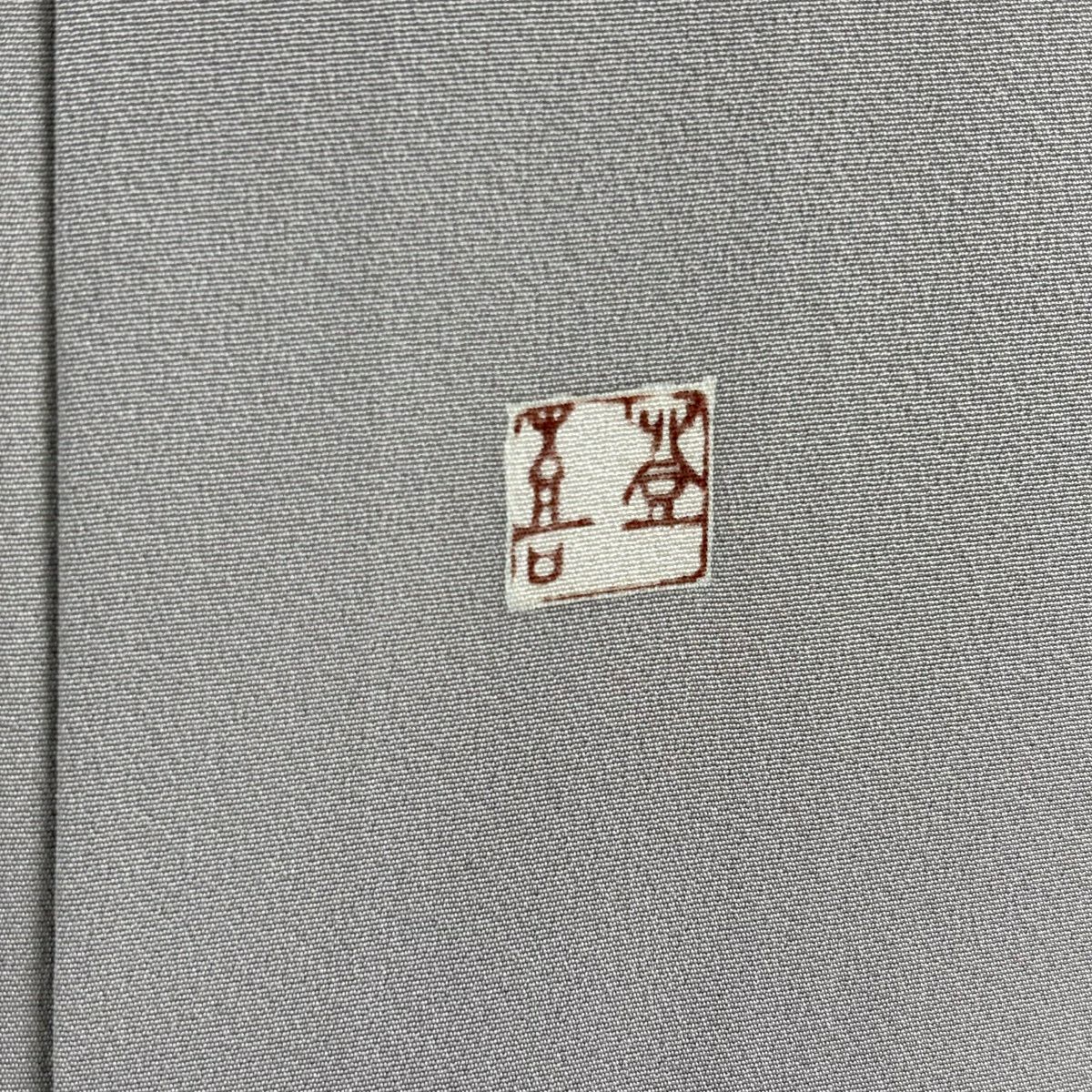 【在庫一掃】 小紋 身丈155cm 裄丈65cm M 袷 山岡古都 紋意匠 落款あり 草花 灰色 正絹 逸品