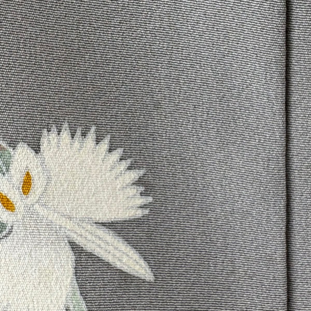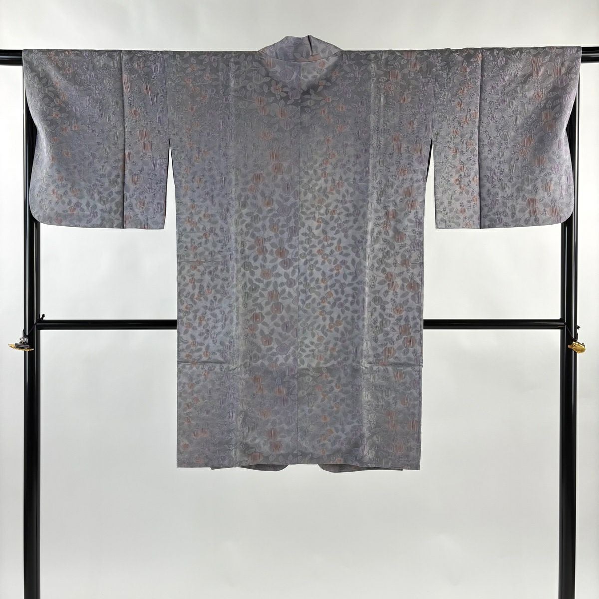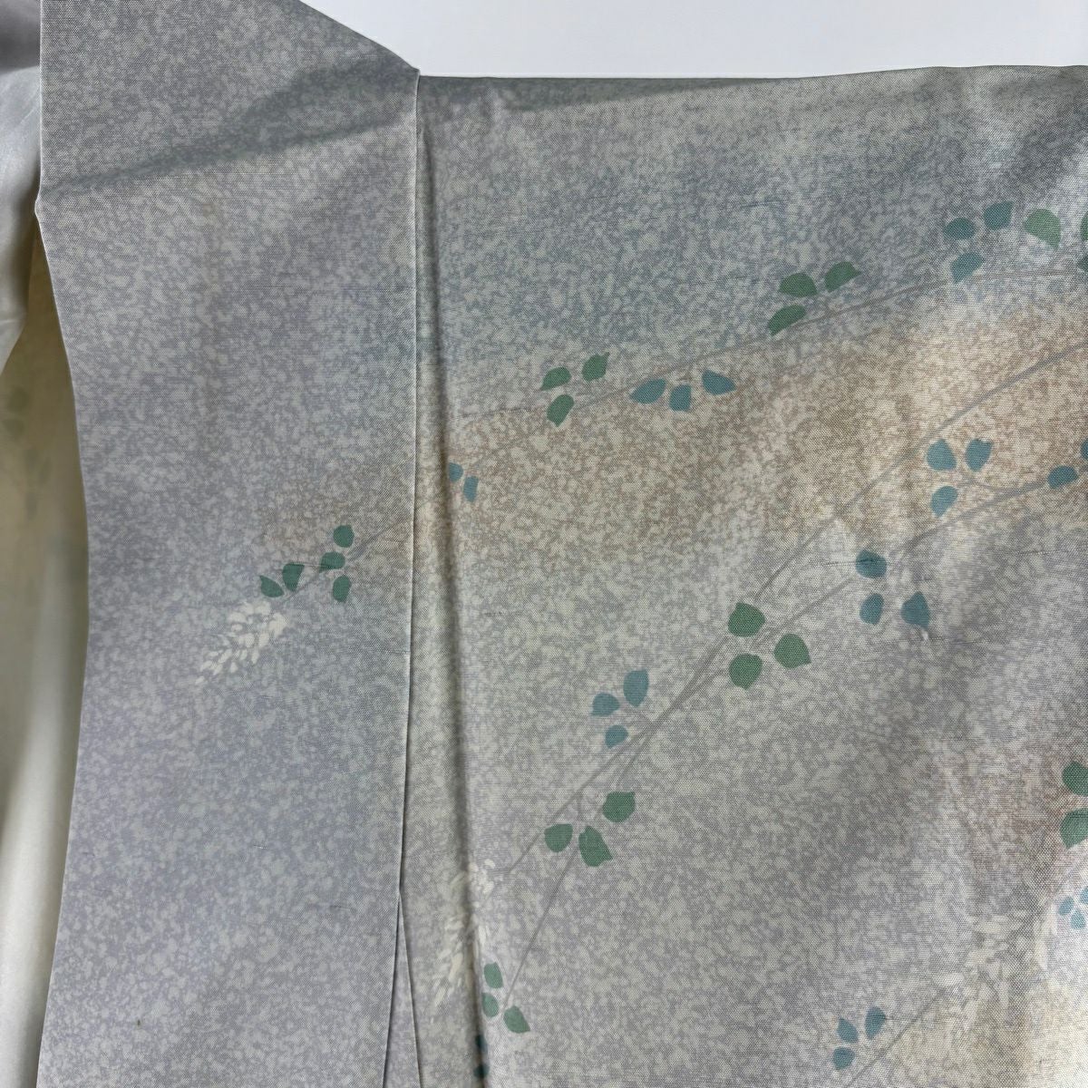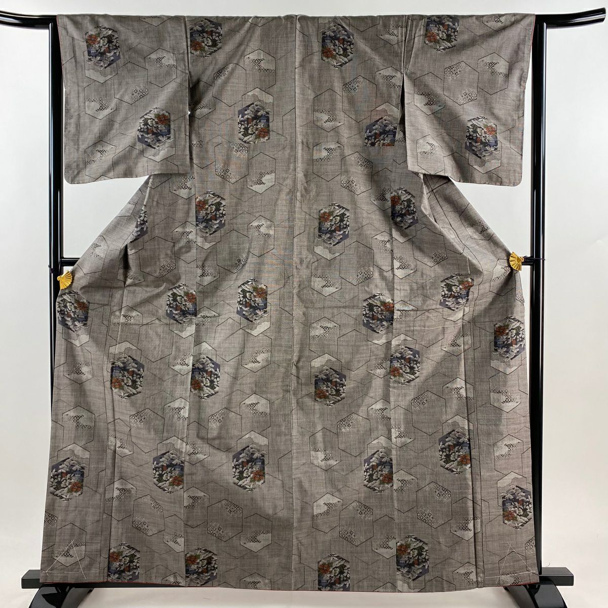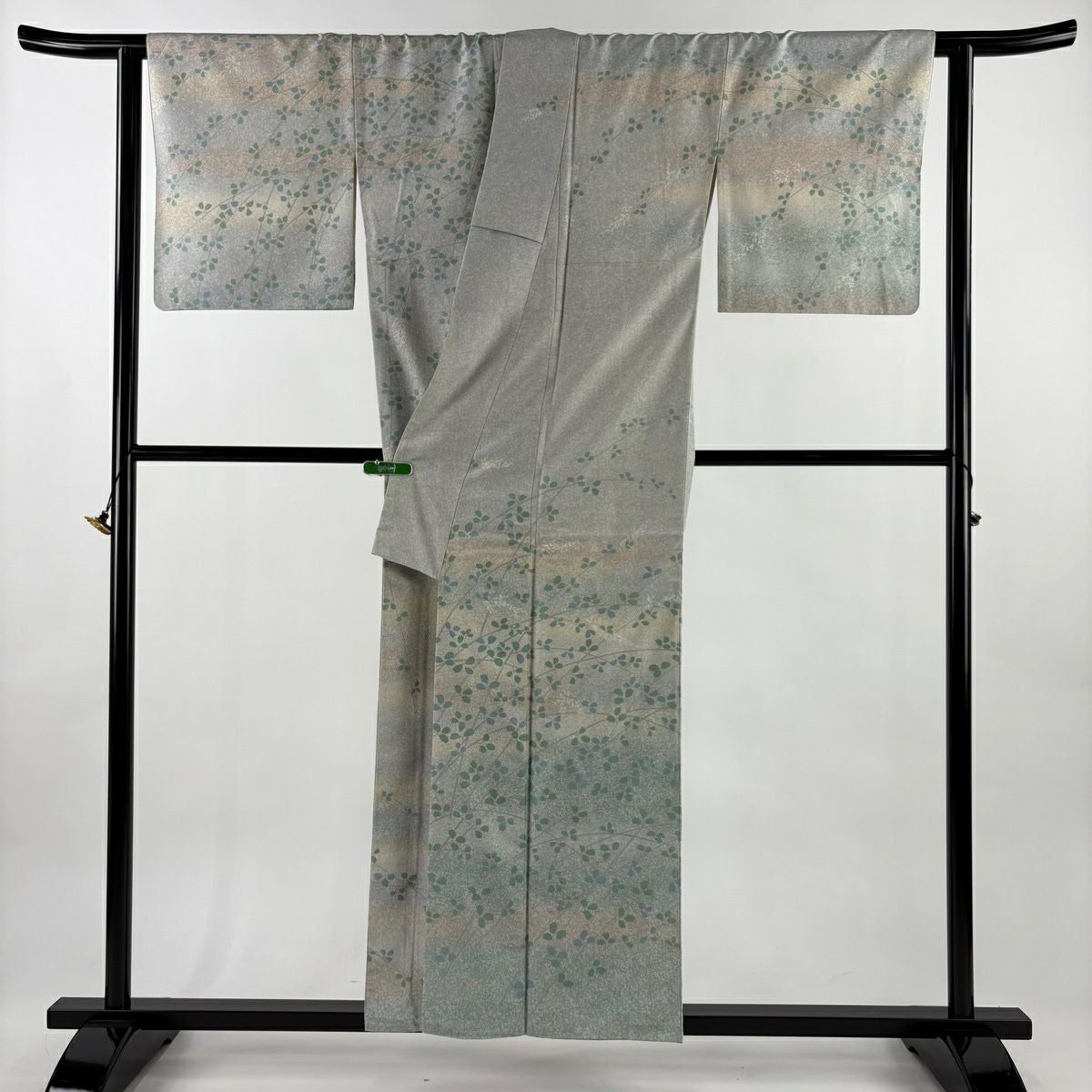 【在庫一掃】 小紋 身丈155cm 裄丈65cm M 袷 山岡古都 紋意匠 落款あり 草花 灰色 正絹 逸品