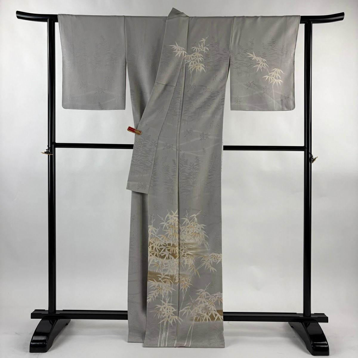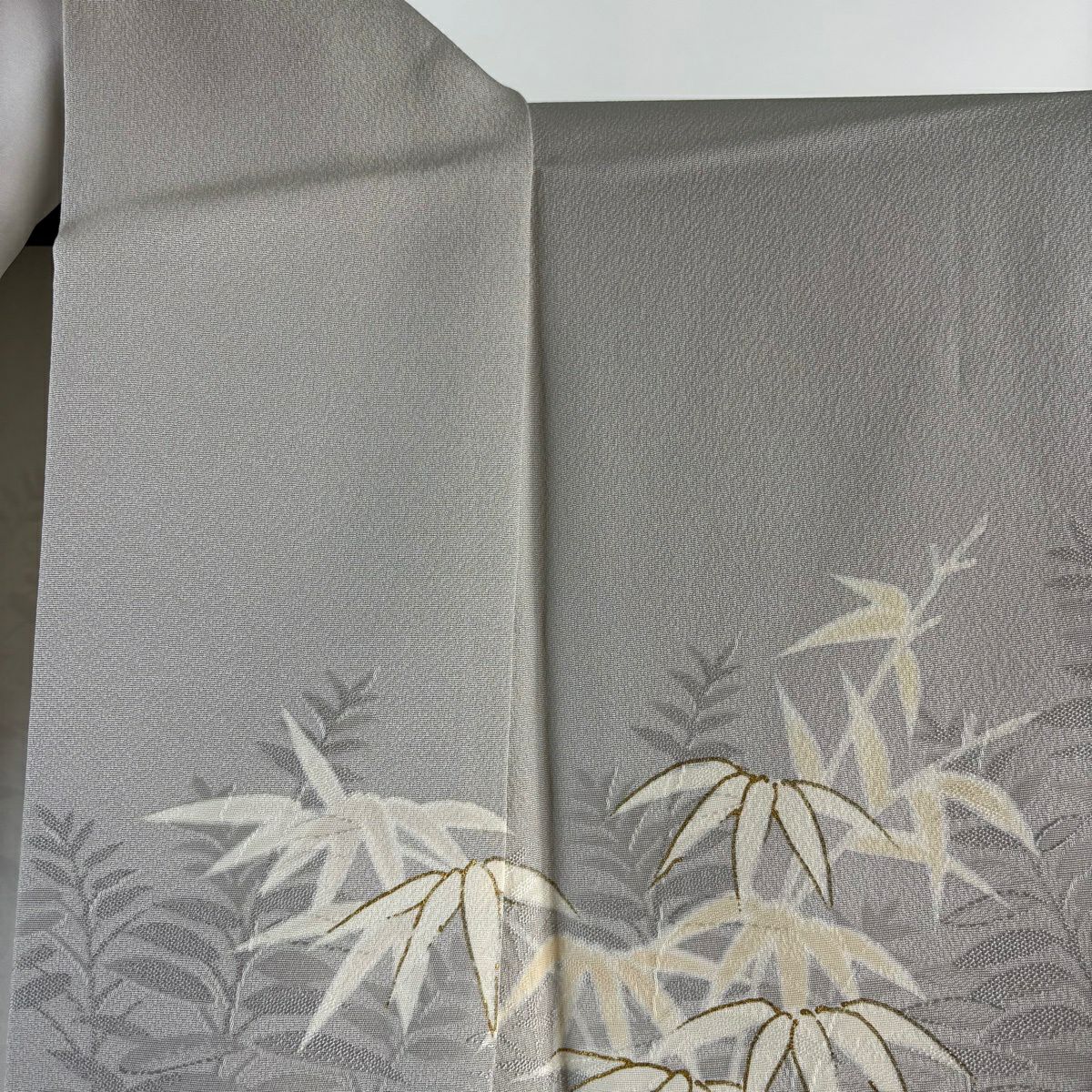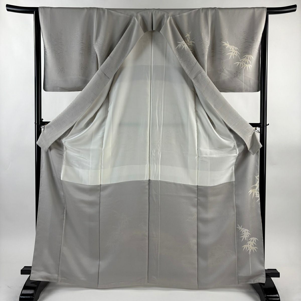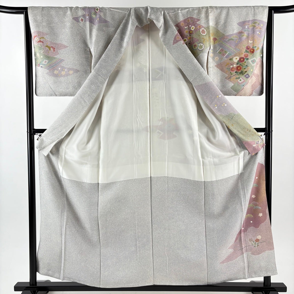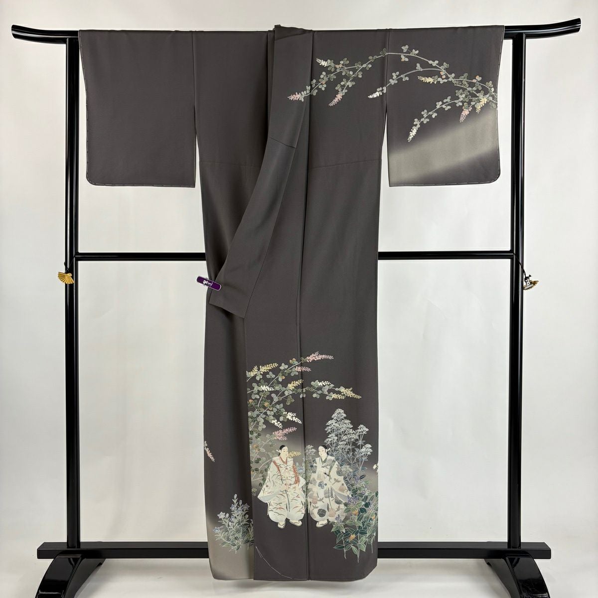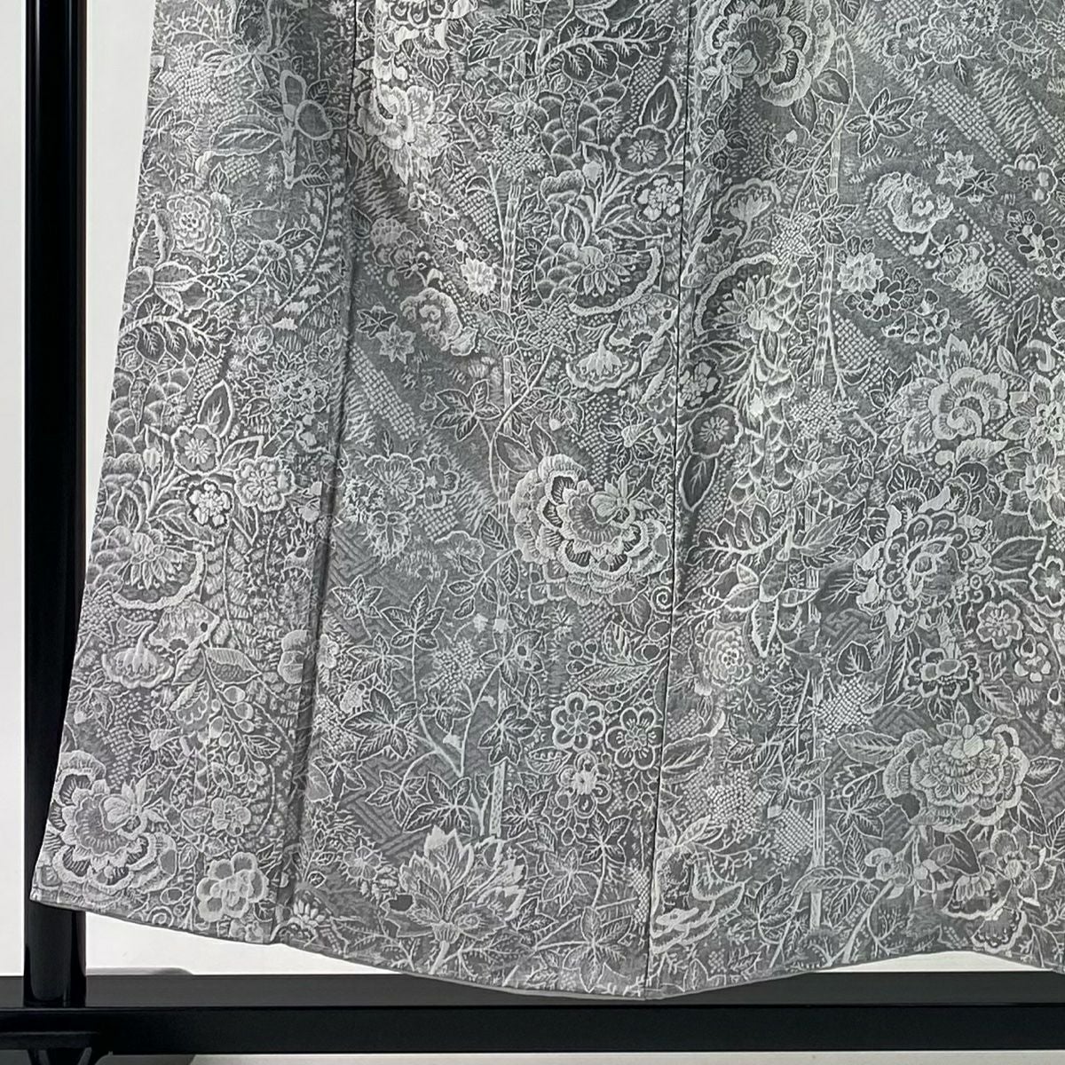 【在庫一掃】 小紋 身丈155cm 裄丈65cm M 袷 山岡古都 紋意匠 落款あり 草花 灰色 正絹 逸品