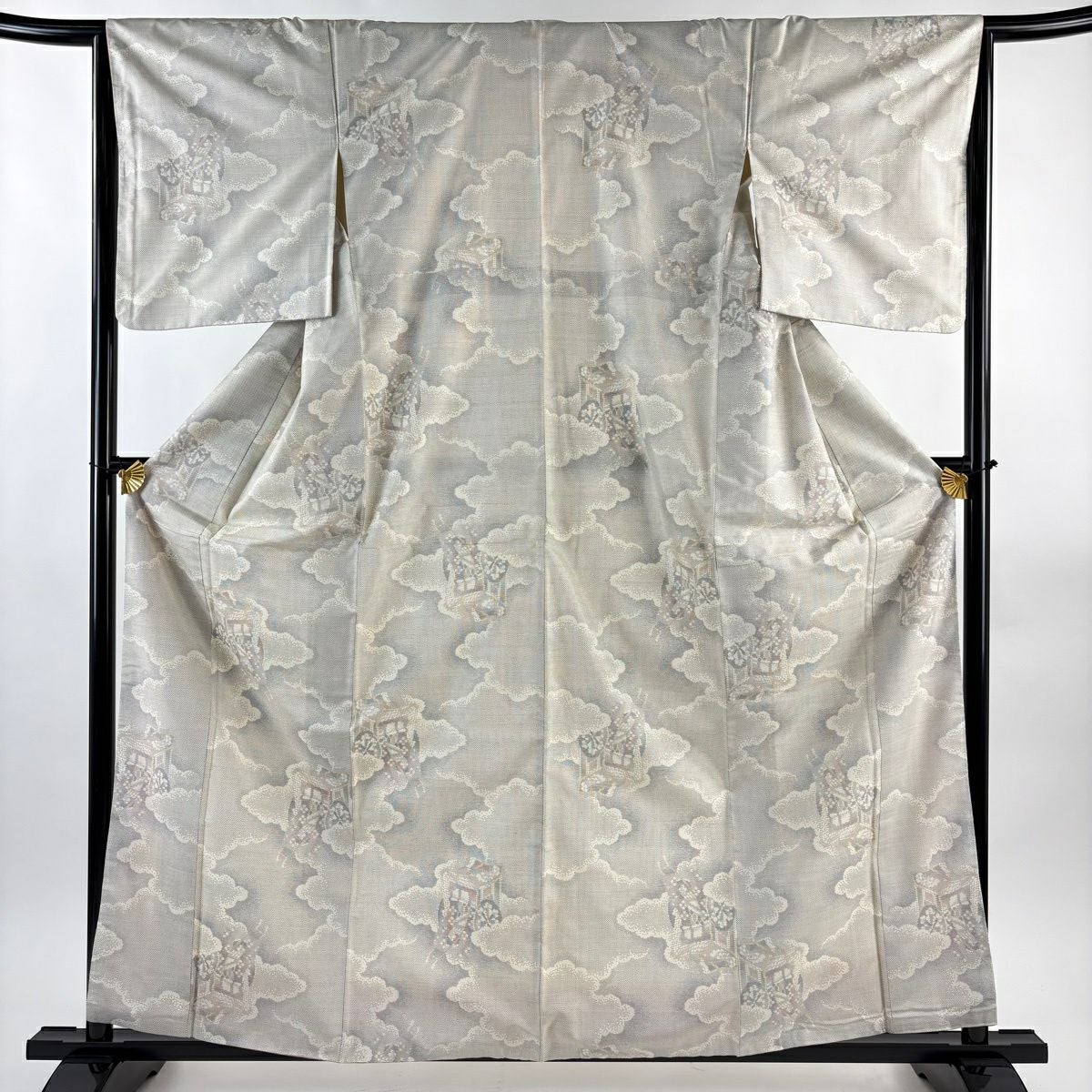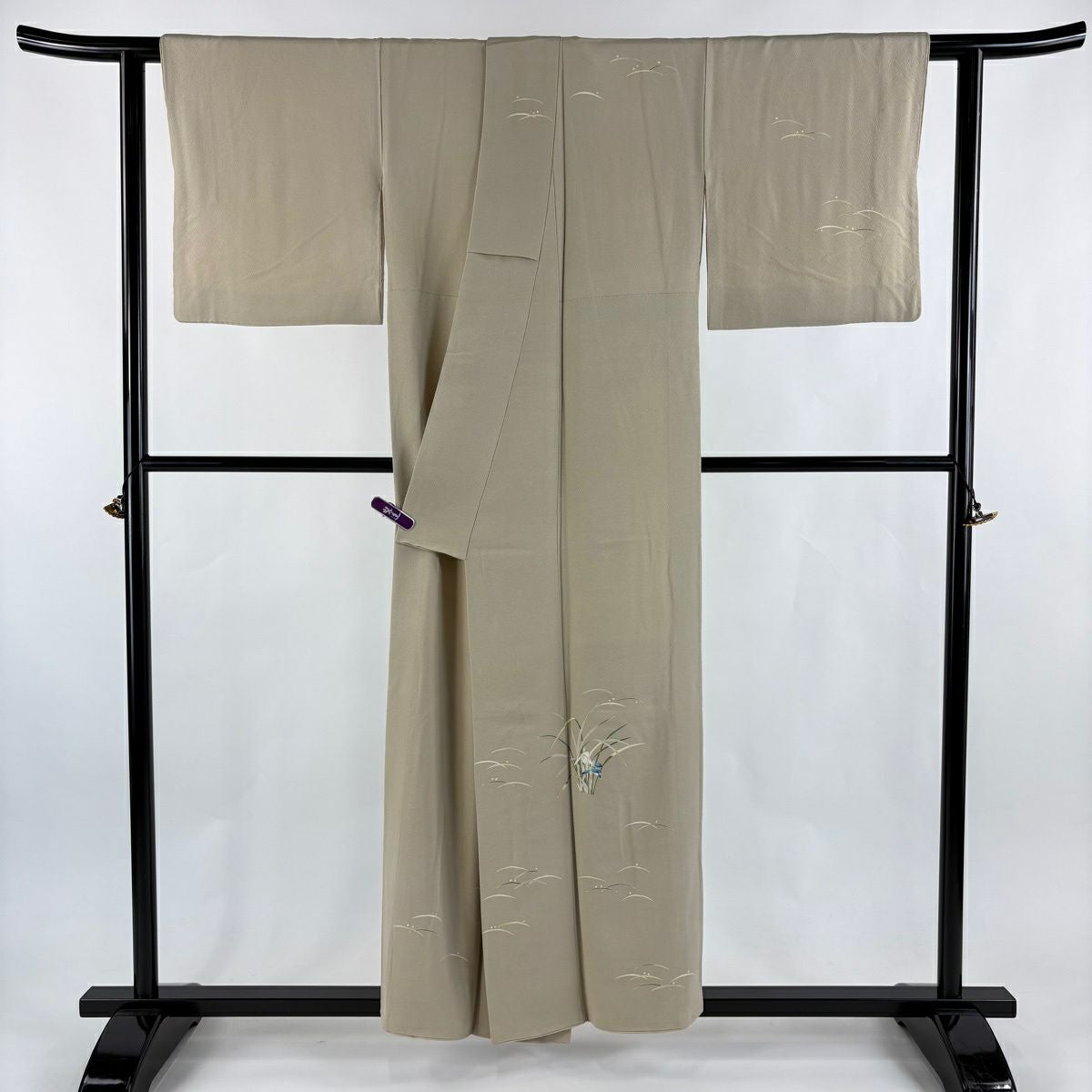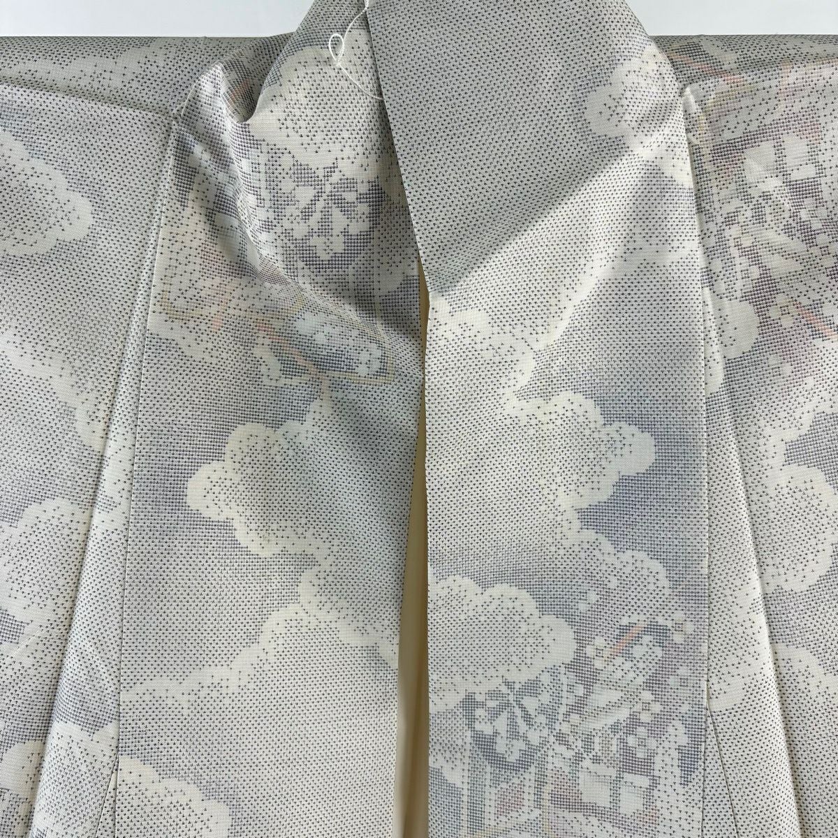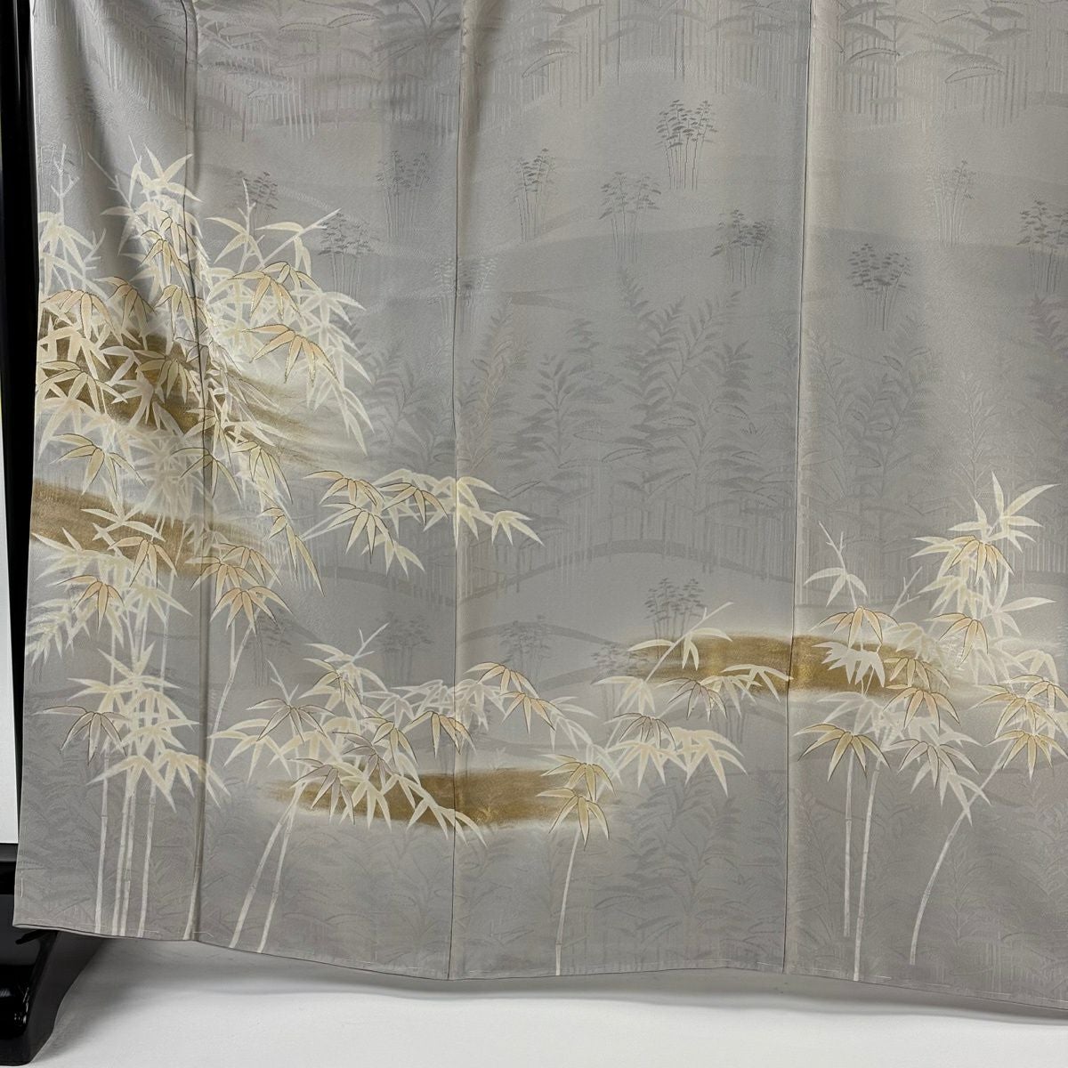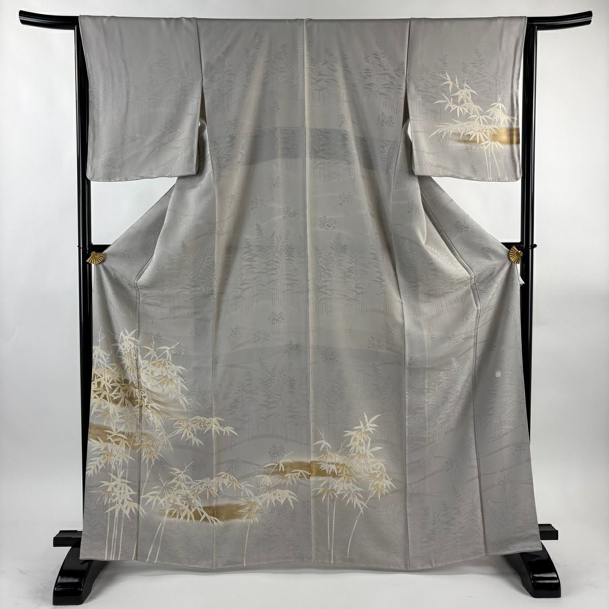 【在庫一掃】 小紋 身丈155cm 裄丈65cm M 袷 山岡古都 紋意匠 落款あり 草花 灰色 正絹 逸品