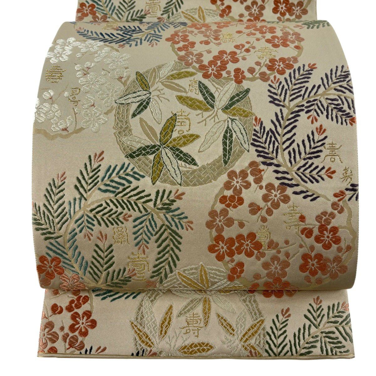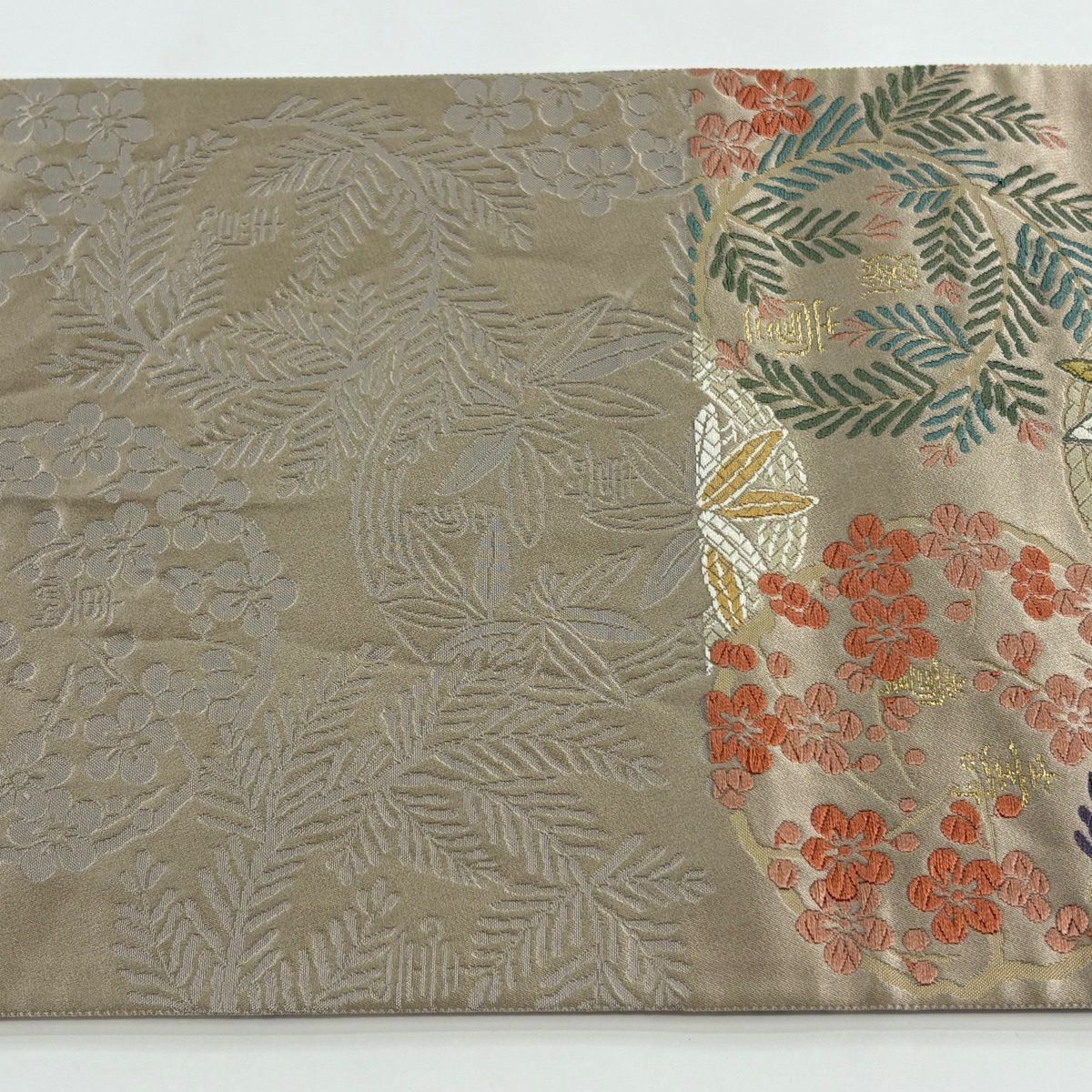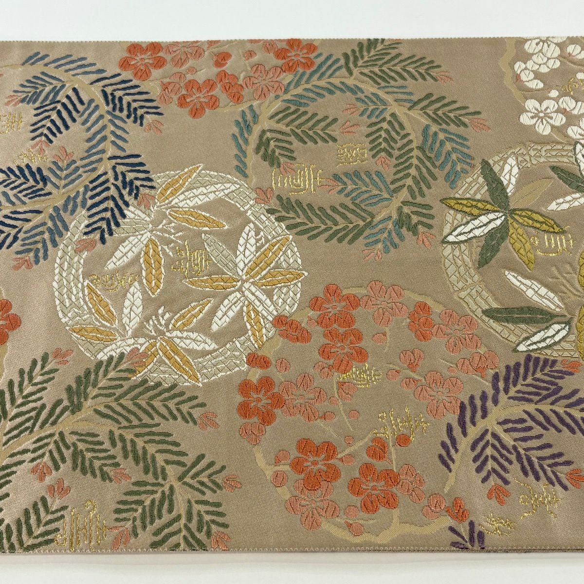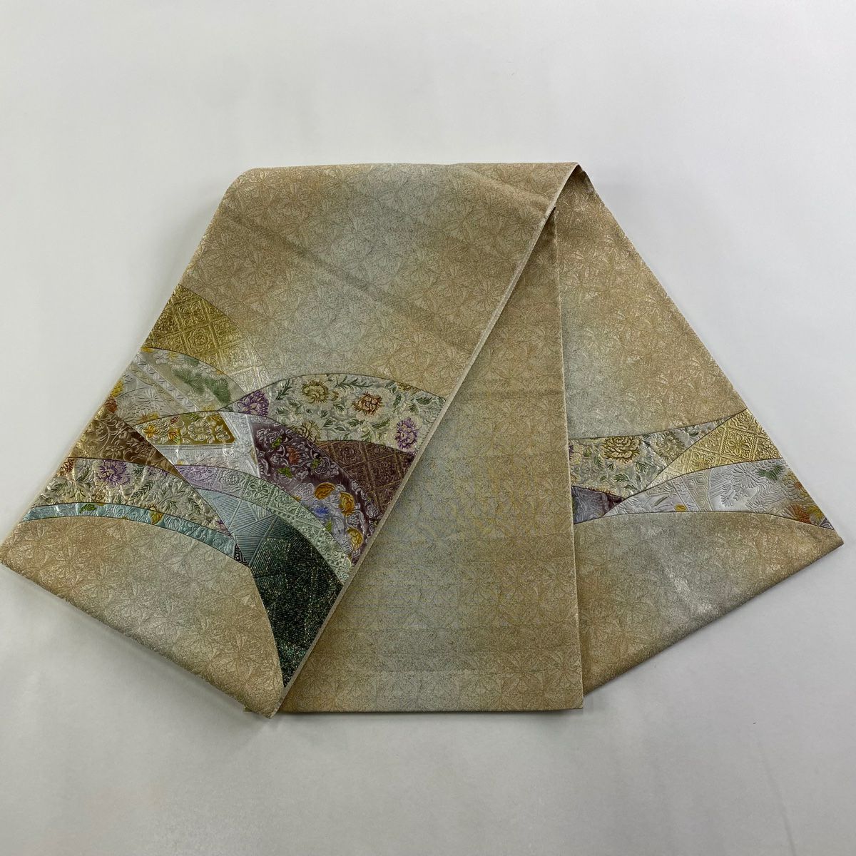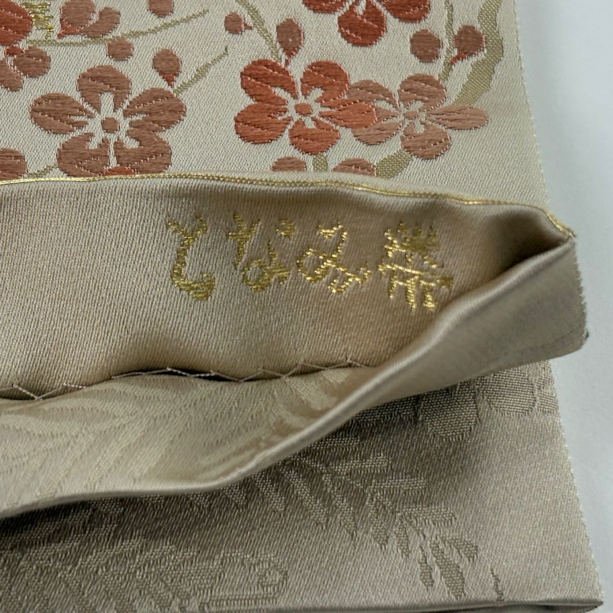 【在庫一掃】 【美品】 袋帯 逸品 落款あり やまと 草花 切り嵌め 金銀彩 ベージュ お太鼓柄 正絹