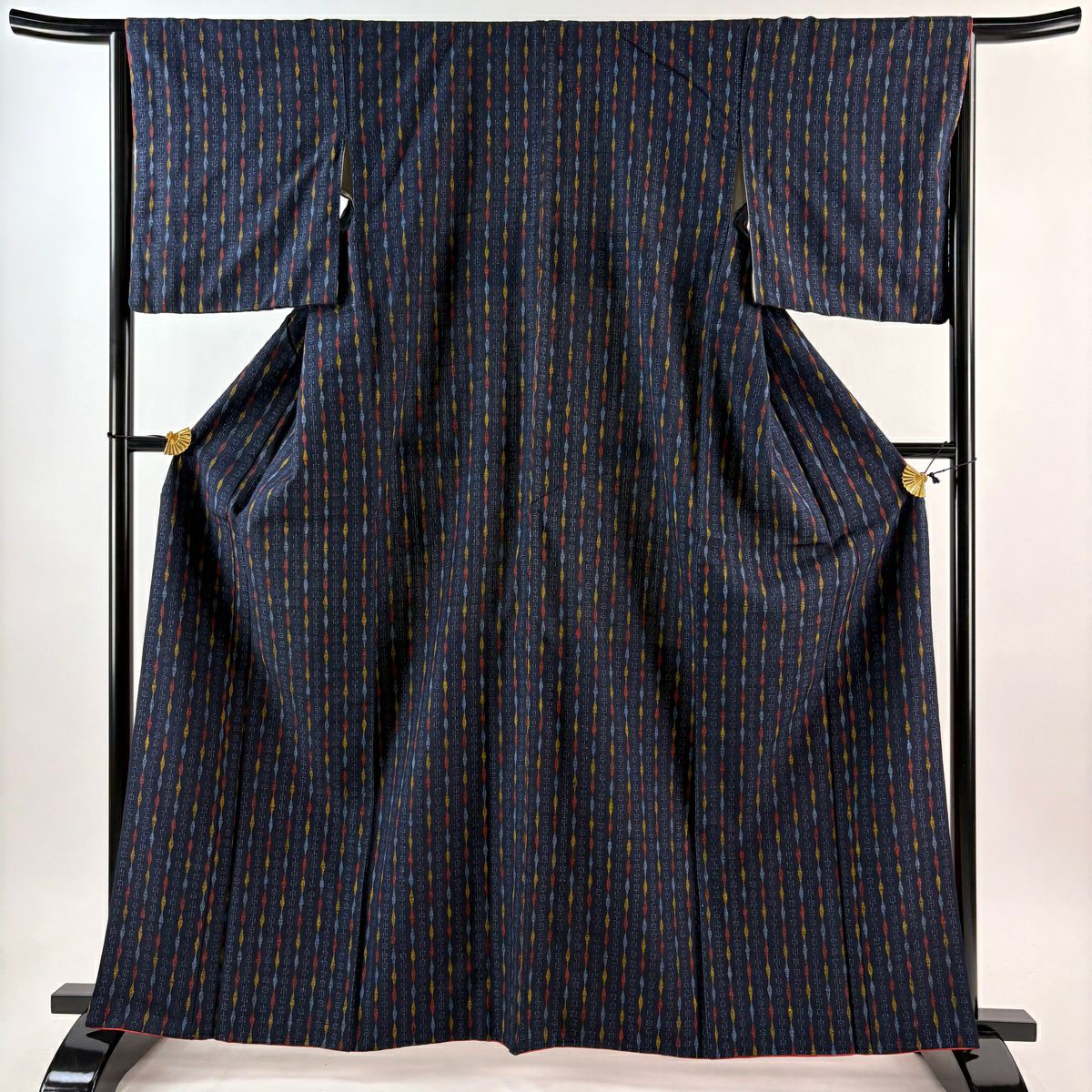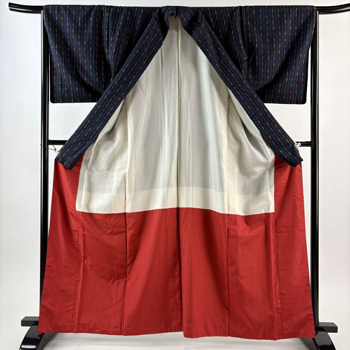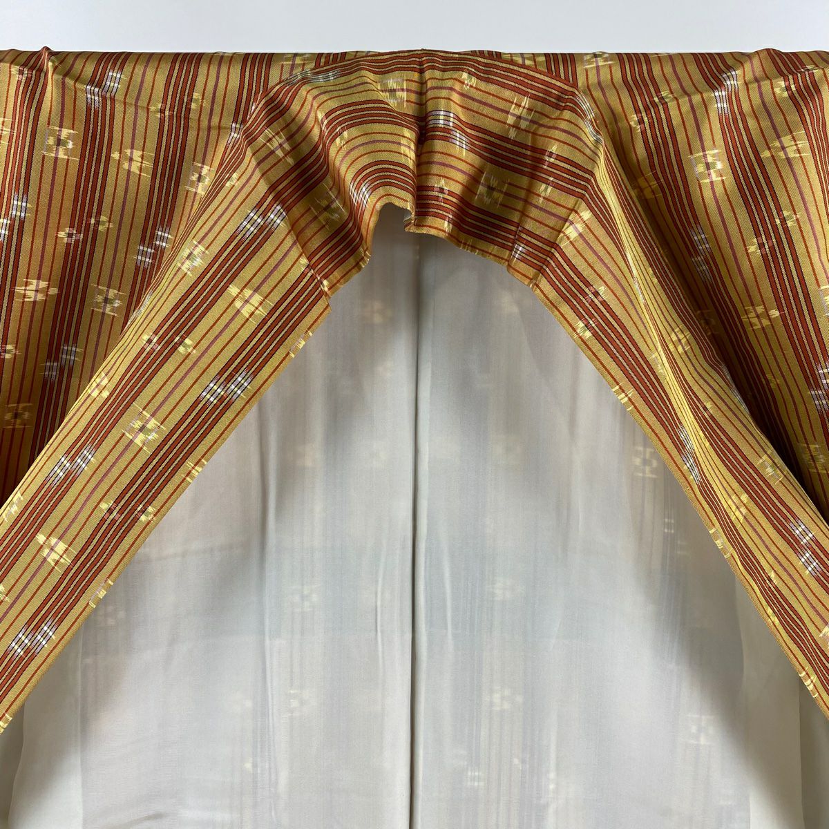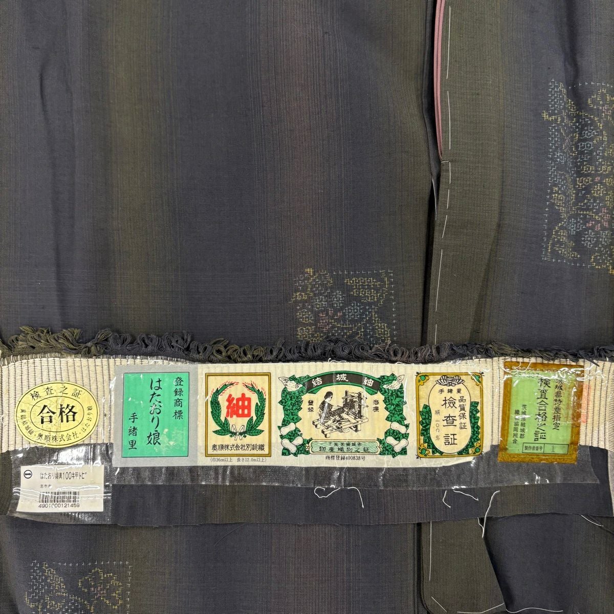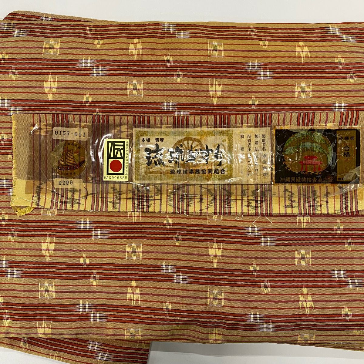【在庫一掃】 紬 身丈162cm 裄丈65.5cm M 袷 琉球かすり 証紙あり 縞 燕 茶色 正絹 逸品