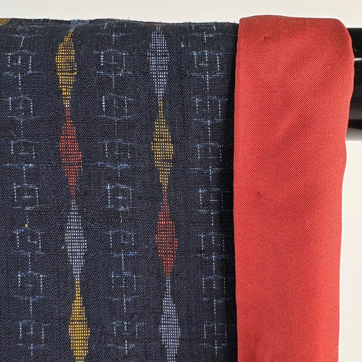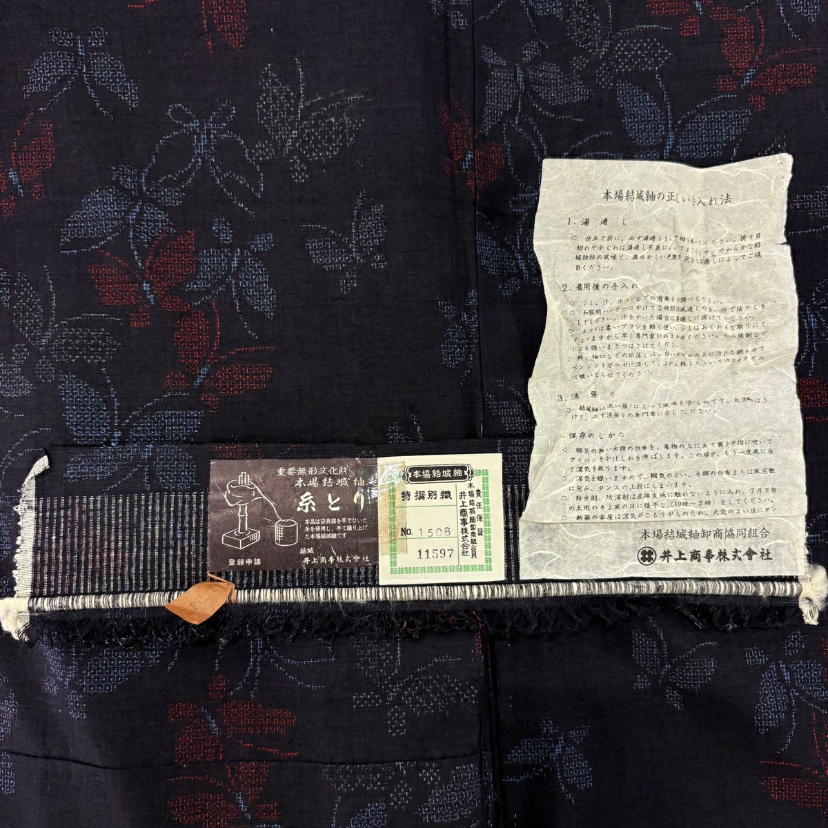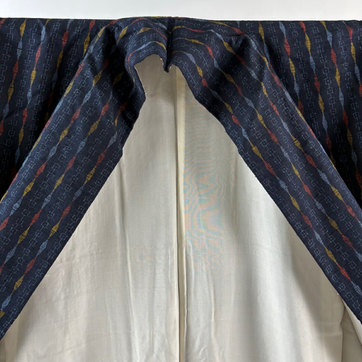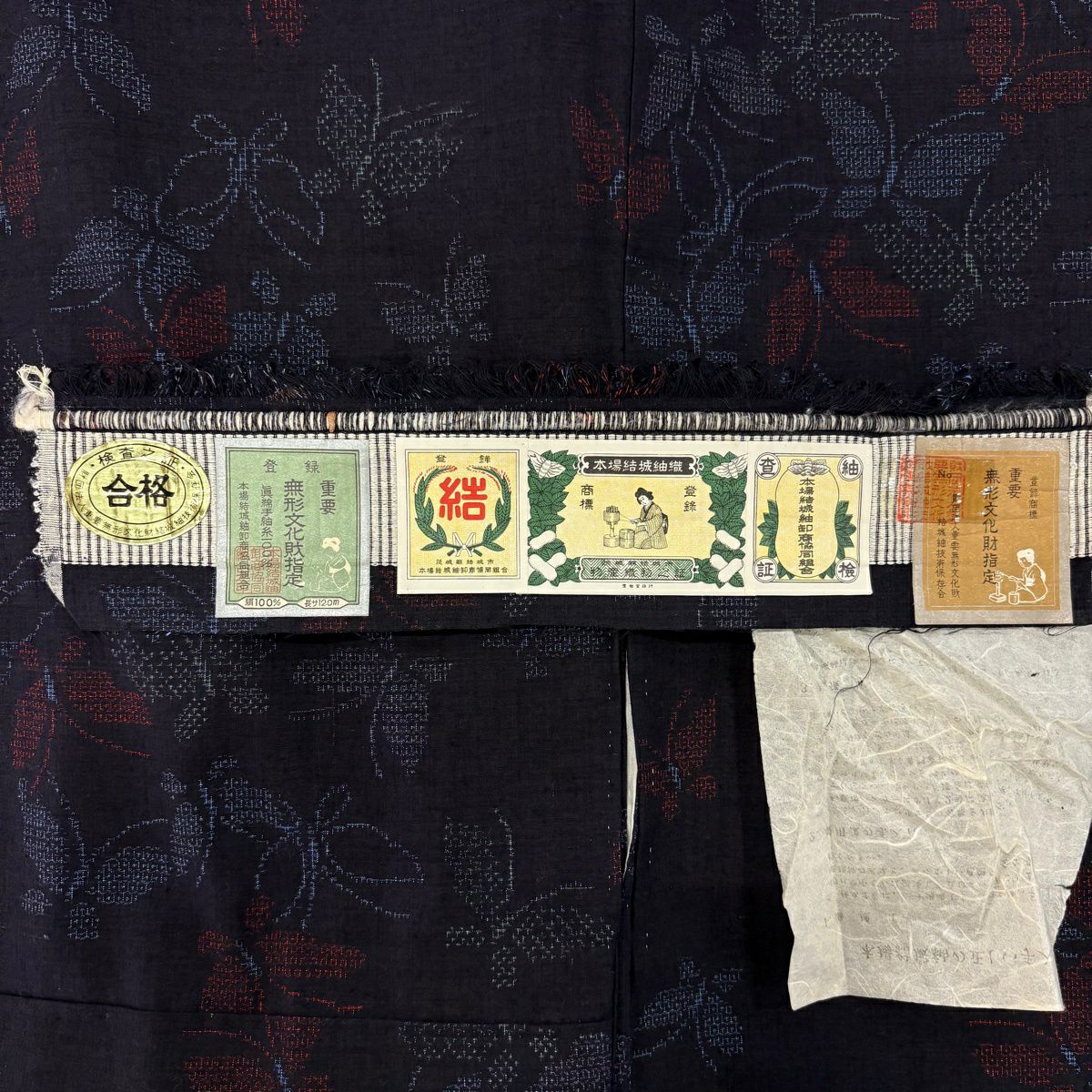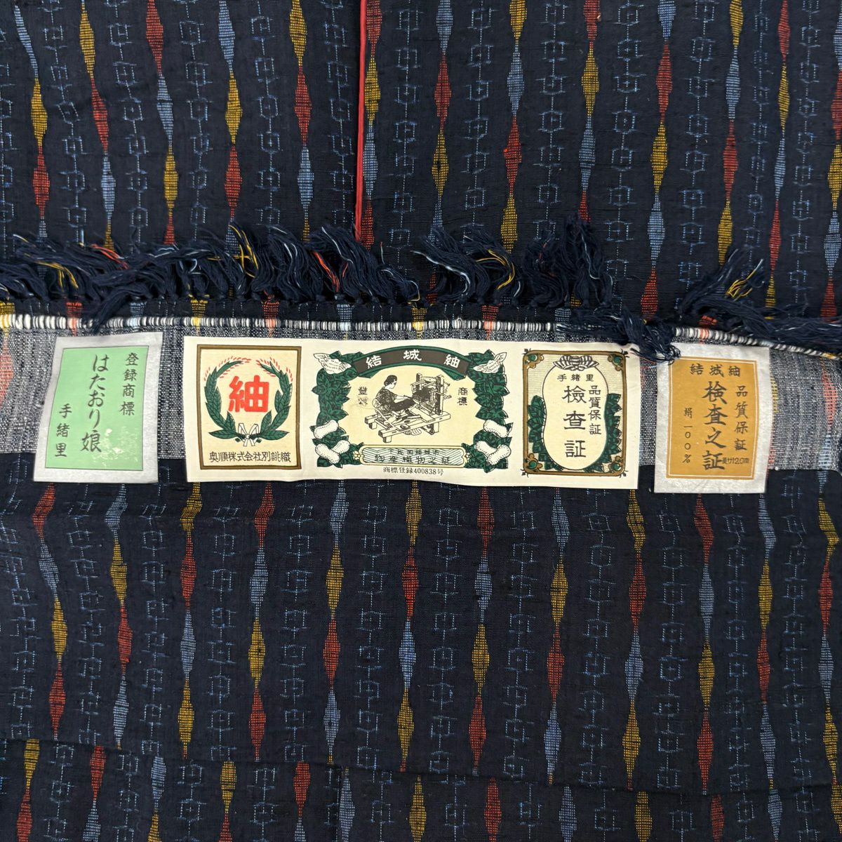 【在庫一掃】 紬 身丈162cm 裄丈65.5cm M 袷 琉球かすり 証紙あり 縞 燕 茶色 正絹 逸品