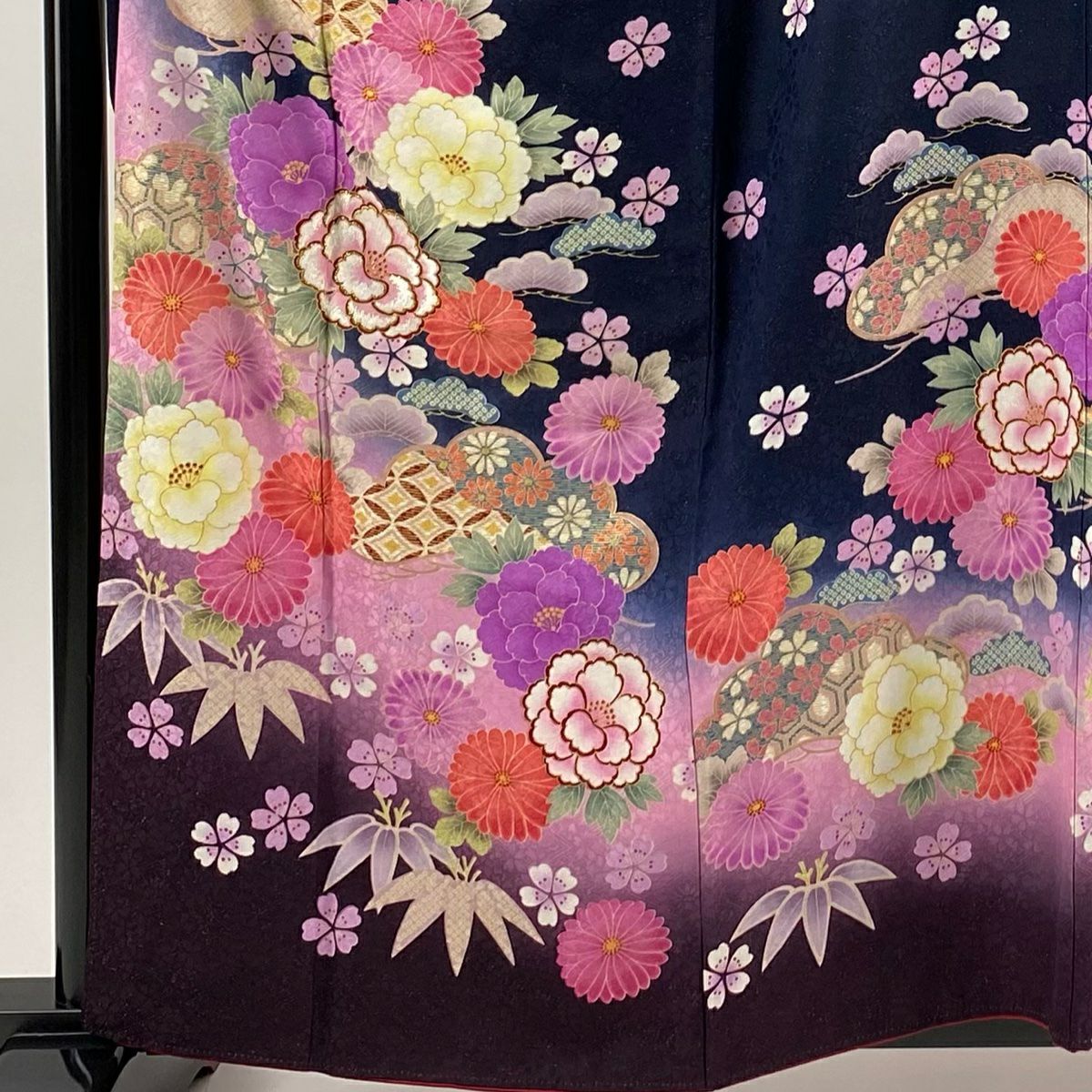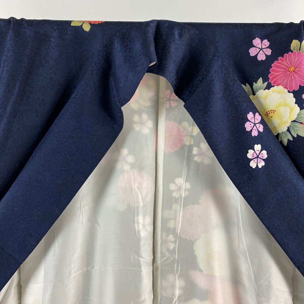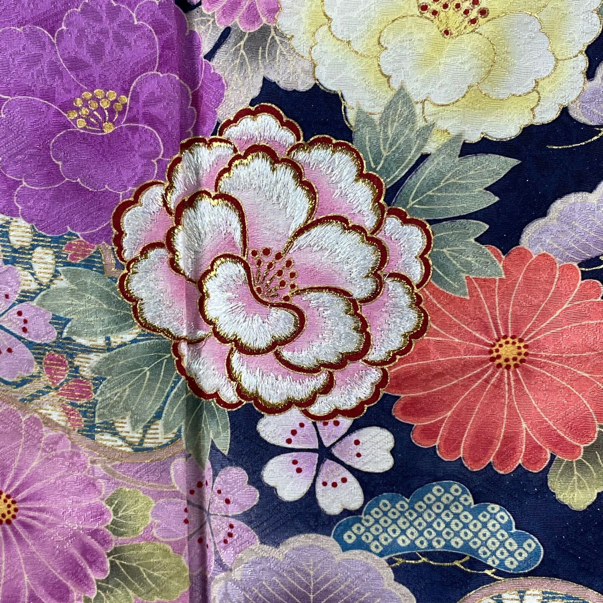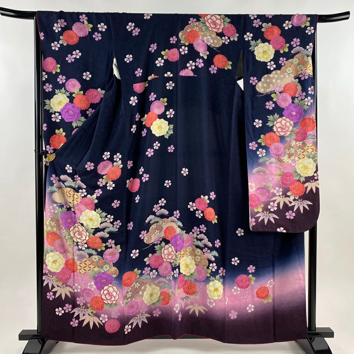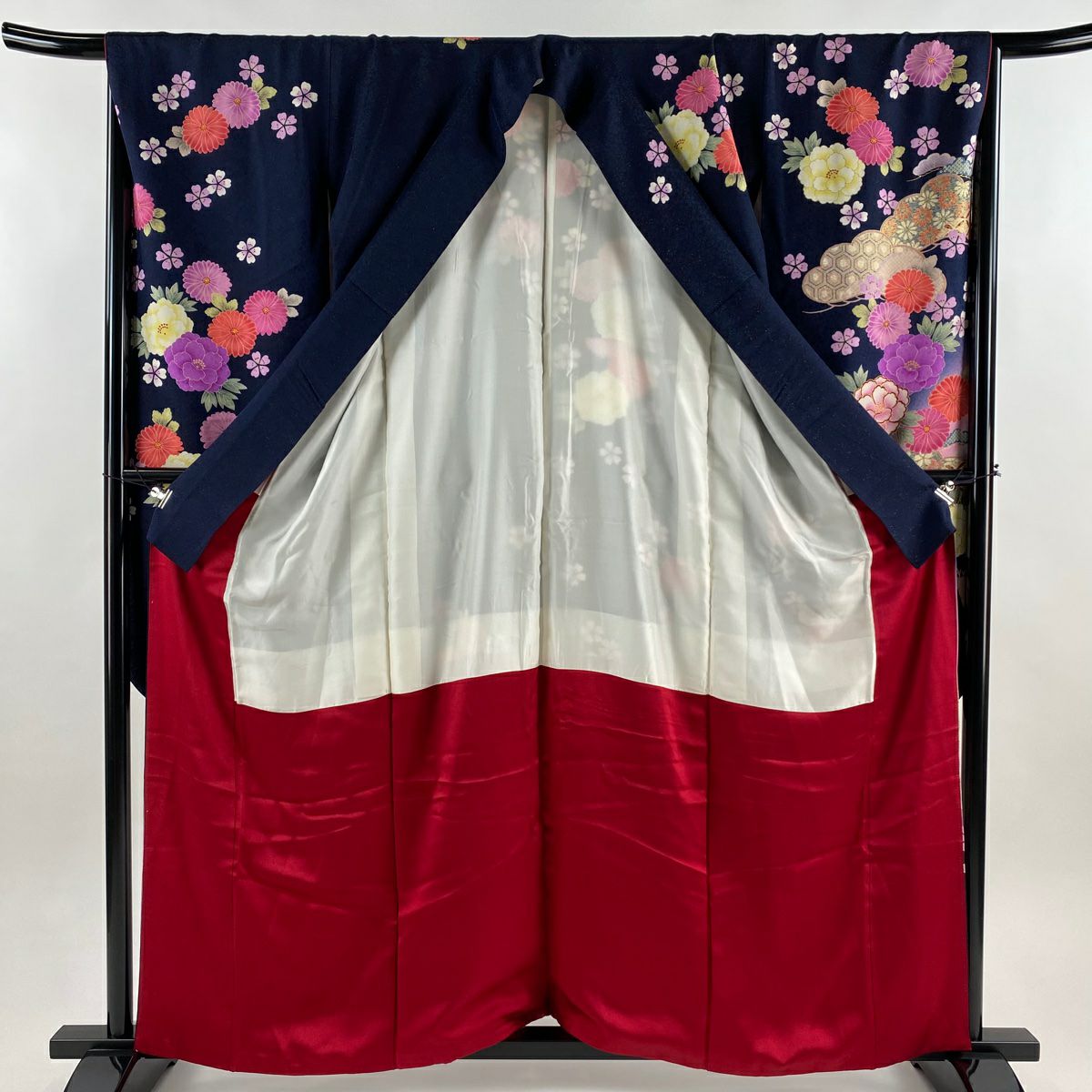 【在庫一掃】 【美品】 振袖 身丈160cm 裄丈68cm L 袷 牡丹 松 金通し 刺繍 濃紺 正絹 逸品