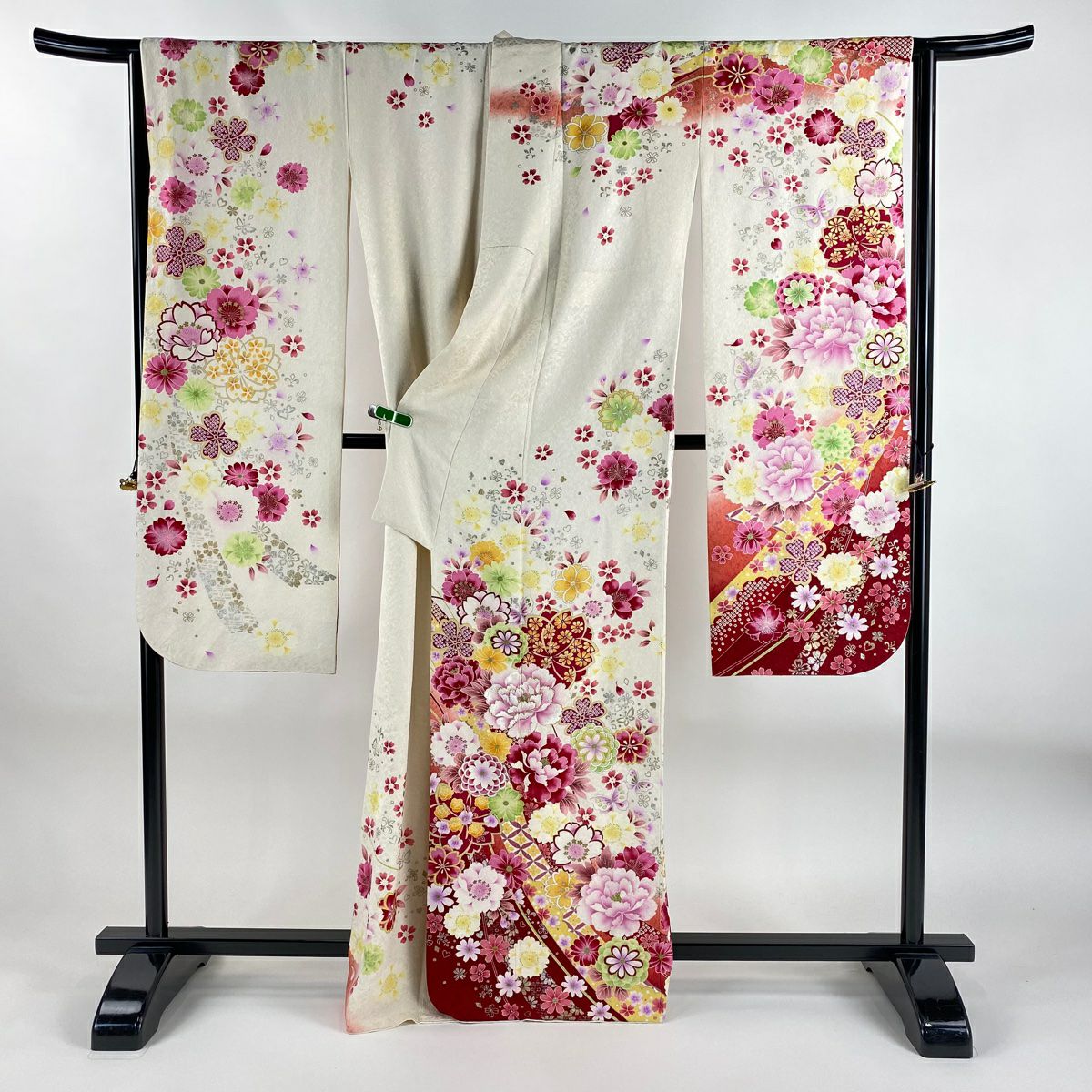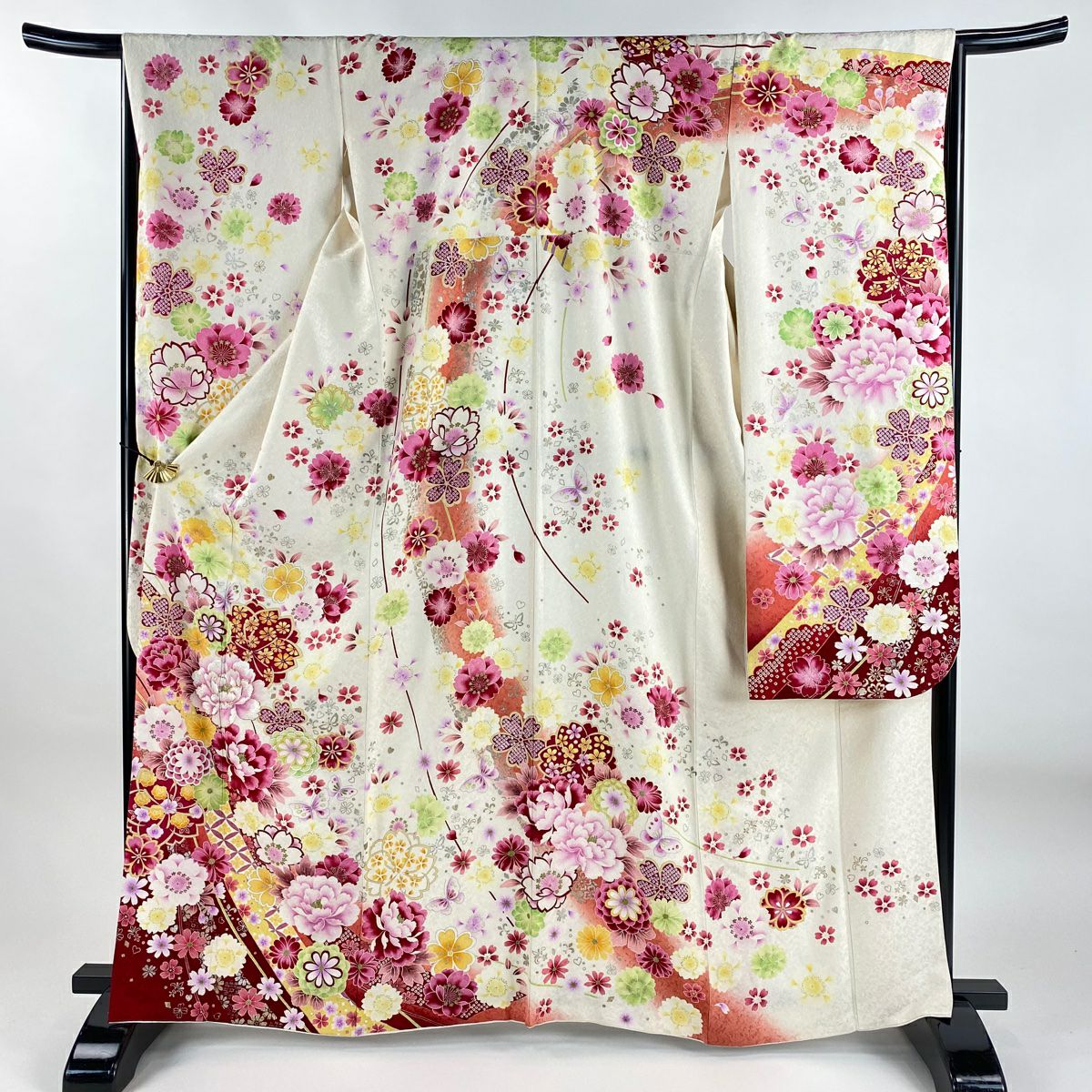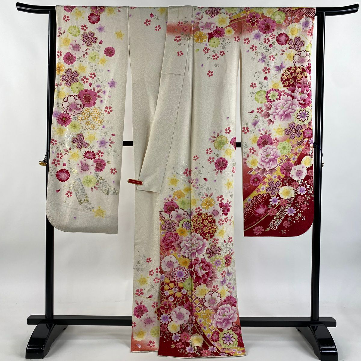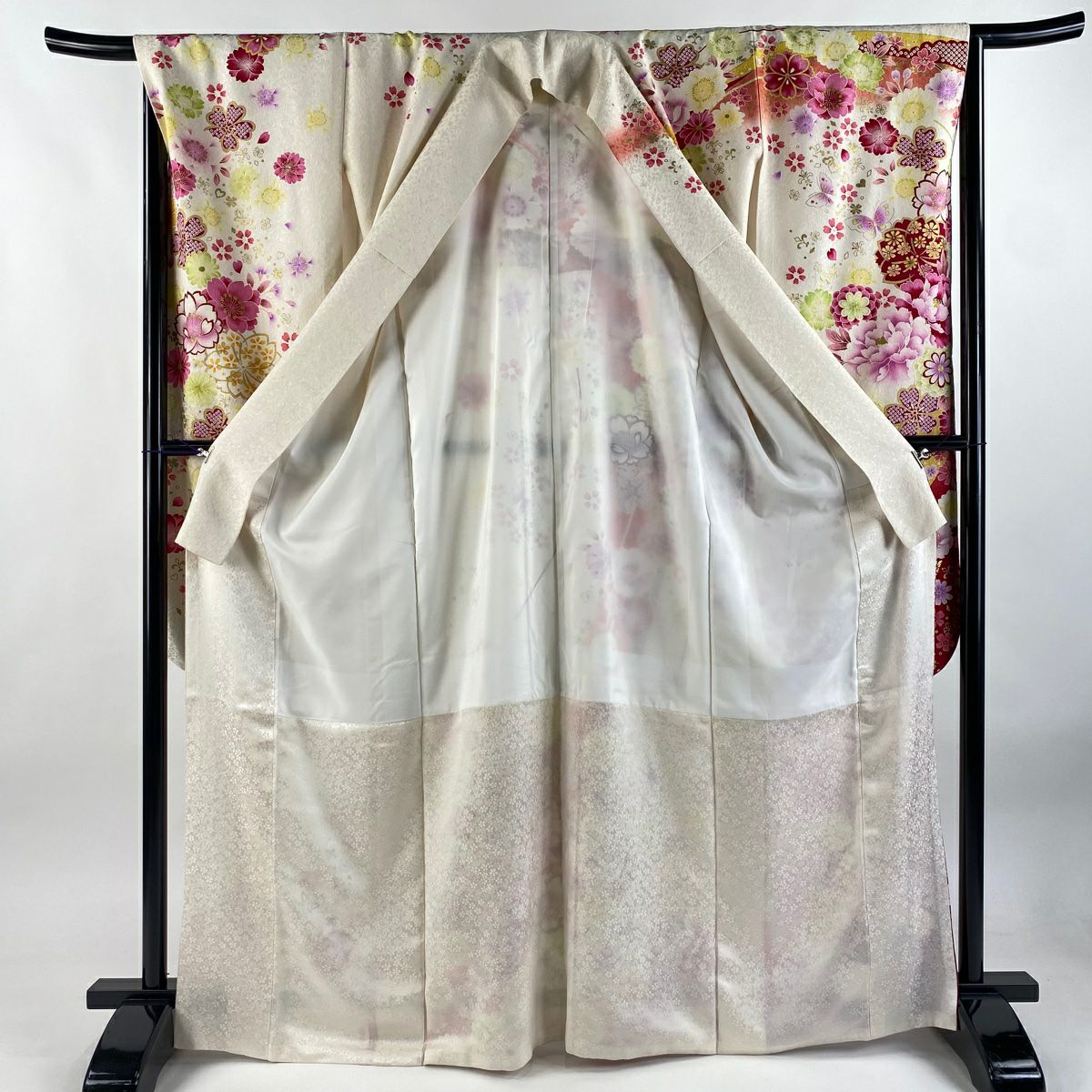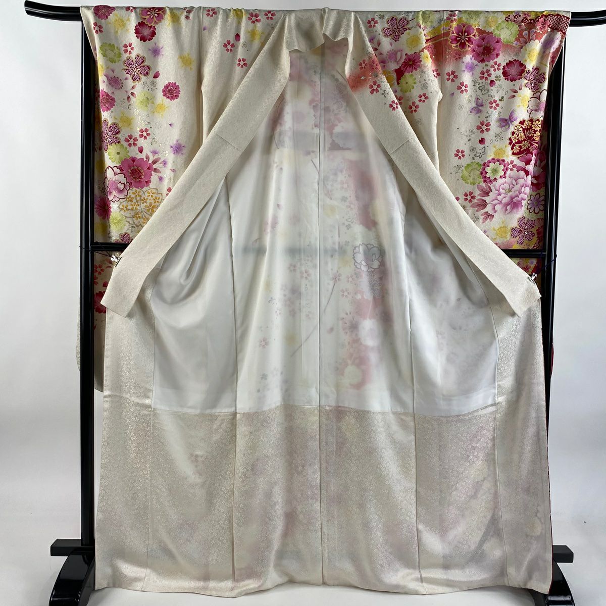 【在庫一掃】 振袖 身丈164.5cm 裄丈67cm M 袷 牡丹 桜 刺繍 銀通し クリーム 正絹 逸品