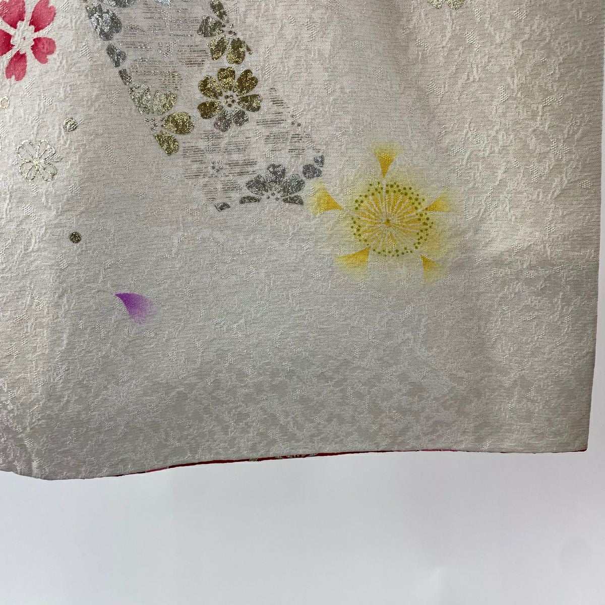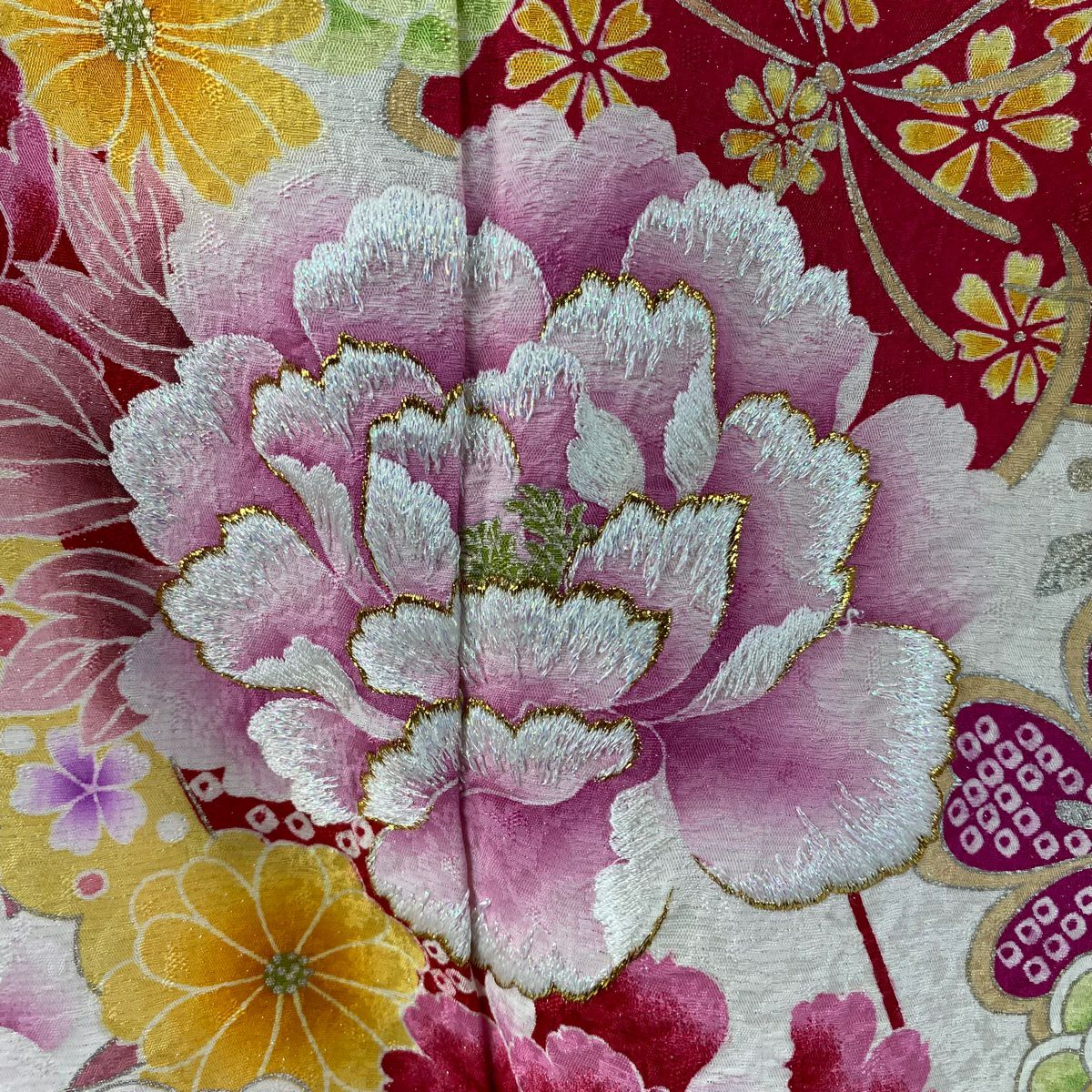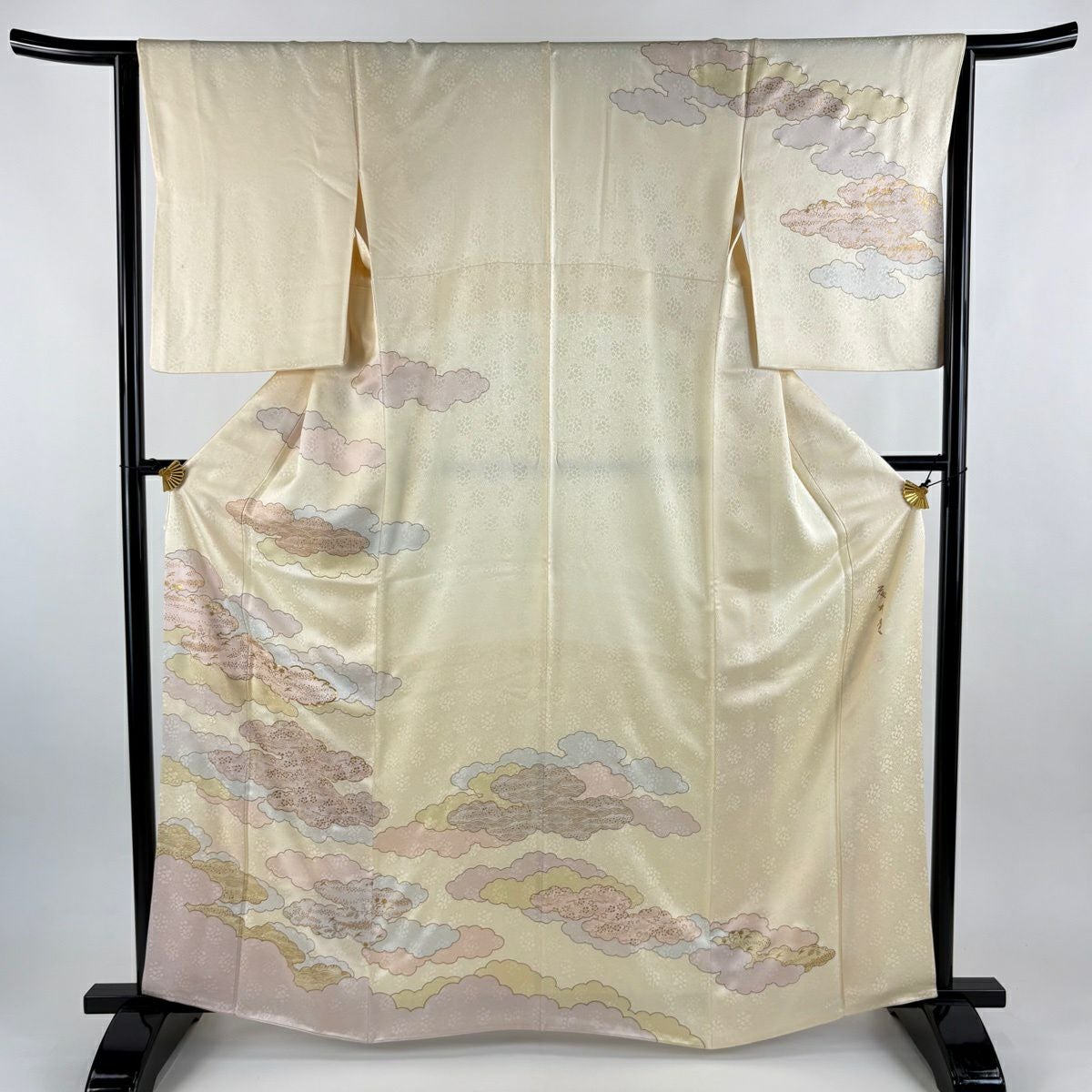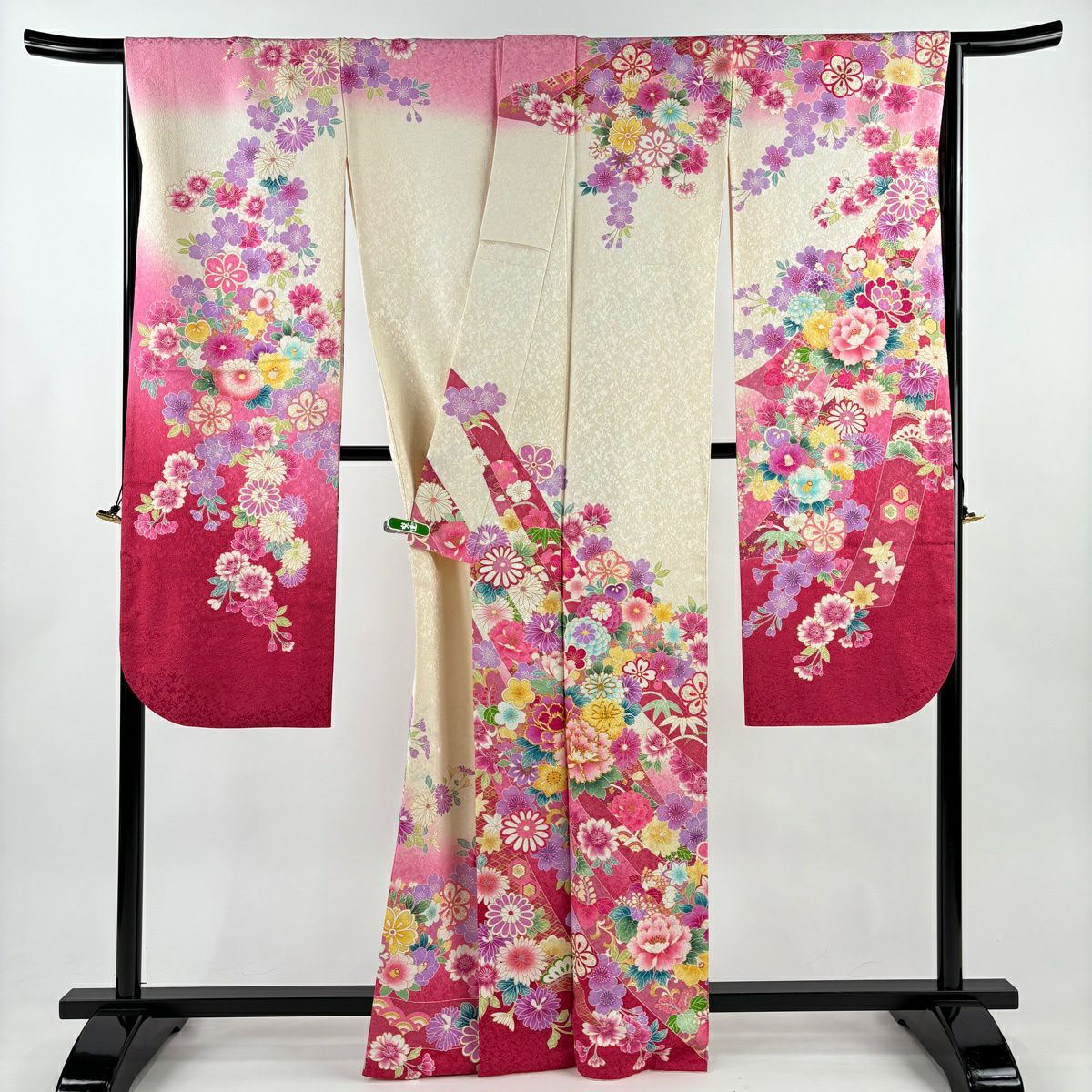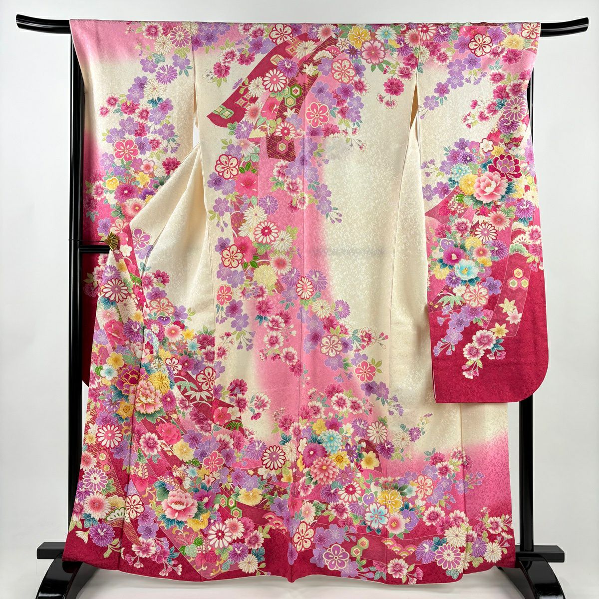 【在庫一掃】 振袖 身丈164.5cm 裄丈67cm M 袷 牡丹 桜 刺繍 銀通し クリーム 正絹 逸品