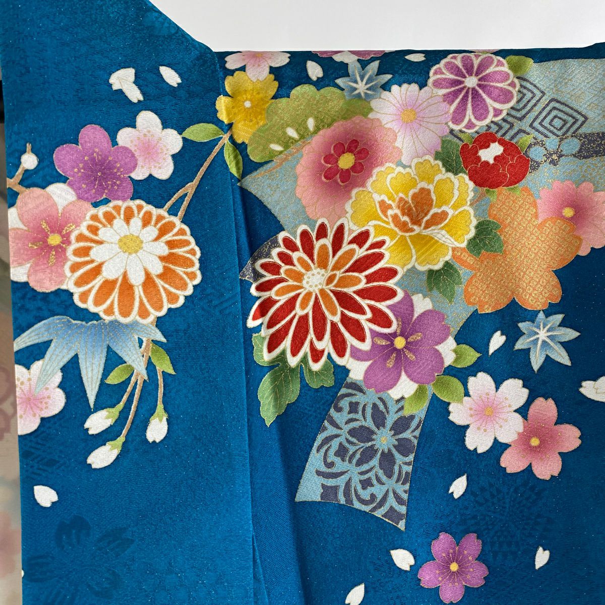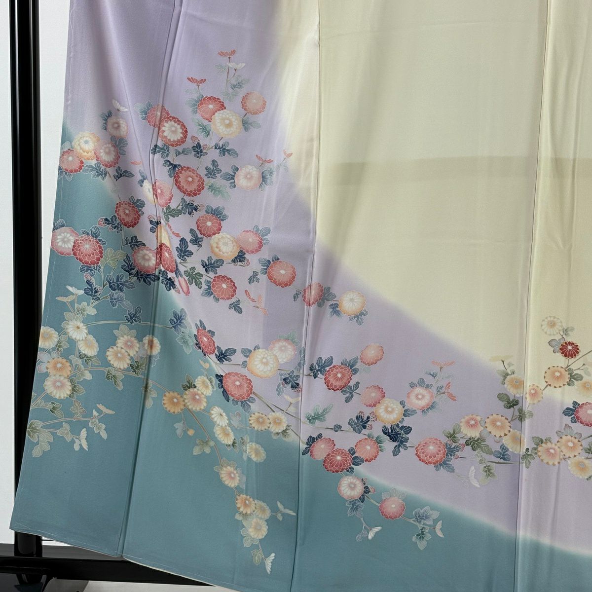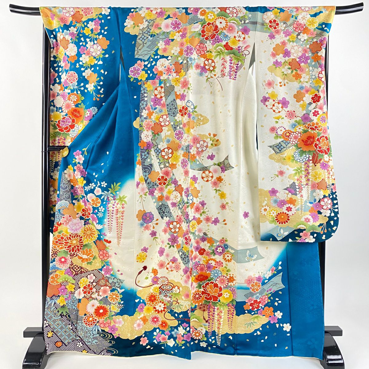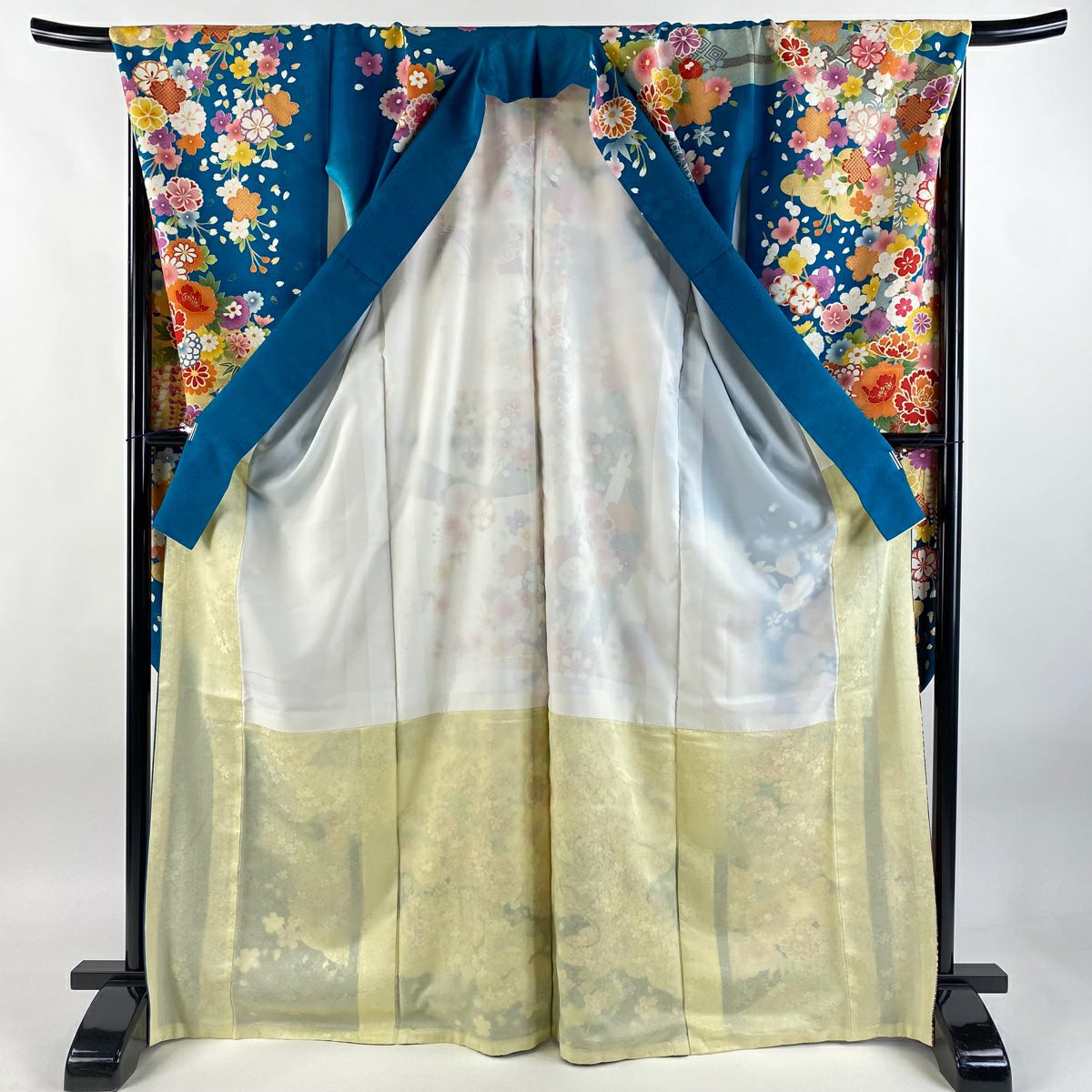 【在庫一掃】 【美品】 振袖 身丈171cm 裄丈67cm M 袷 菊 扇面 銀通し 金糸 青緑 正絹 逸品