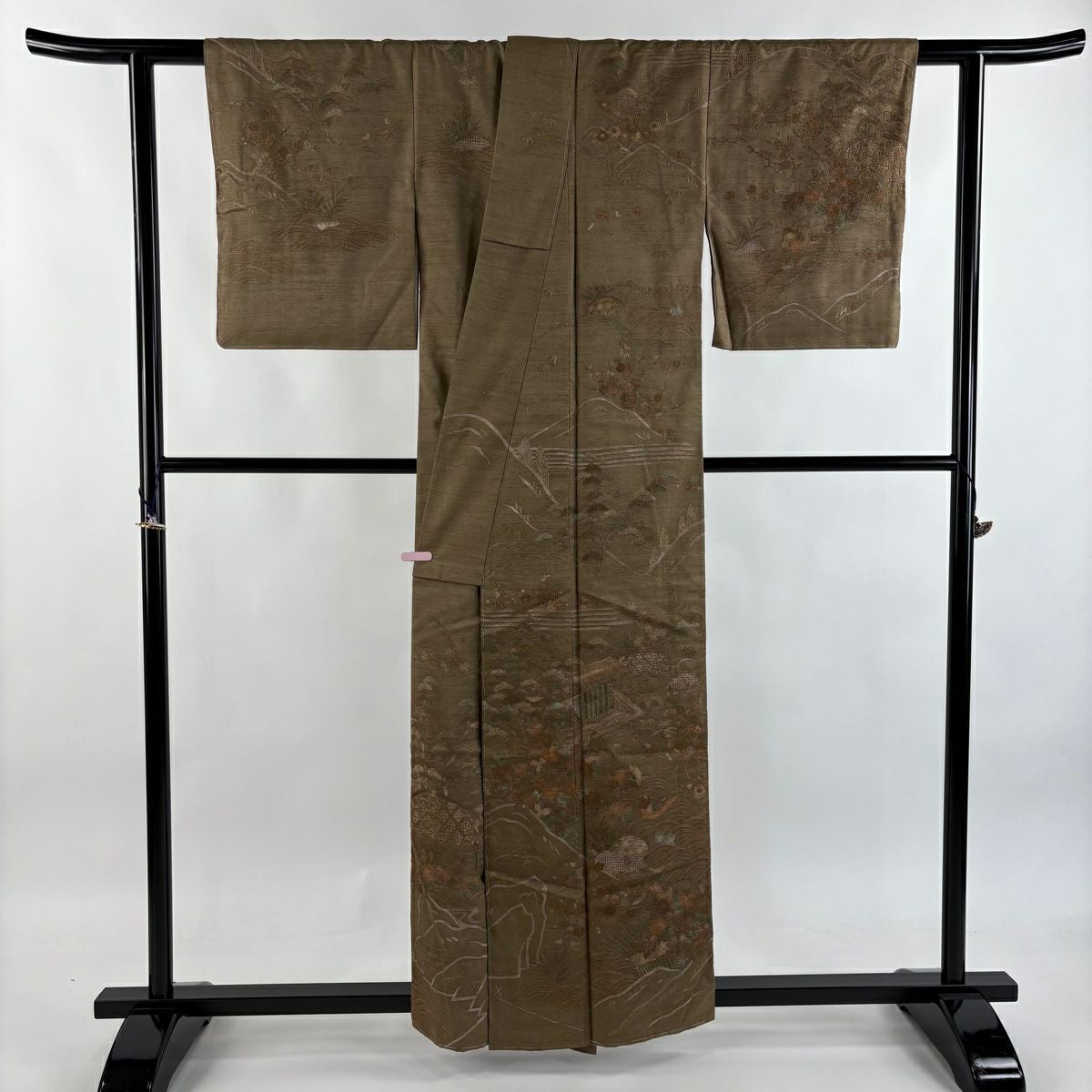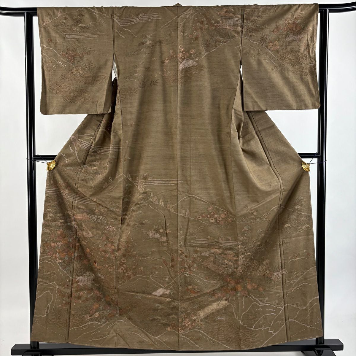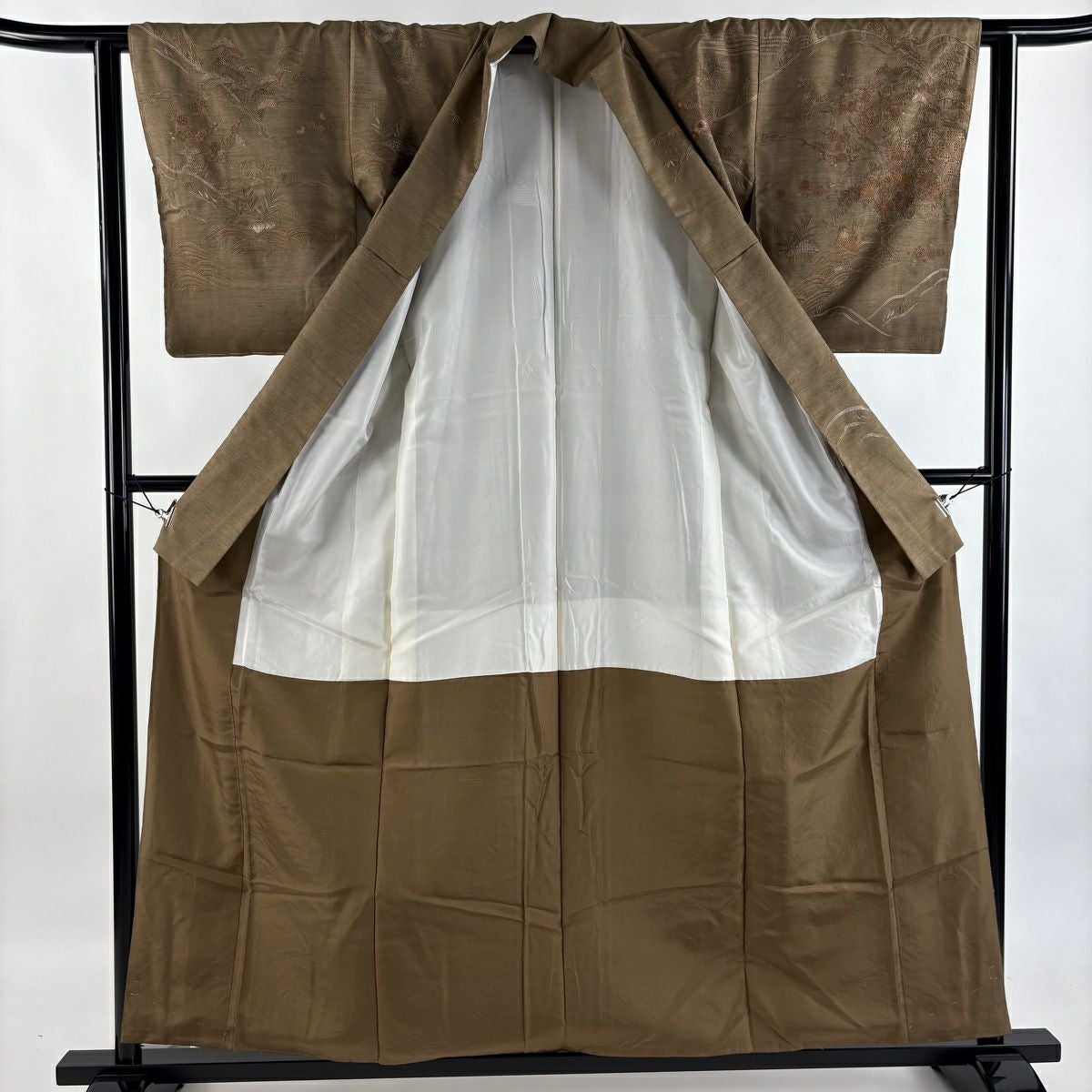 【在庫一掃】 訪問着 身丈158.5cm 裄丈61.5cm S 袷 紬地 鴛鴦 松竹梅 刺繍 茶色 正絹 逸品