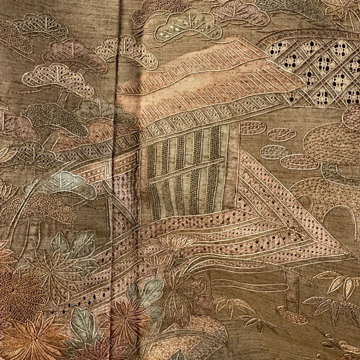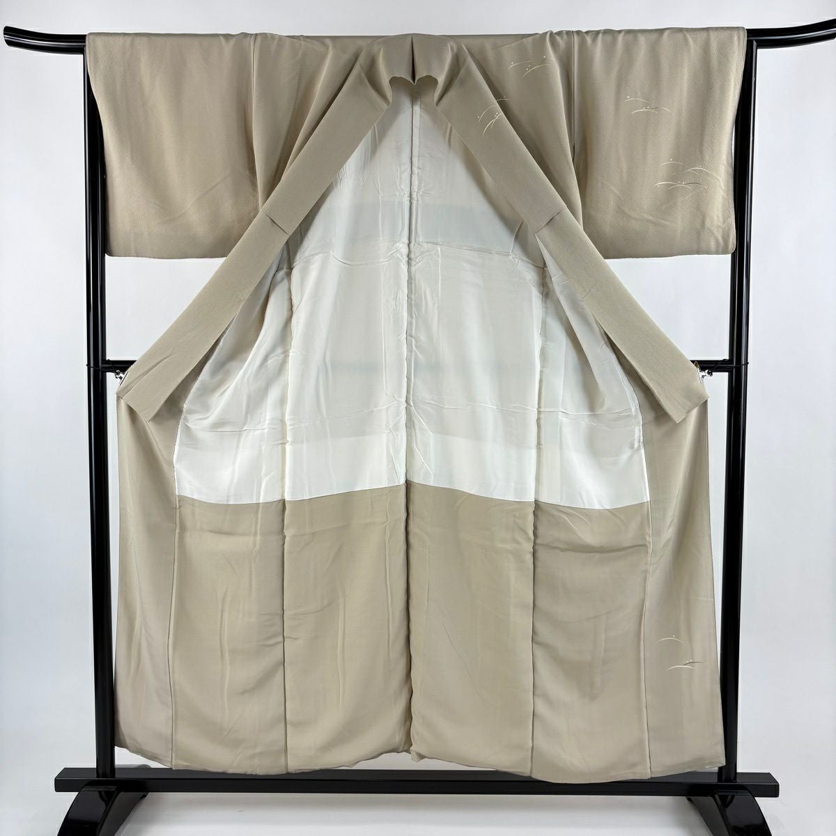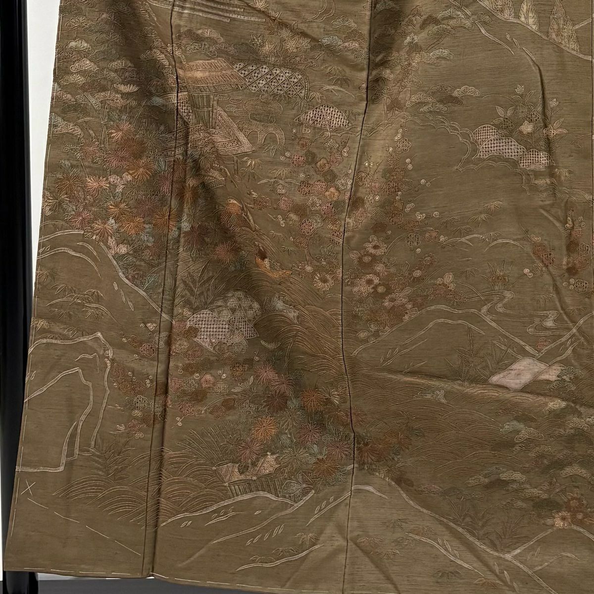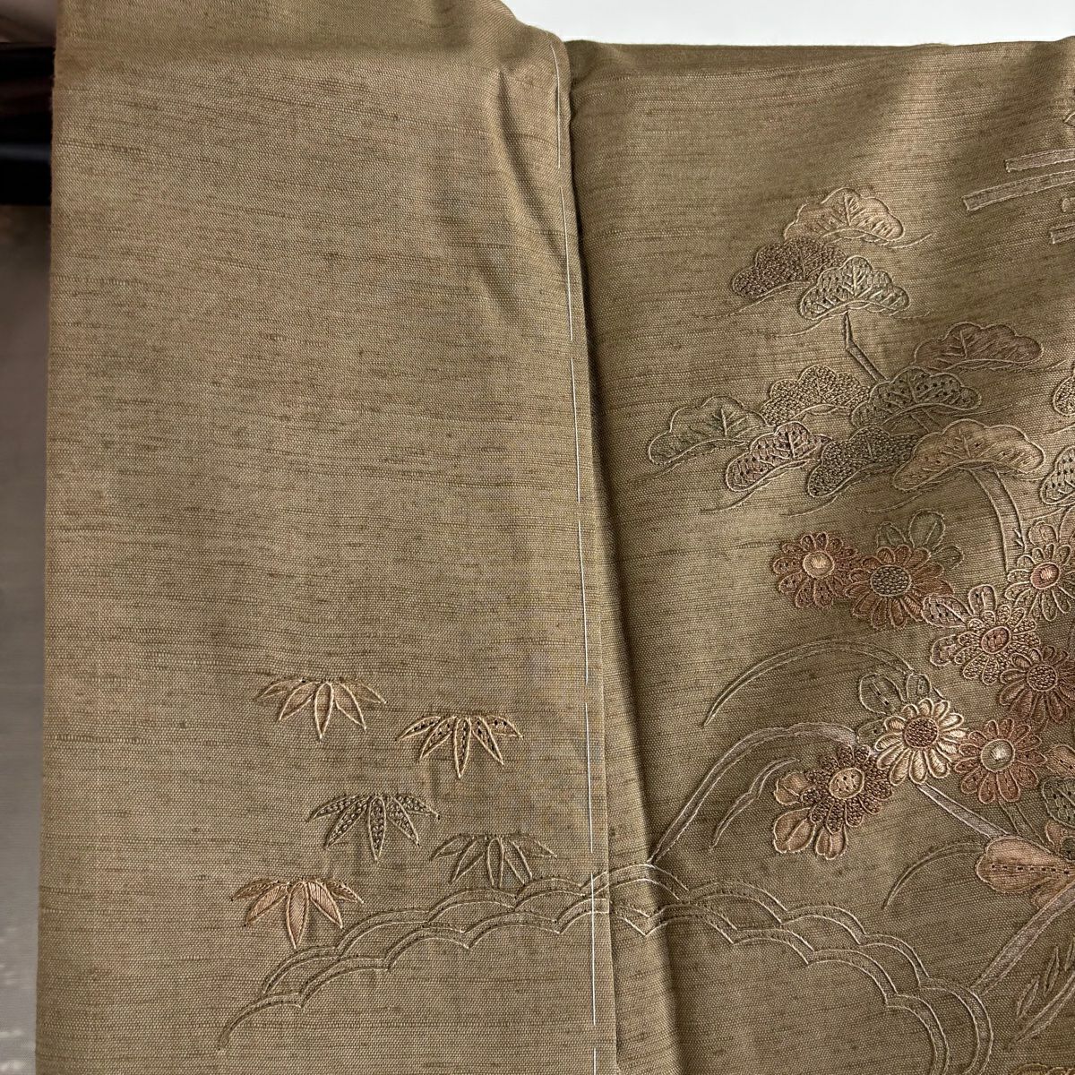 【在庫一掃】 訪問着 身丈158.5cm 裄丈61.5cm S 袷 紬地 鴛鴦 松竹梅 刺繍 茶色 正絹 逸品