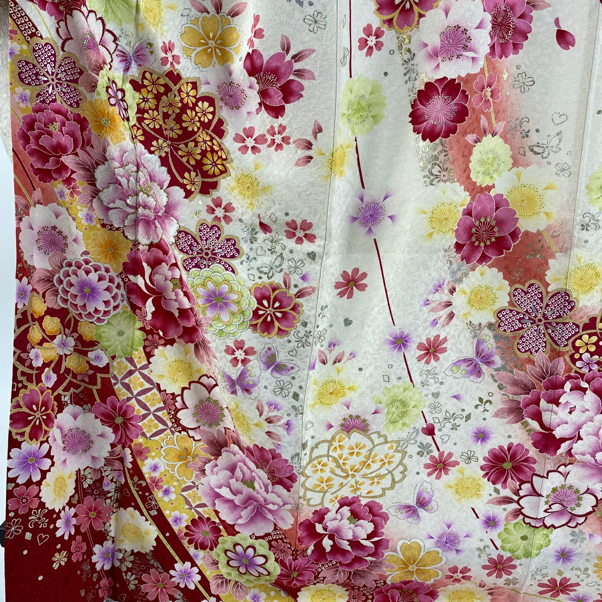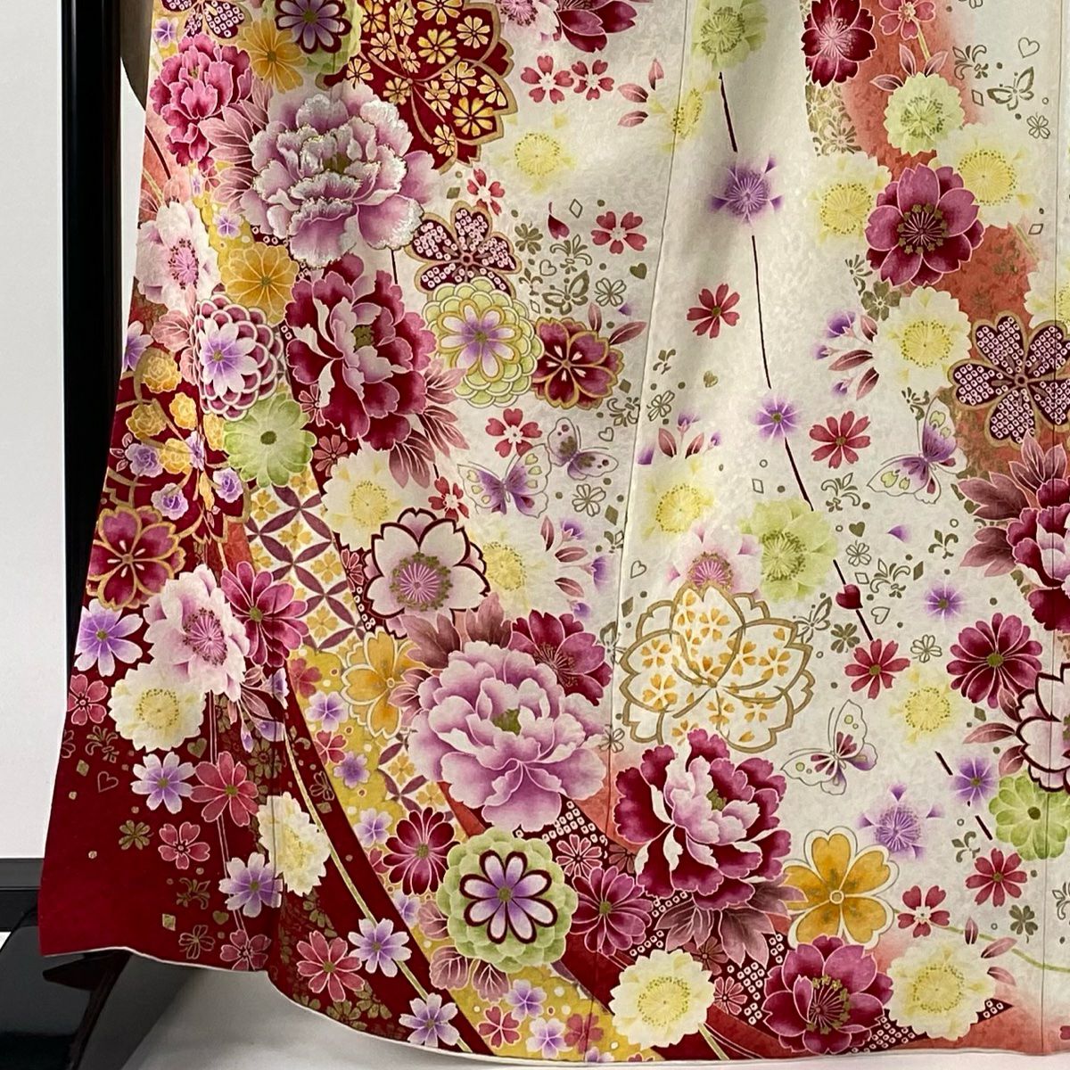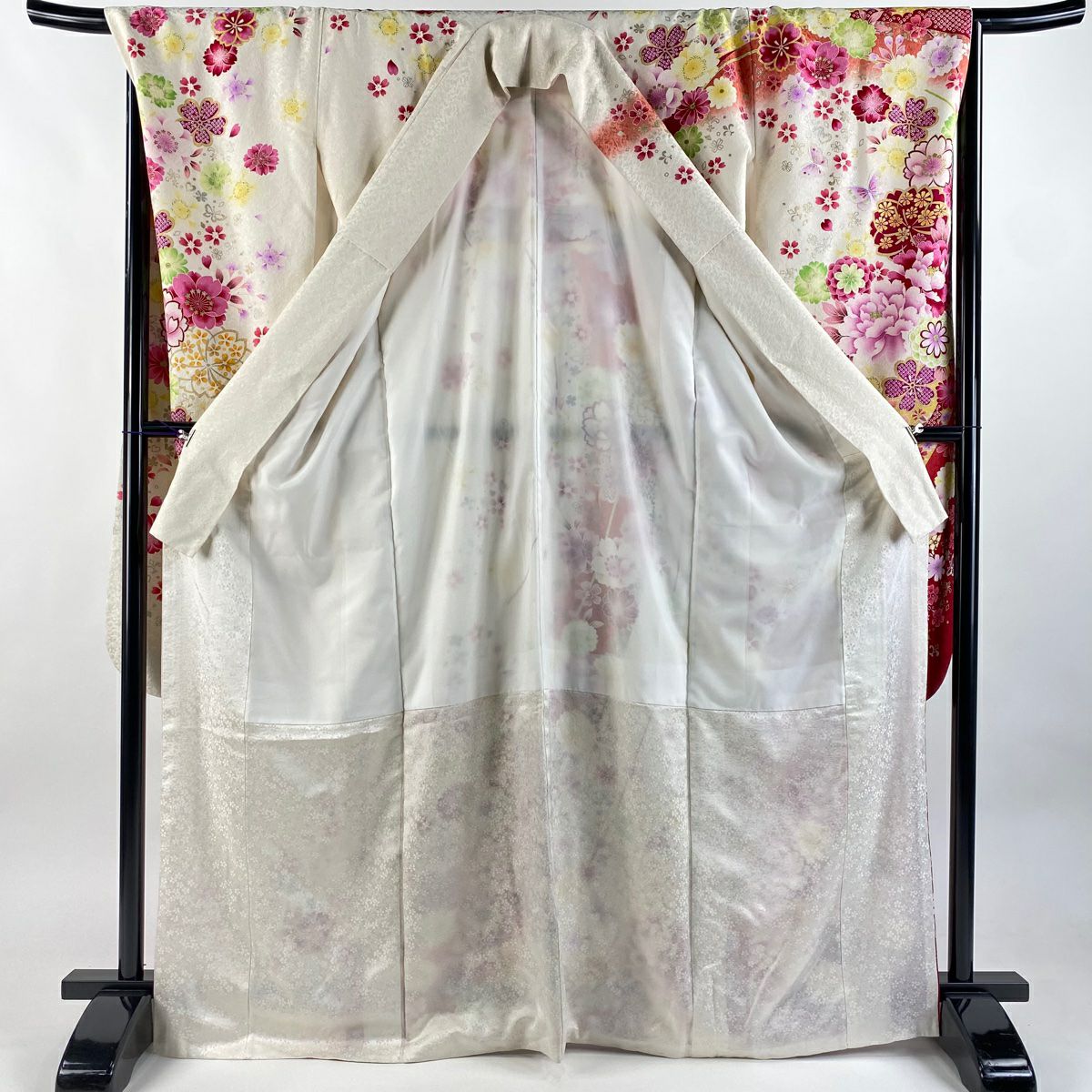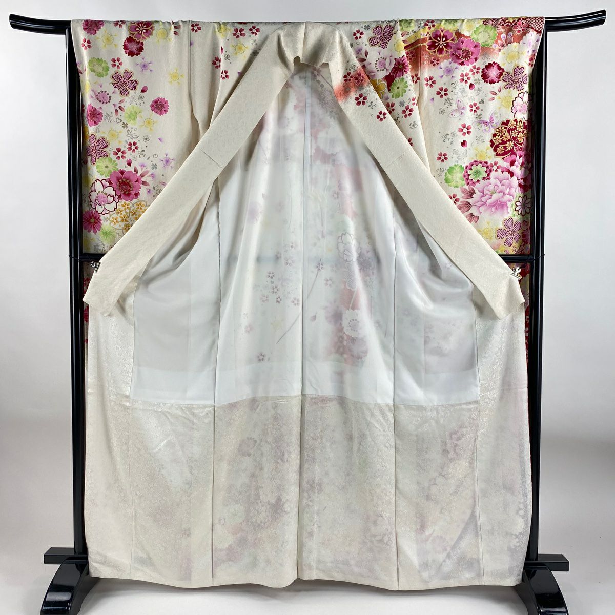【在庫一掃】 振袖 身丈166cm 裄丈66.5cm M 袷 牡丹 蝶 銀通し 金彩 クリーム 正絹 逸品