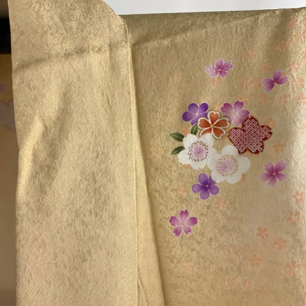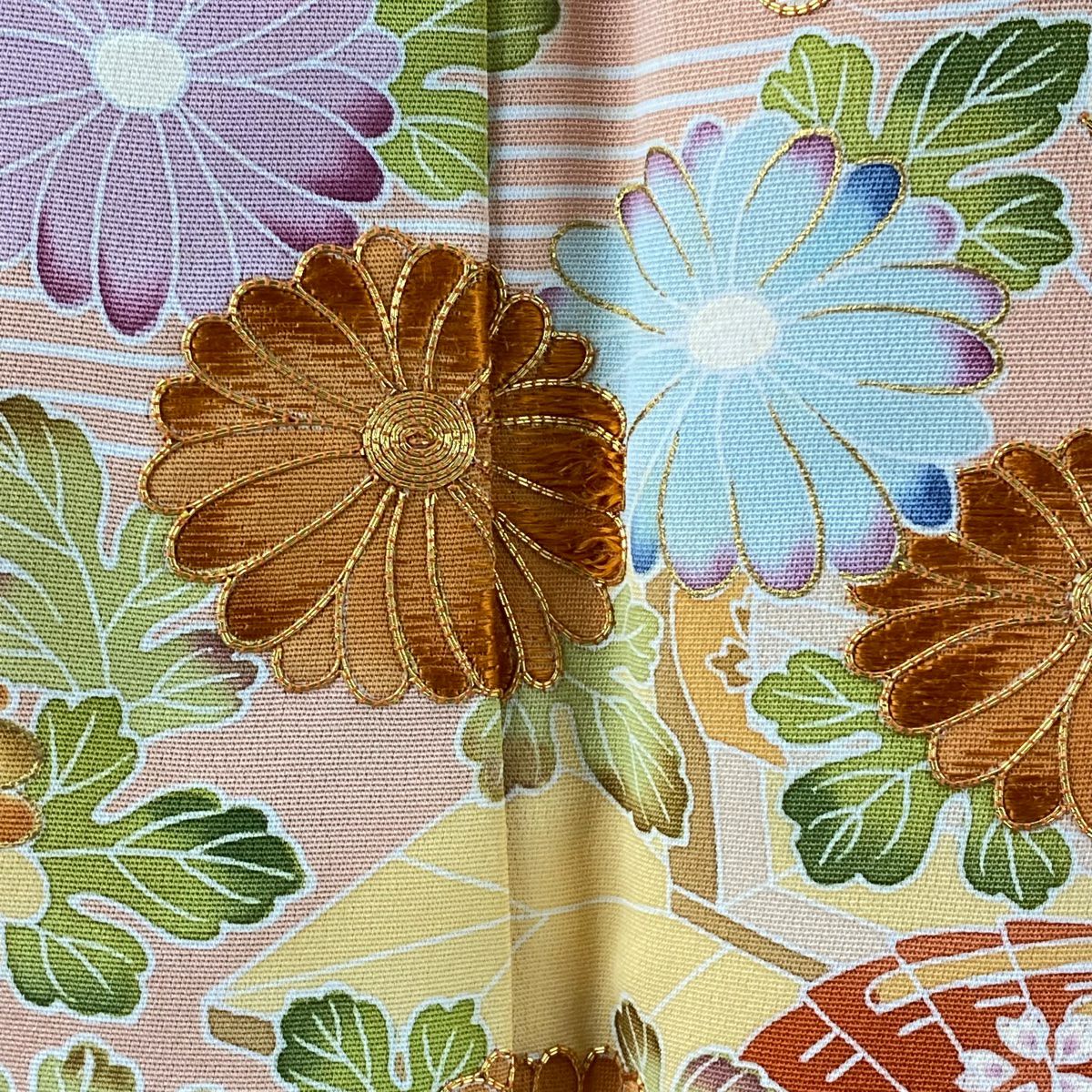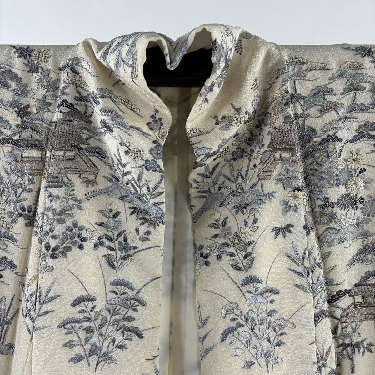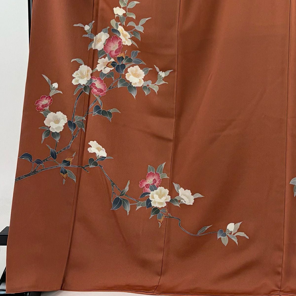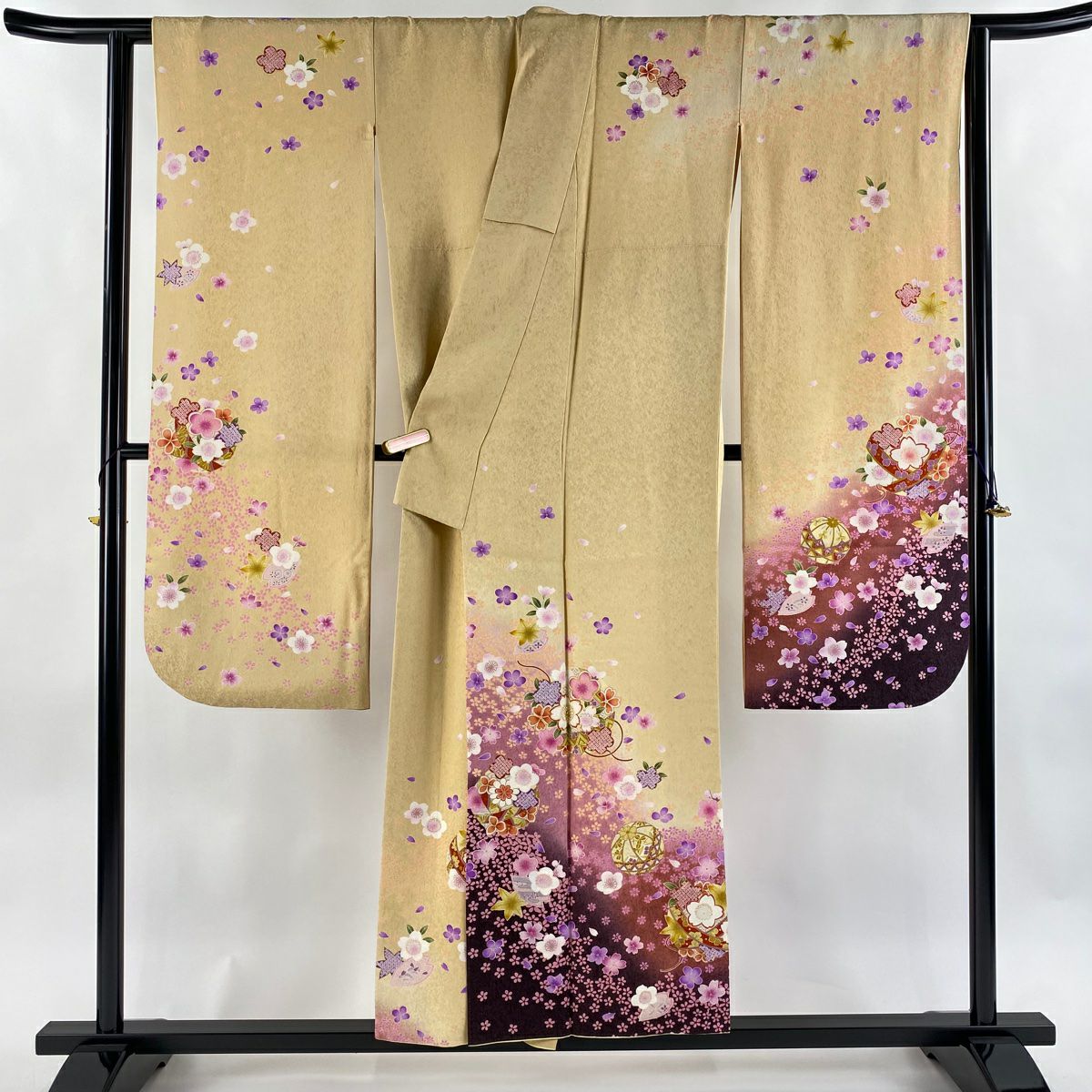 色留袖 身丈159cm 裄丈63cm S 袷 千總 落款あり 草花 刺繍 金糸 薄黄土色 正絹 逸品 三つ紋
