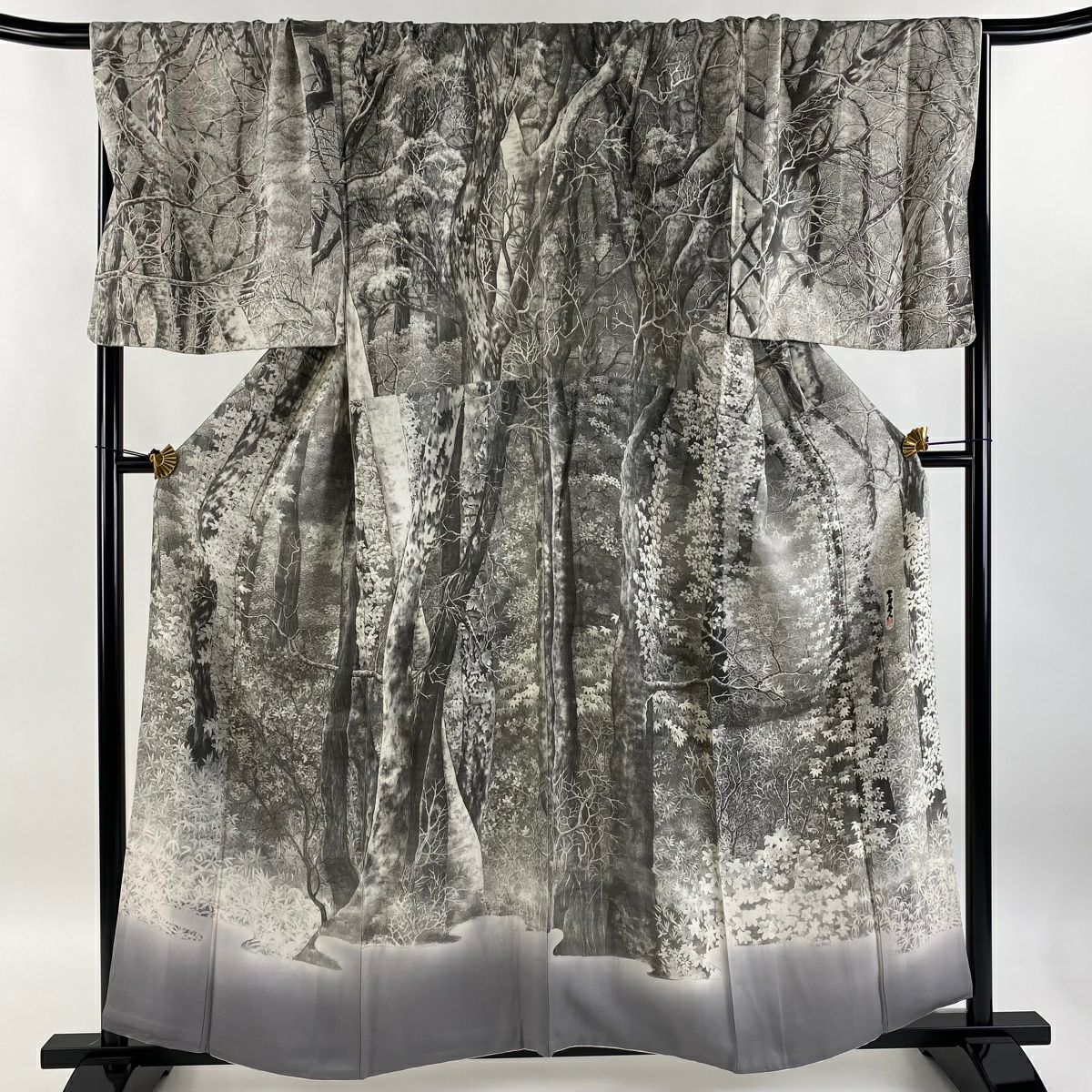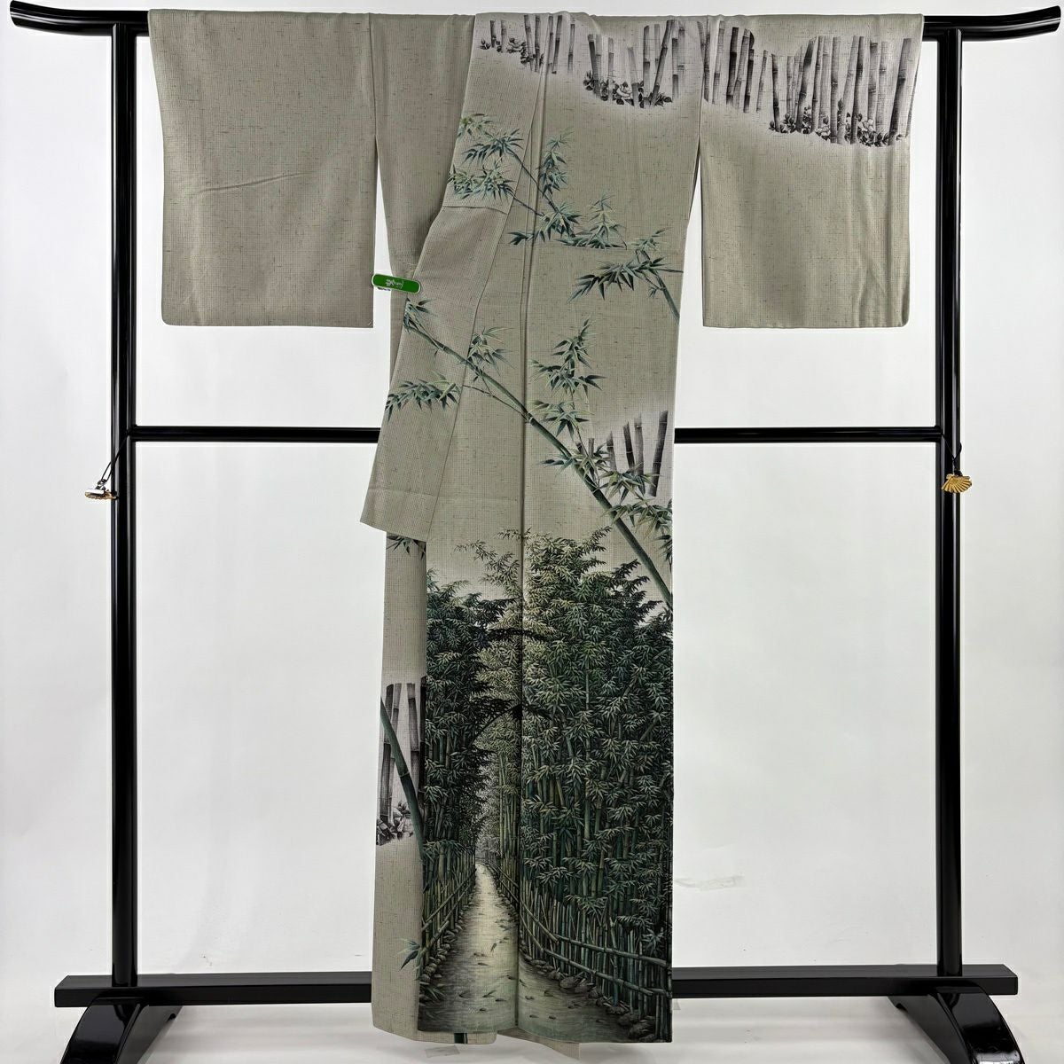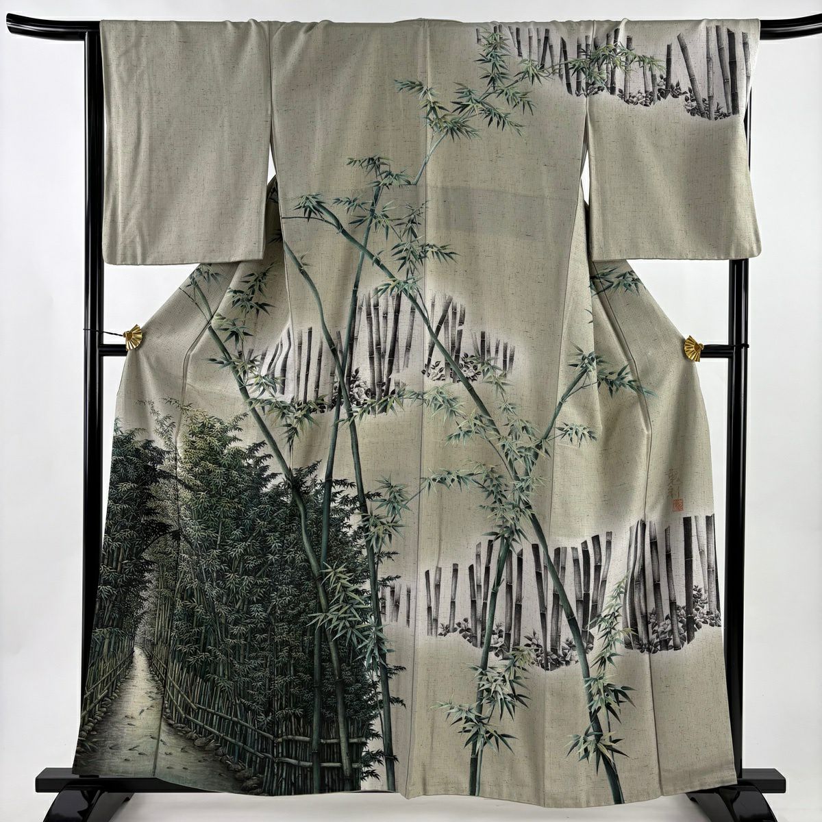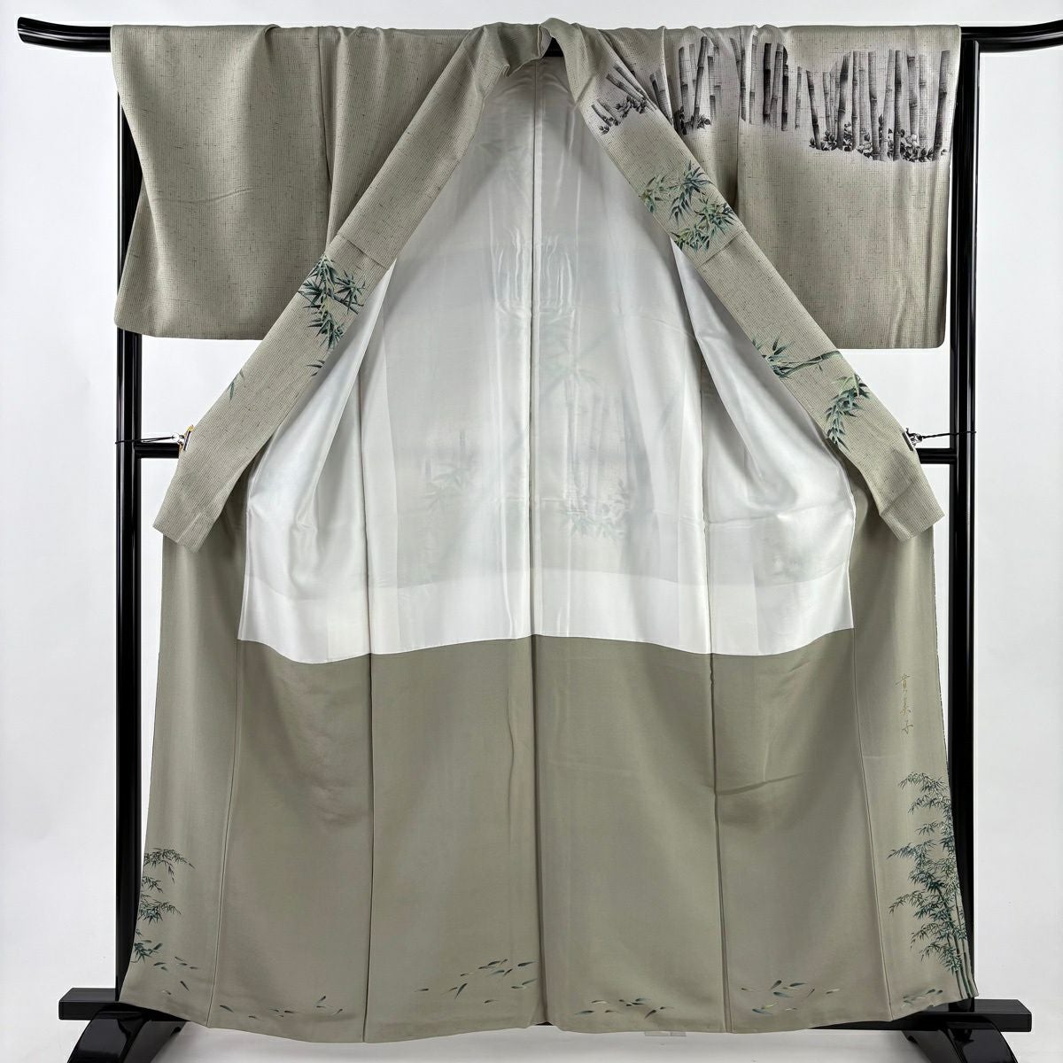 【美品】 訪問着 身丈160cm 裄丈67cm M 袷 紬地 田家鬼彩 落款あり 竹林 椿 灰緑 正絹 逸品