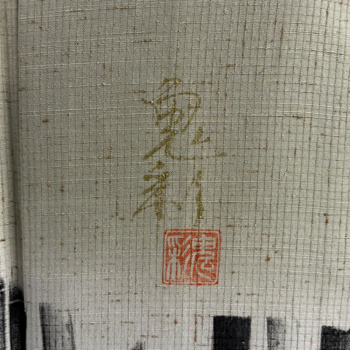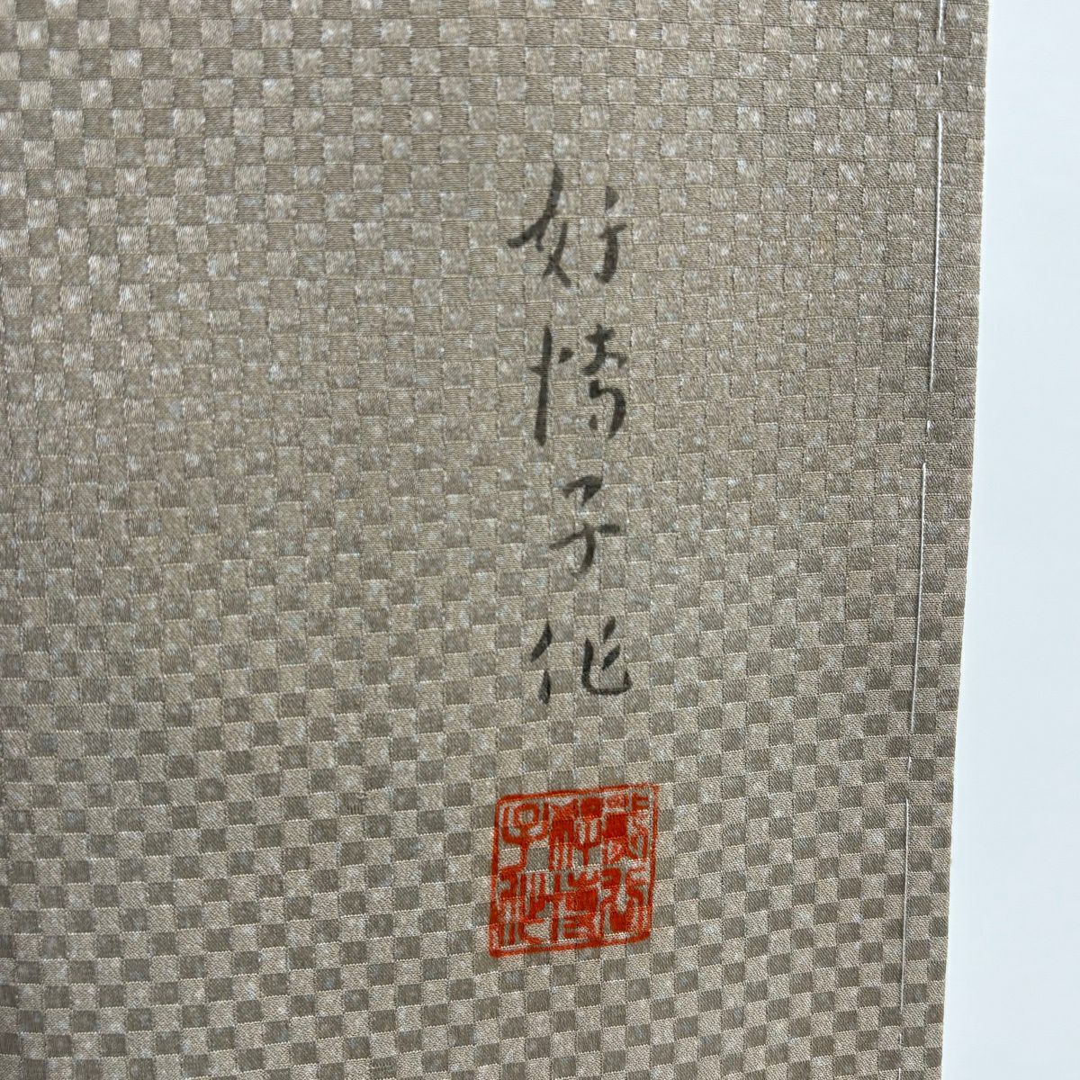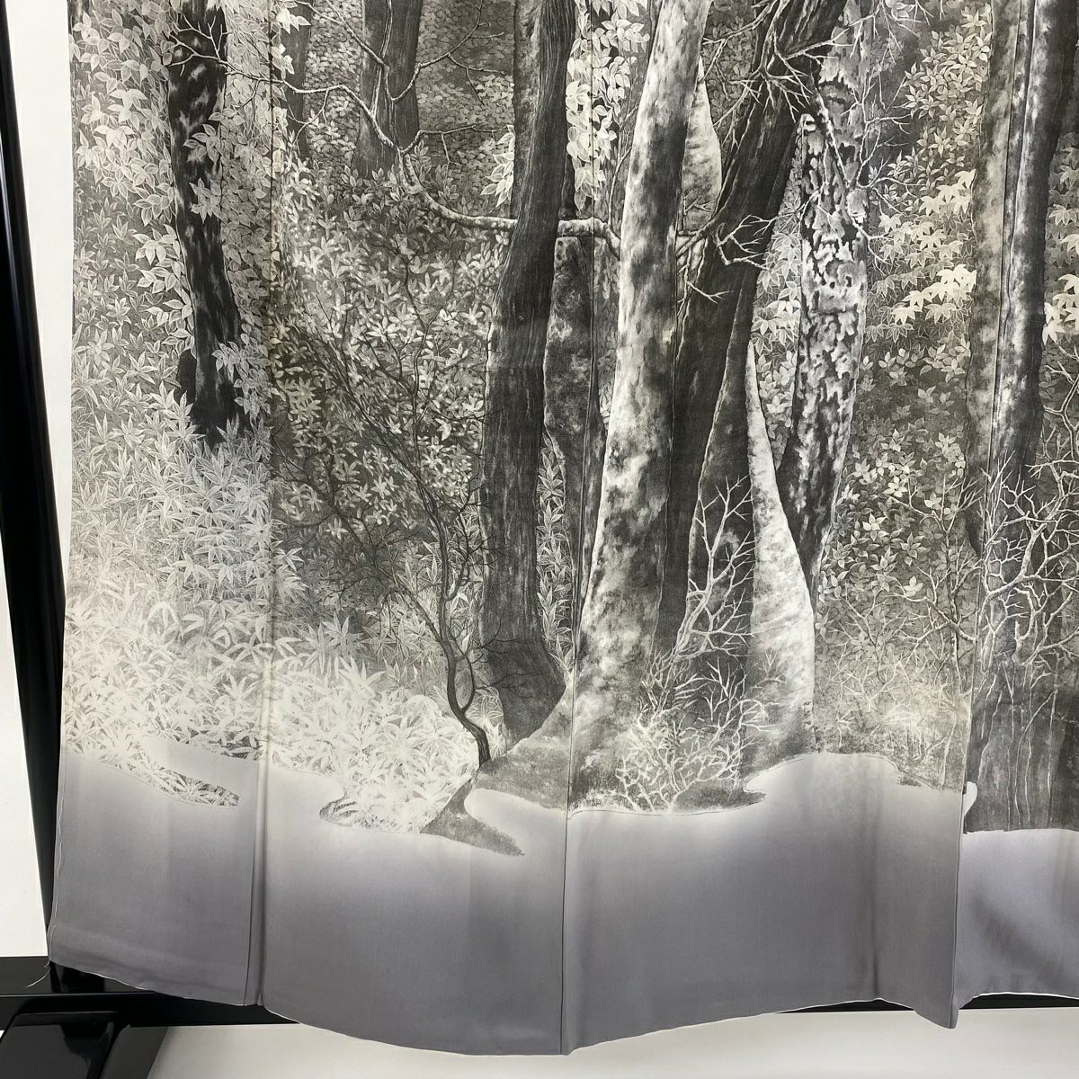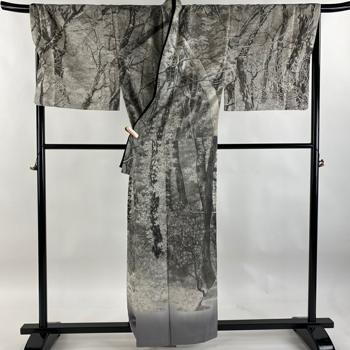 【美品】 訪問着 身丈160cm 裄丈67cm M 袷 紬地 田家鬼彩 落款あり 竹林 椿 灰緑 正絹 逸品