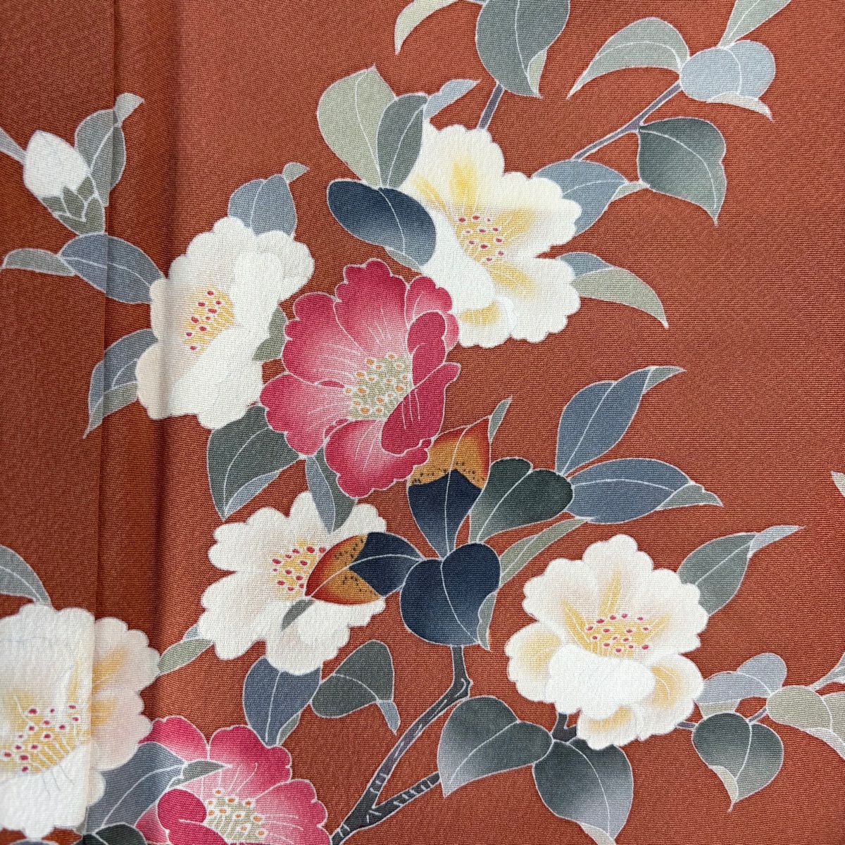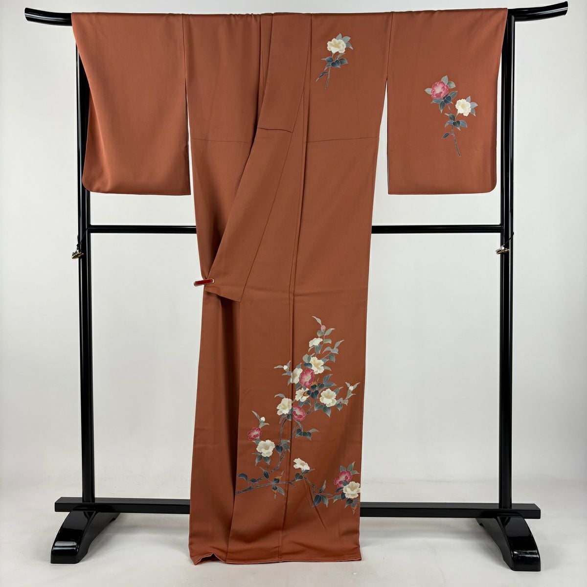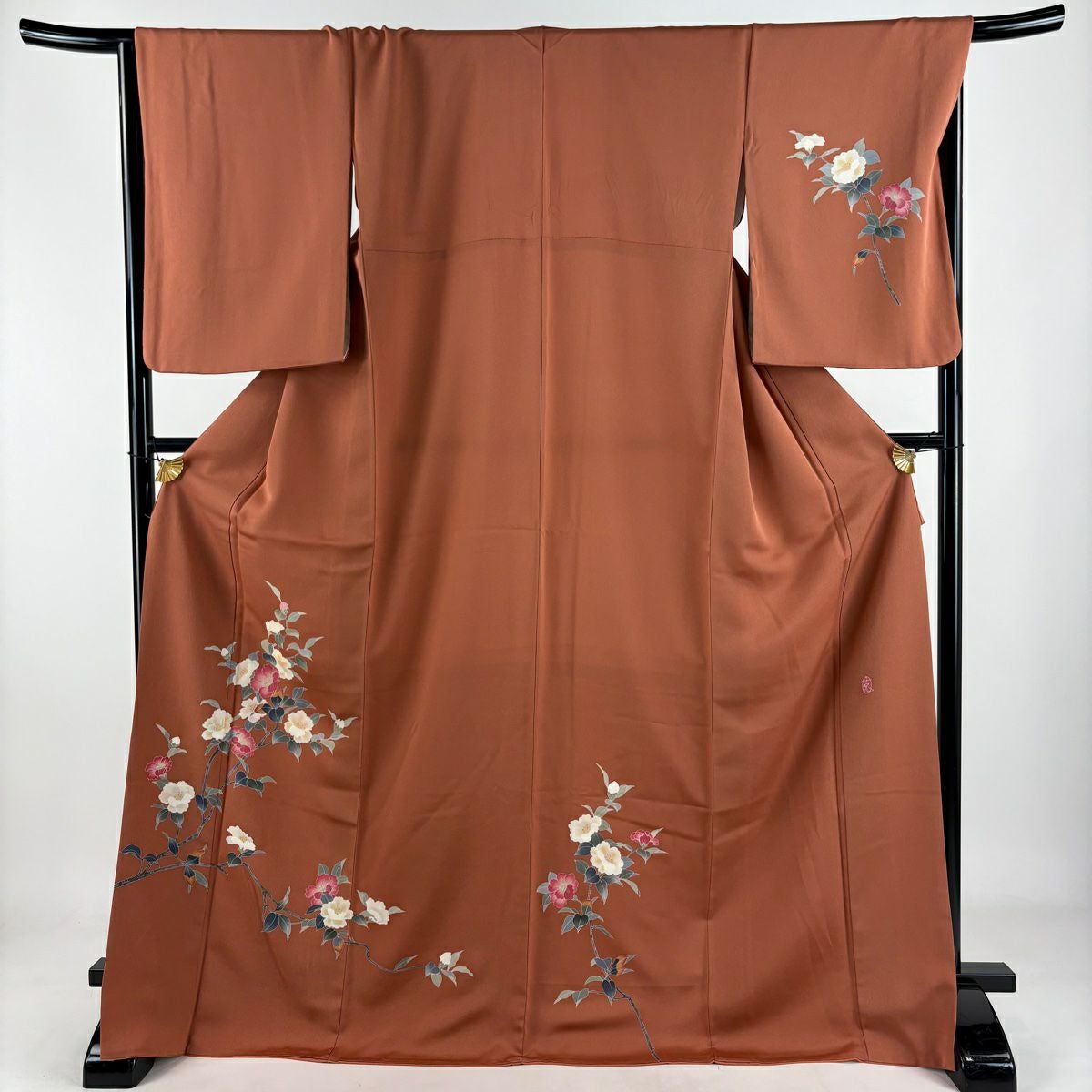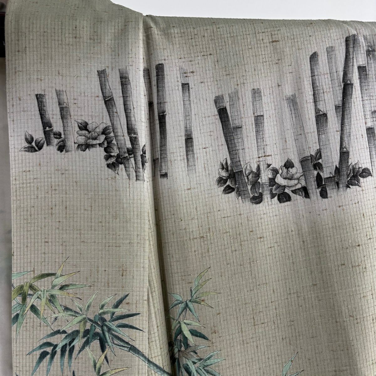 【美品】 訪問着 身丈160cm 裄丈67cm M 袷 紬地 田家鬼彩 落款あり 竹林 椿 灰緑 正絹 逸品