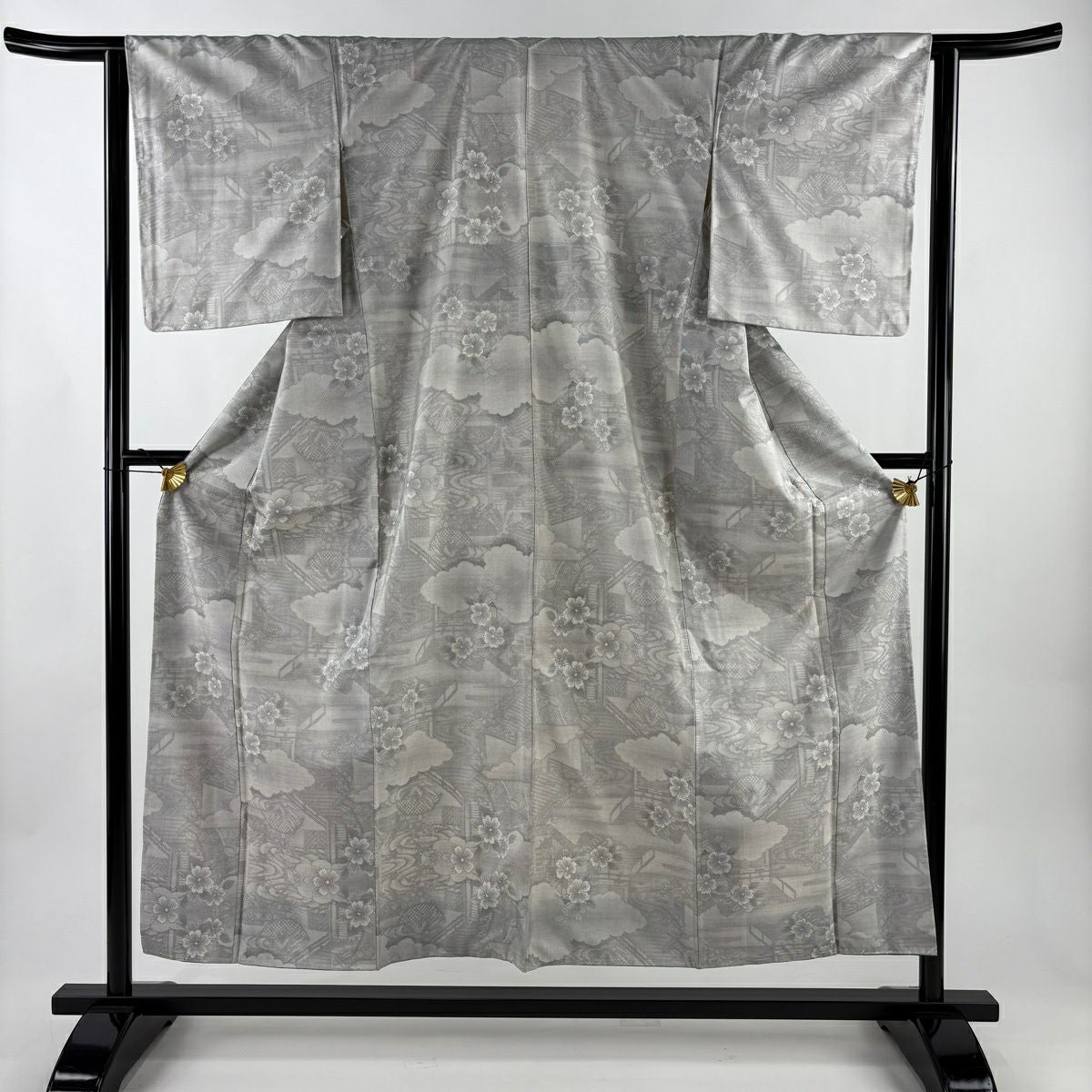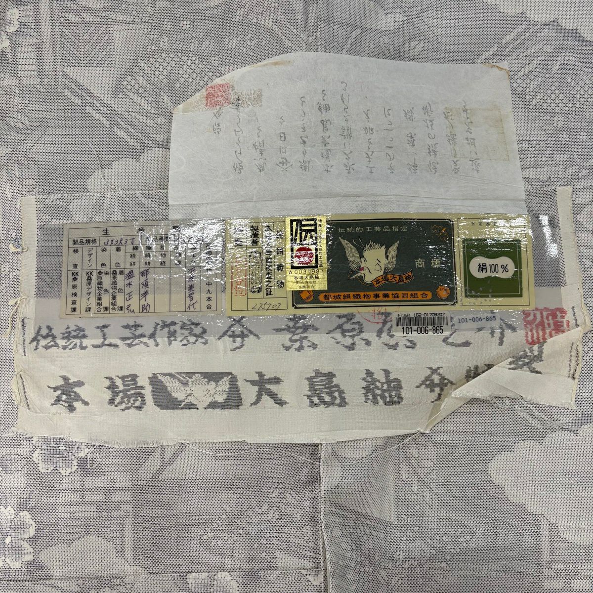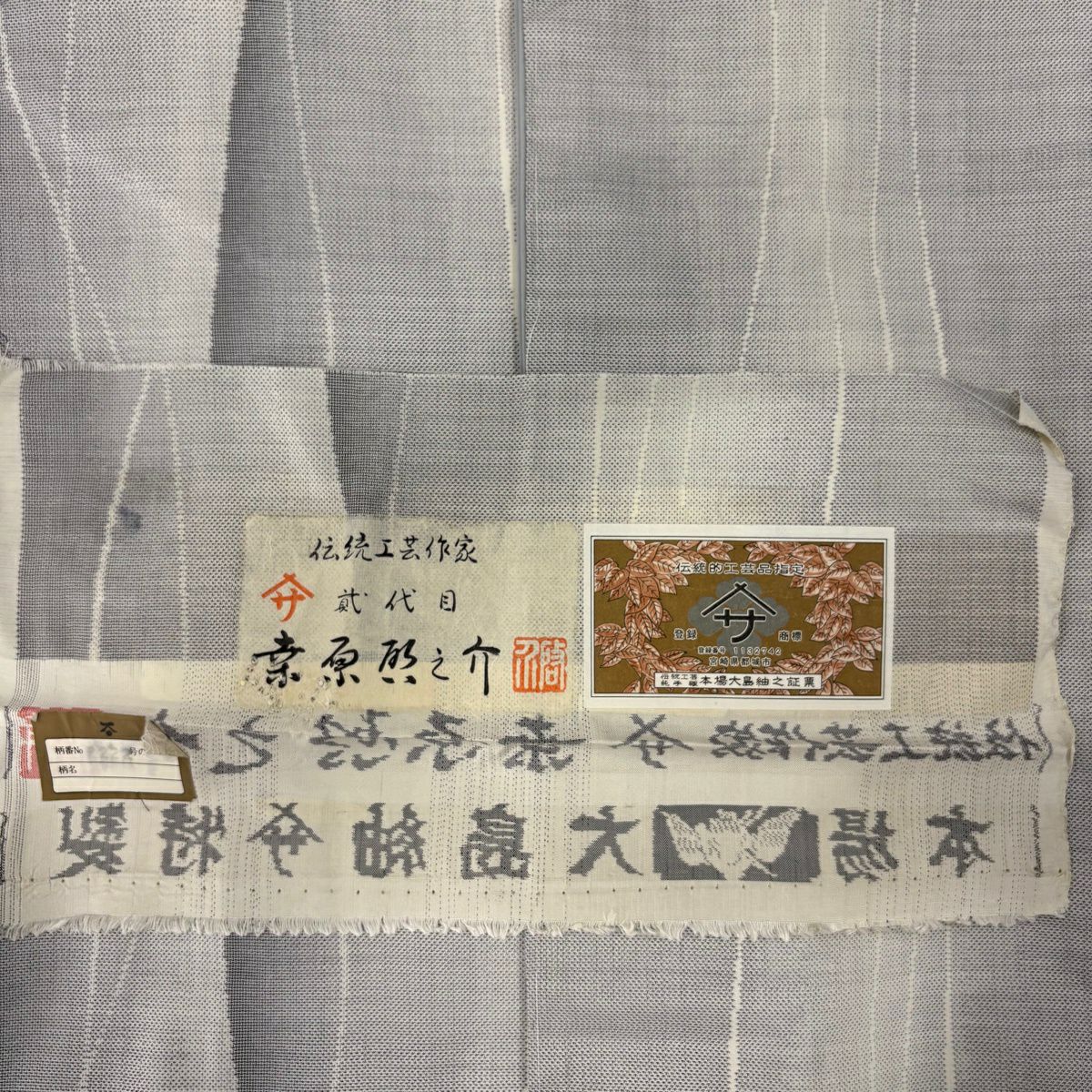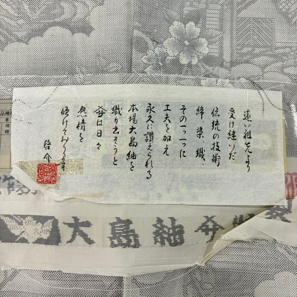 大島紬 身丈154cm 裄丈63.5cm S 袷 桑原啓之介 落款あり 証紙あり 雲文 草花 灰白 正絹 逸品