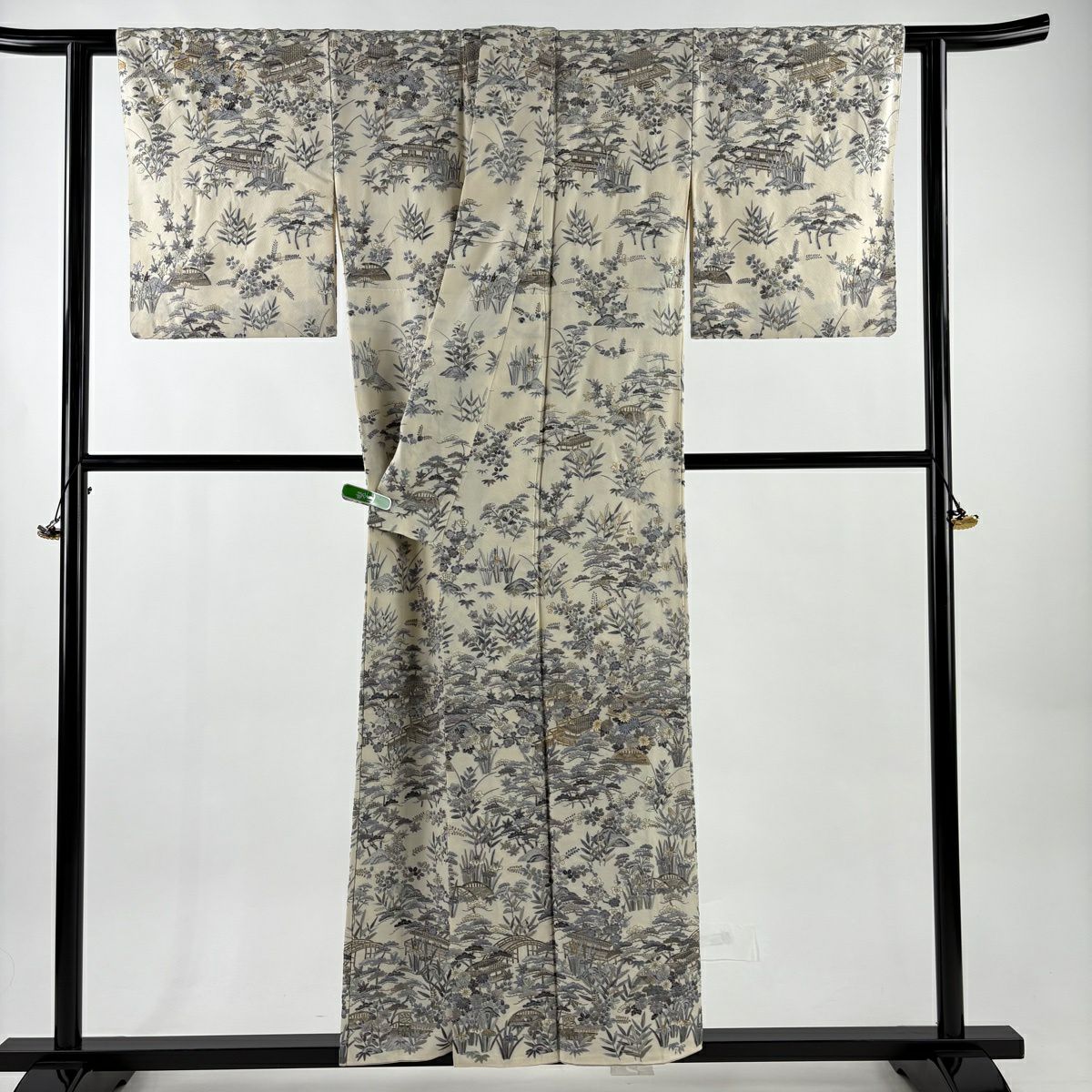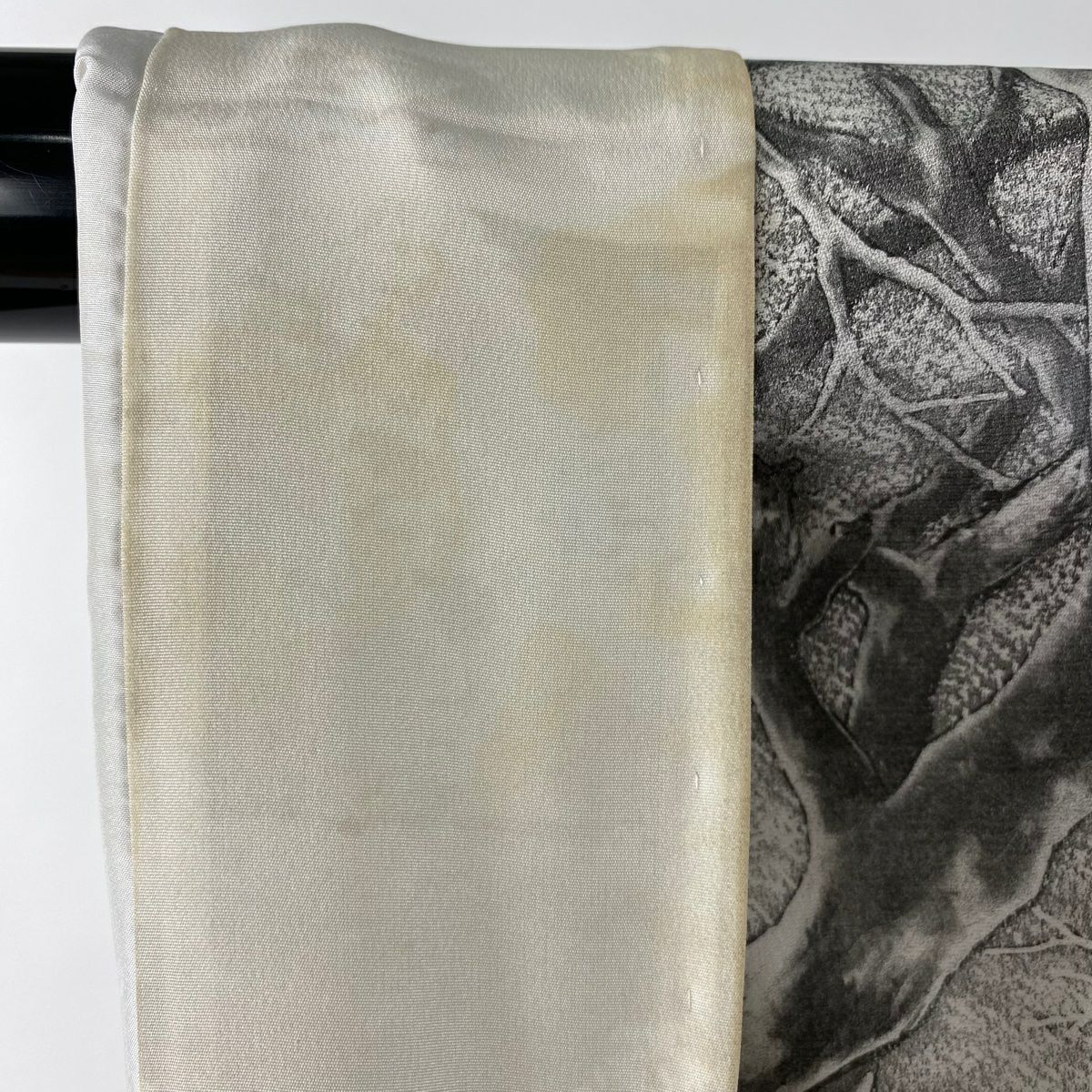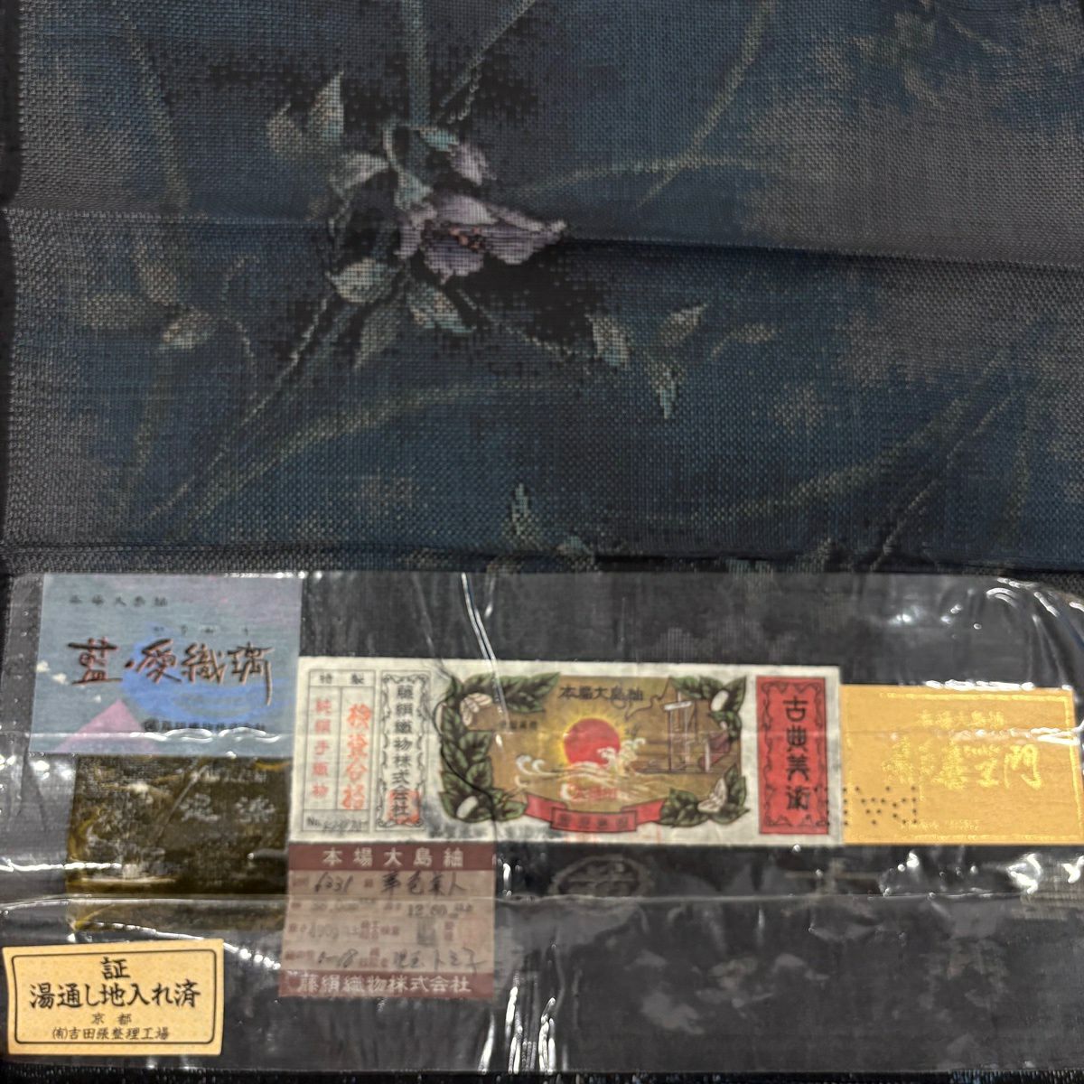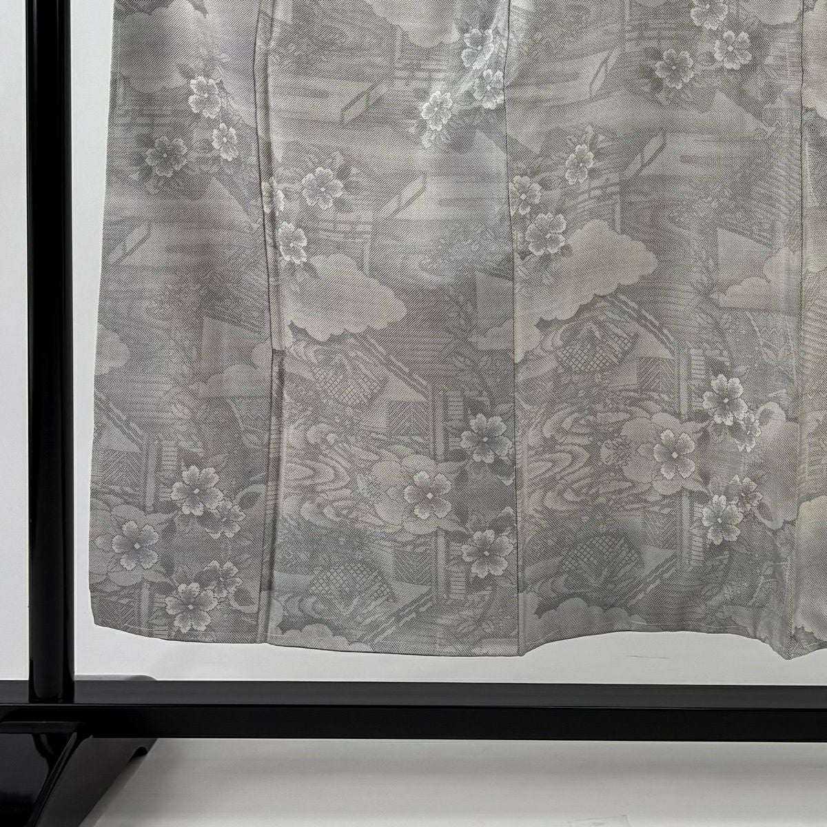 大島紬 身丈154cm 裄丈63.5cm S 袷 桑原啓之介 落款あり 証紙あり 雲文 草花 灰白 正絹 逸品