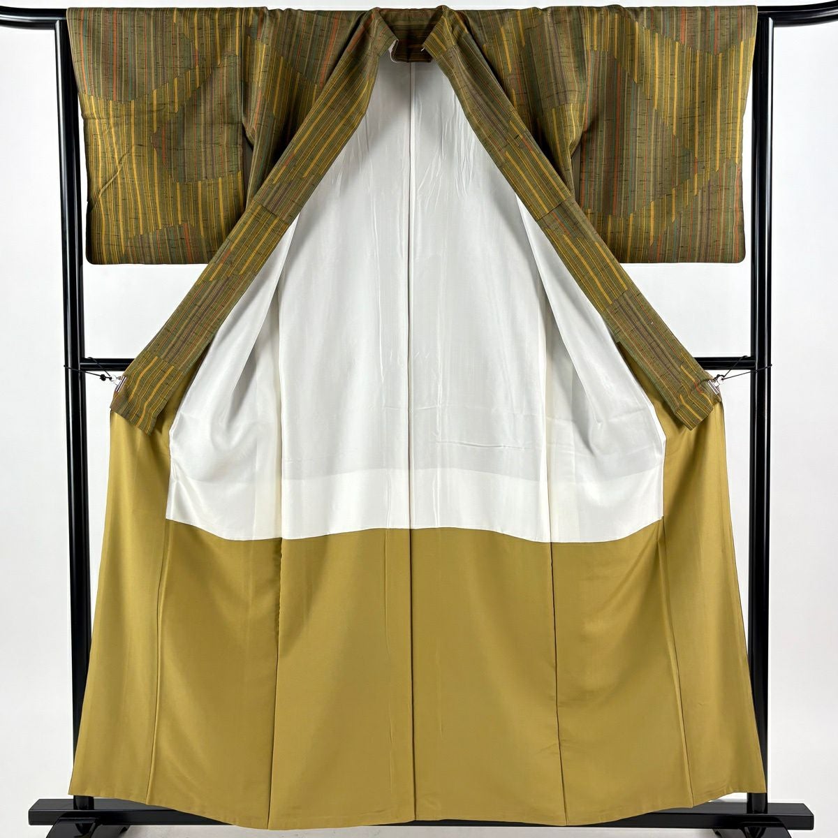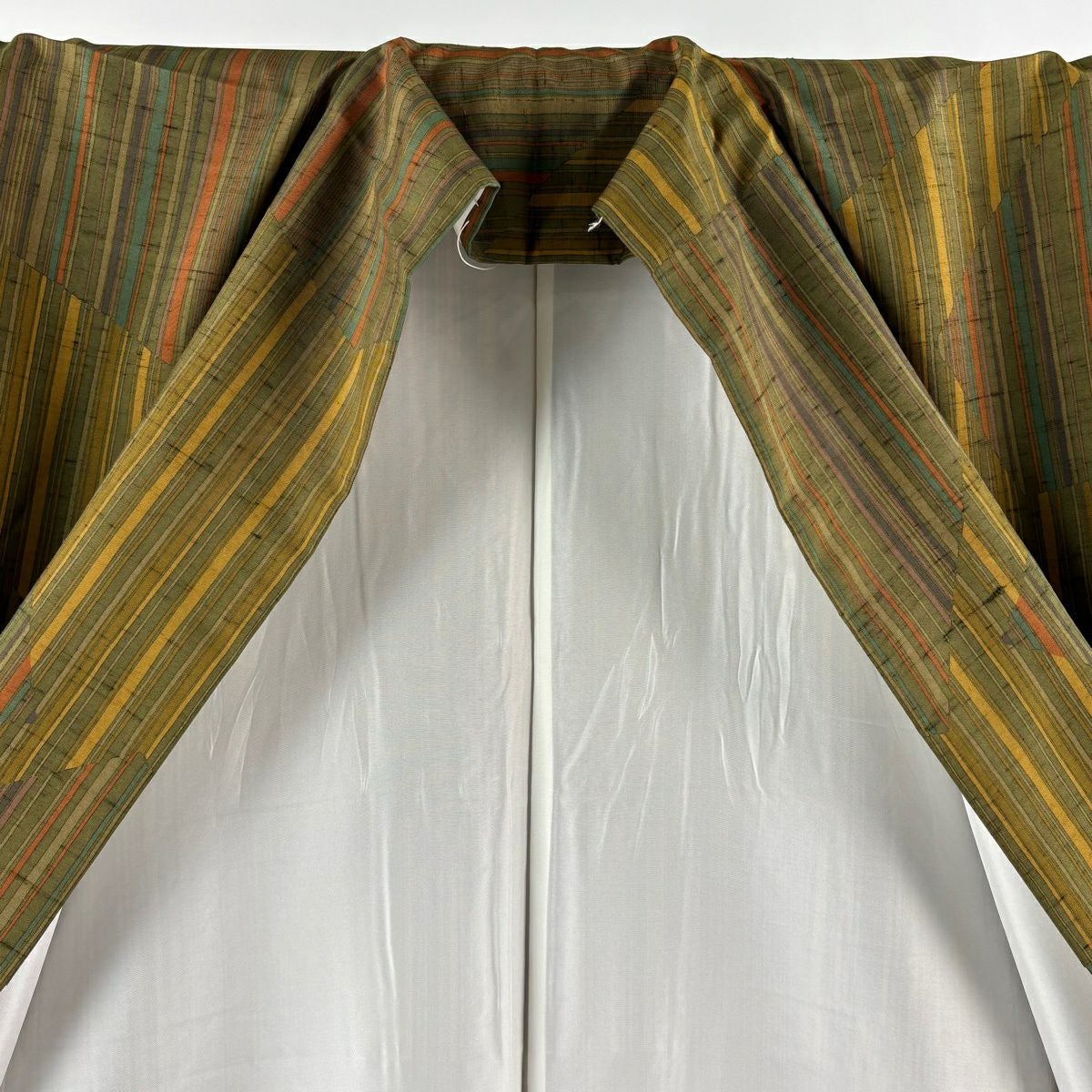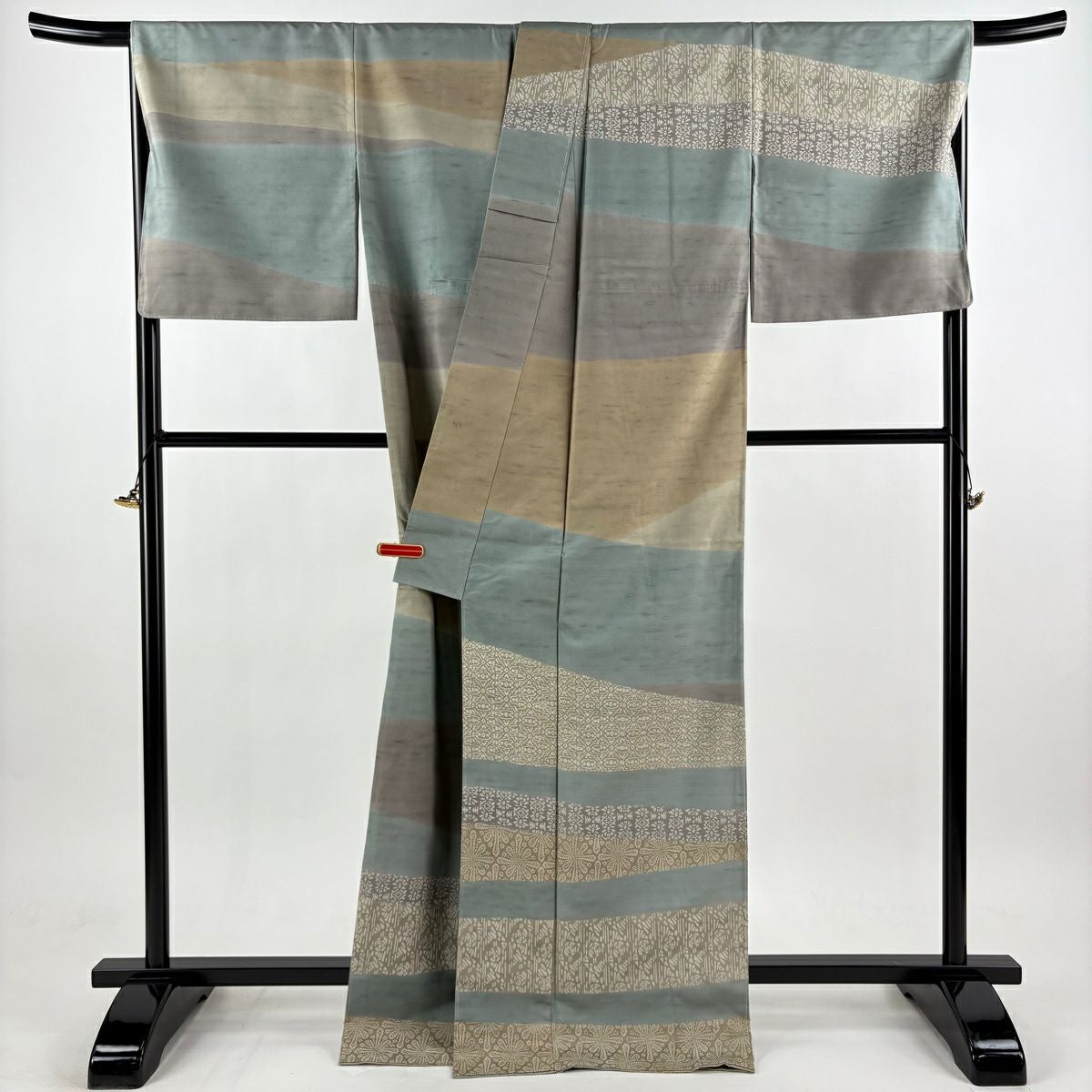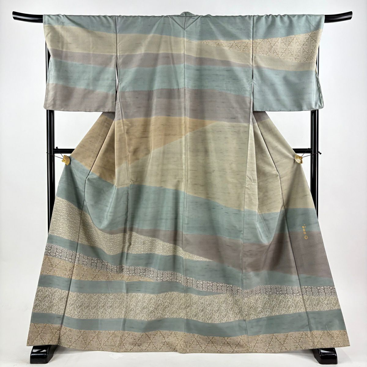 【美品】 訪問着 身丈169.5cm 裄丈69.5cm L 袷 牛首紬地 落款あり 縞 幾何学模様 灰緑 正絹 逸品