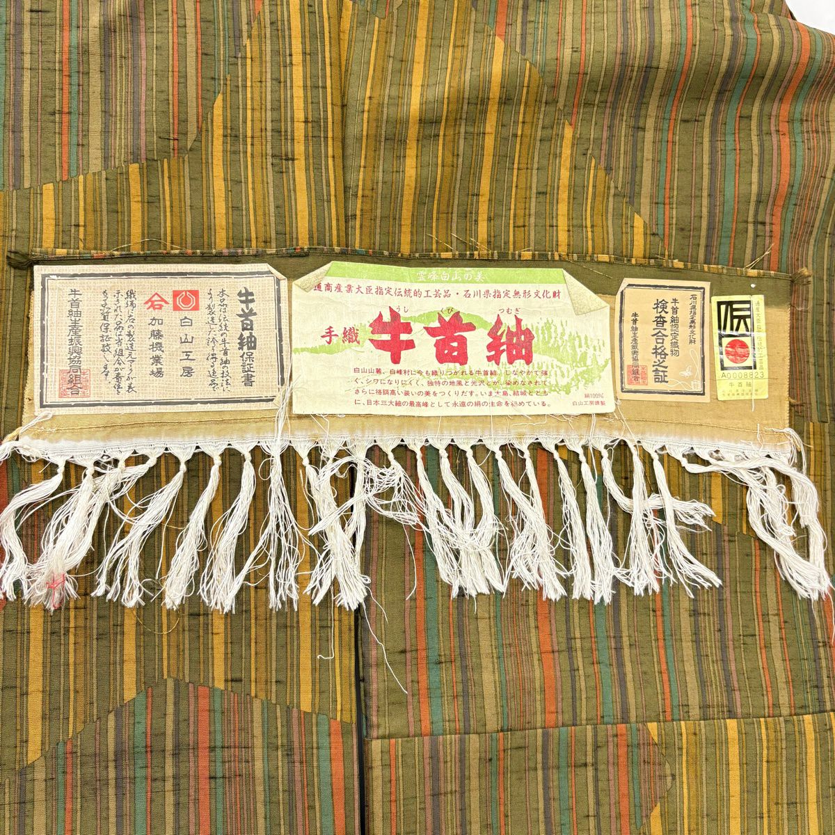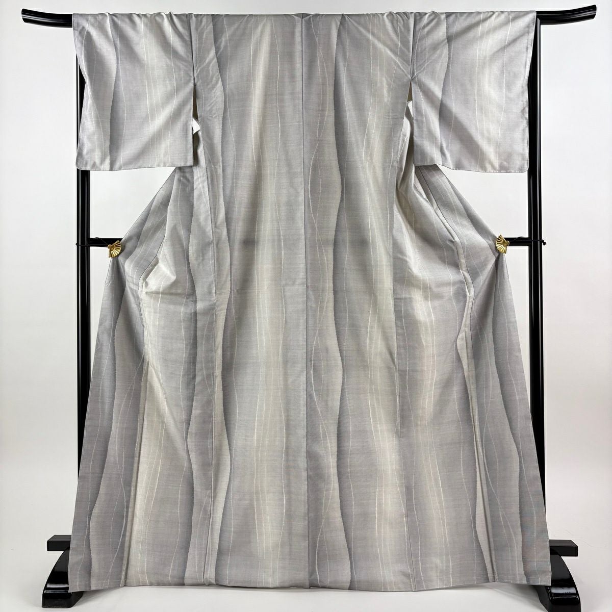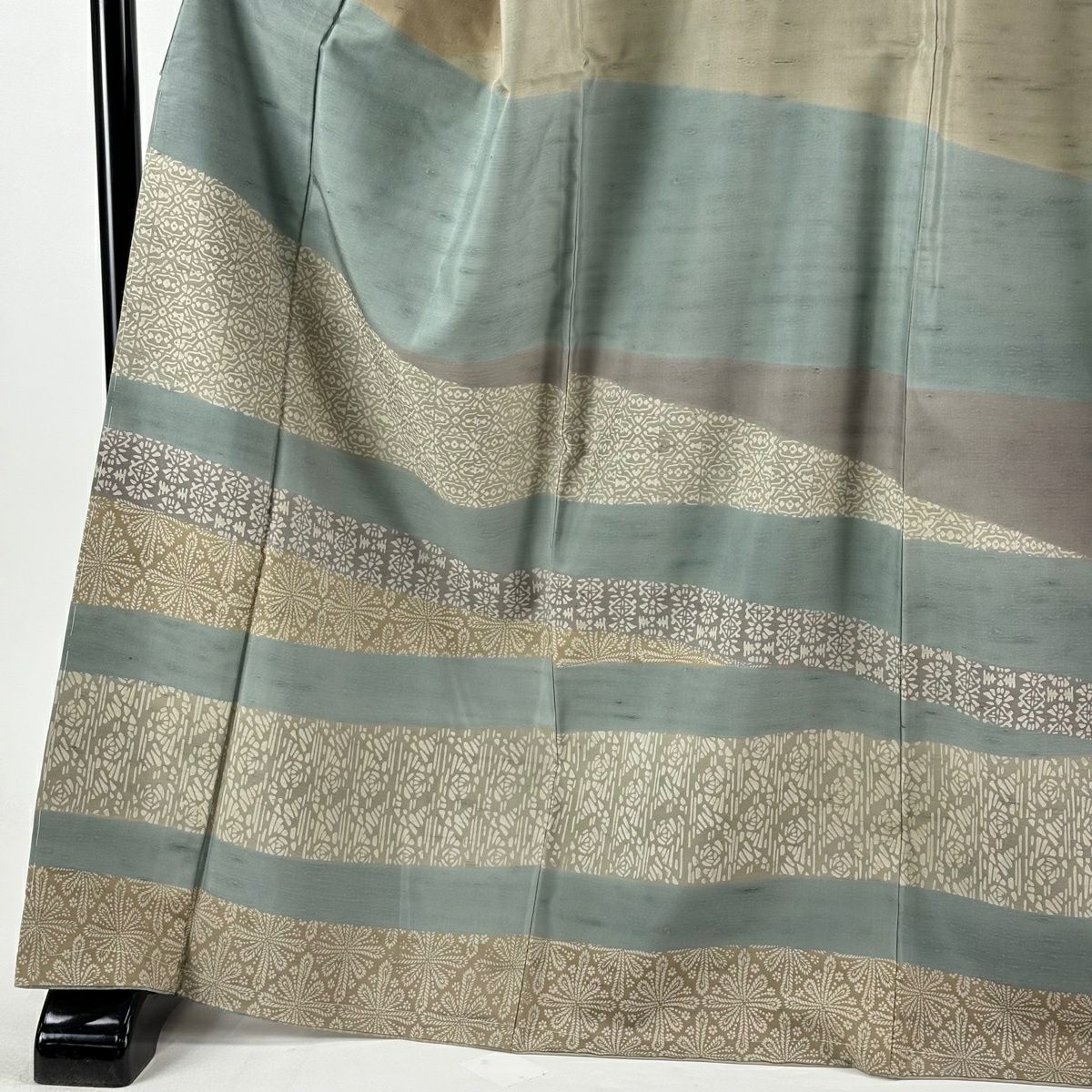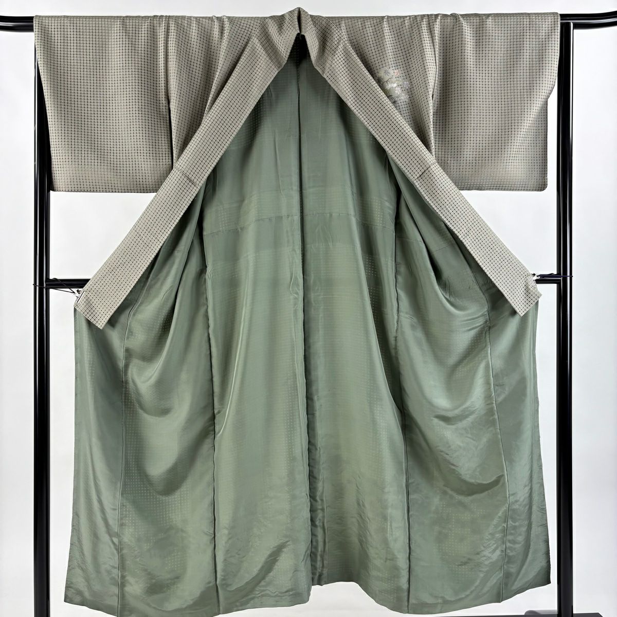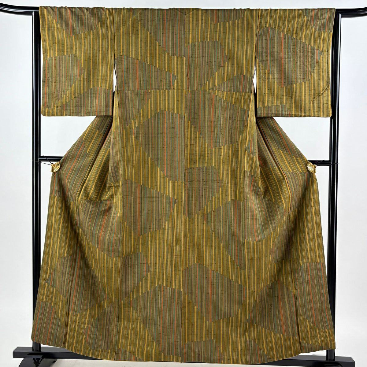 【美品】 訪問着 身丈169.5cm 裄丈69.5cm L 袷 牛首紬地 落款あり 縞 幾何学模様 灰緑 正絹 逸品