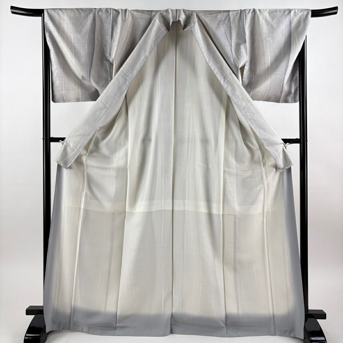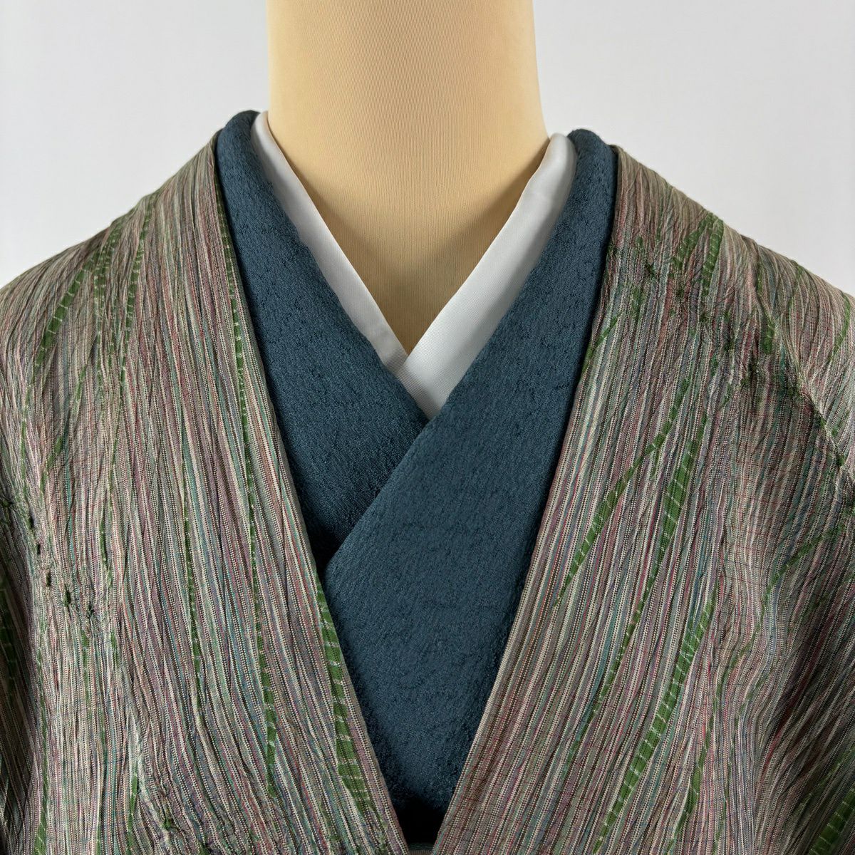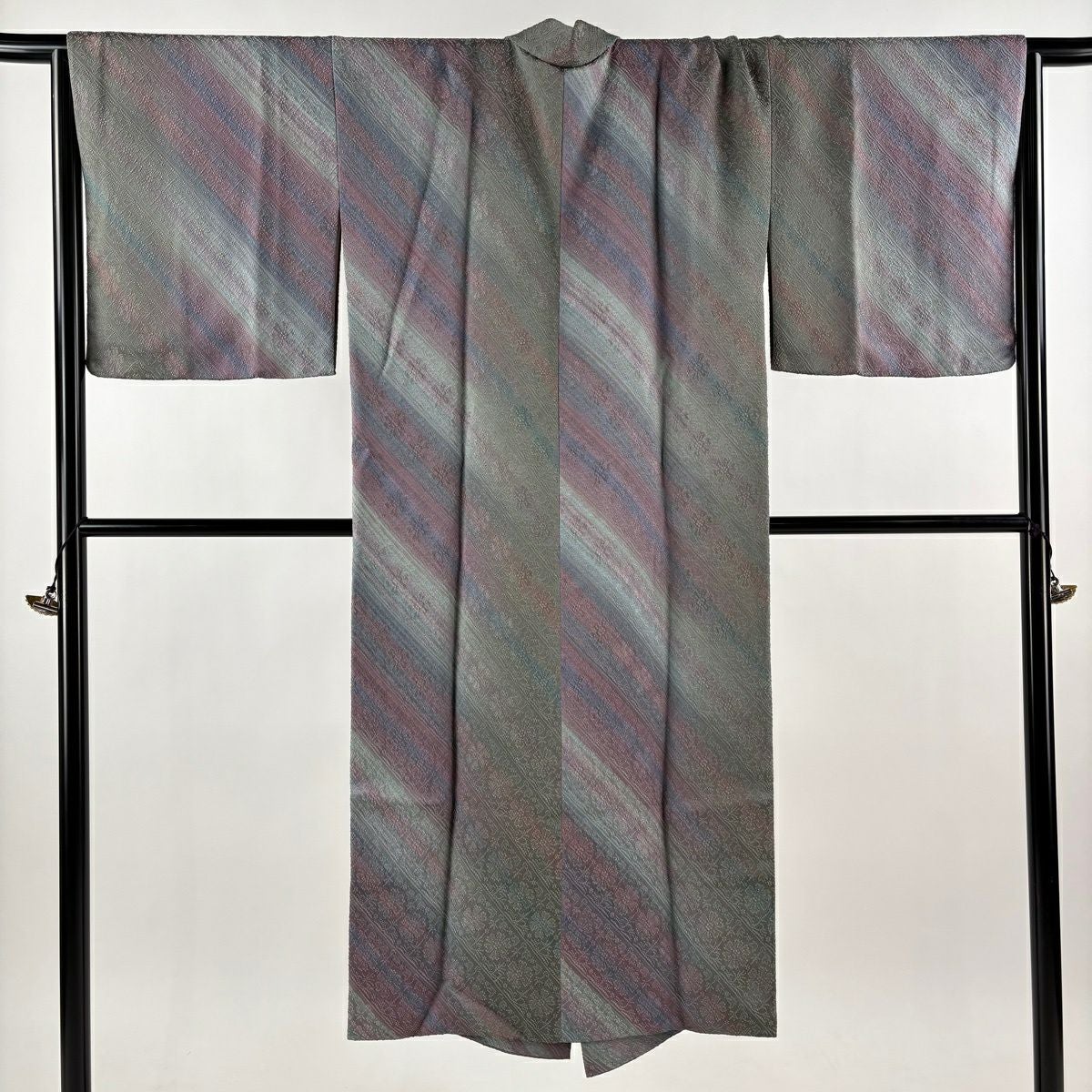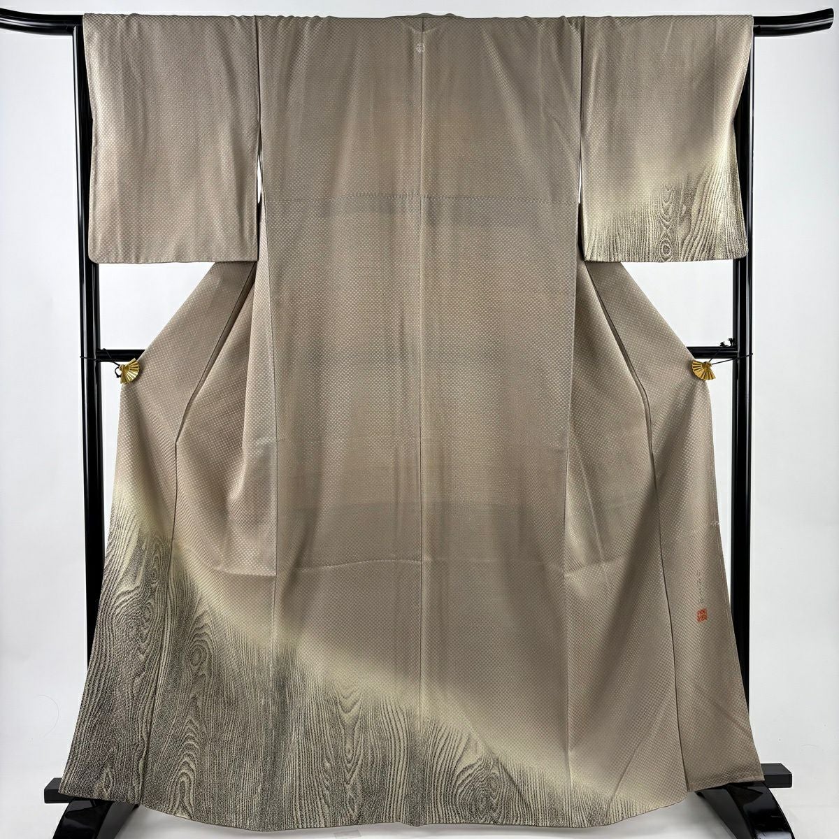 【美品】 訪問着 身丈169.5cm 裄丈69.5cm L 袷 牛首紬地 落款あり 縞 幾何学模様 灰緑 正絹 逸品