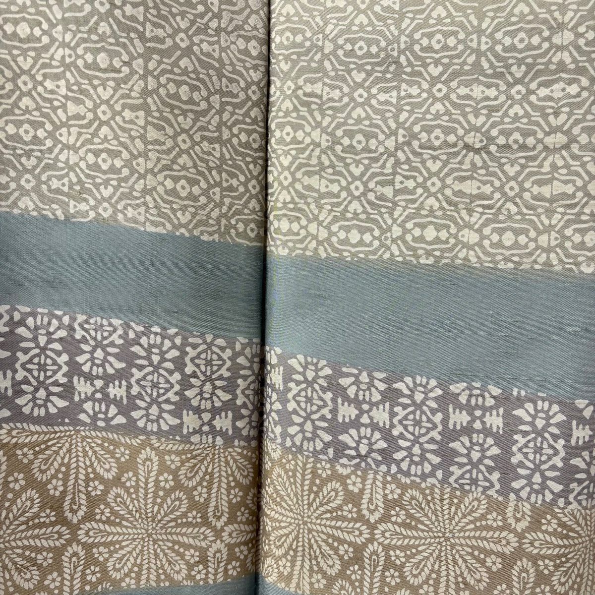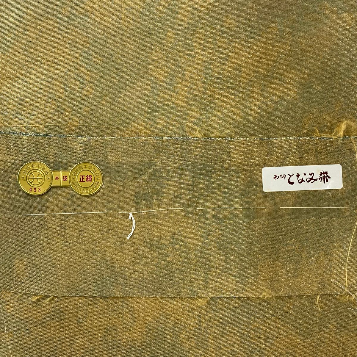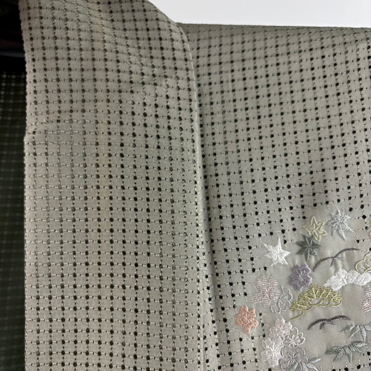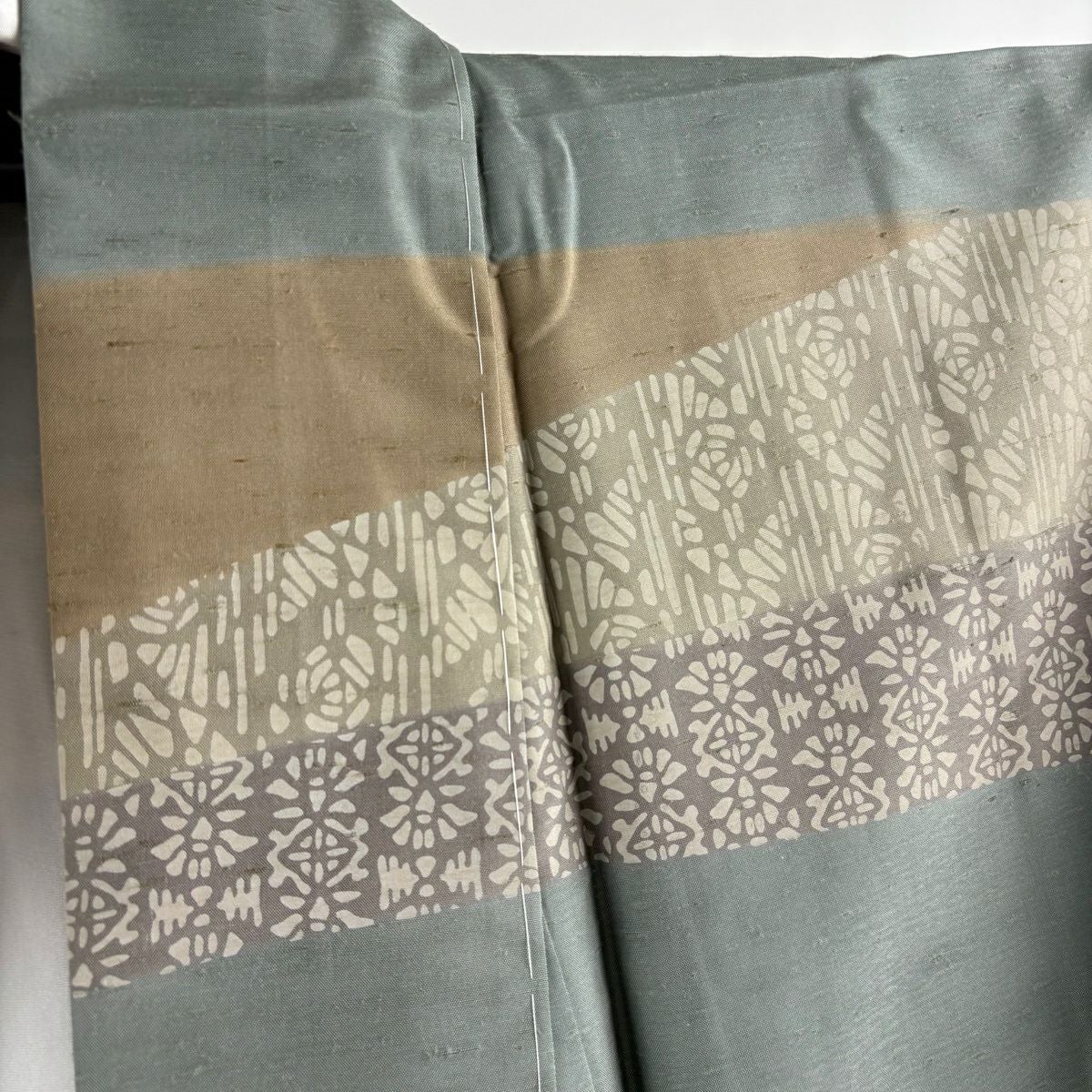 【美品】 訪問着 身丈169.5cm 裄丈69.5cm L 袷 牛首紬地 落款あり 縞 幾何学模様 灰緑 正絹 逸品