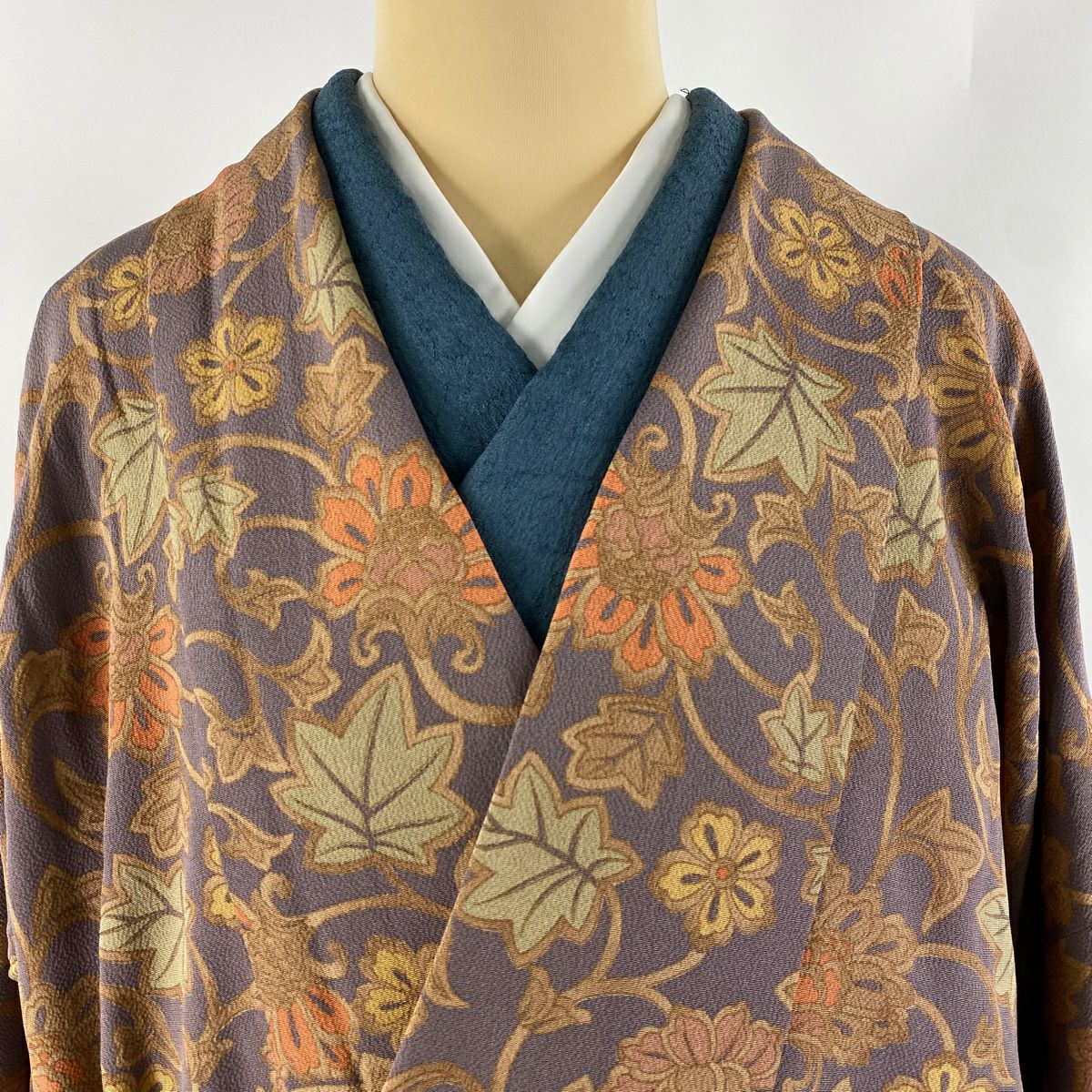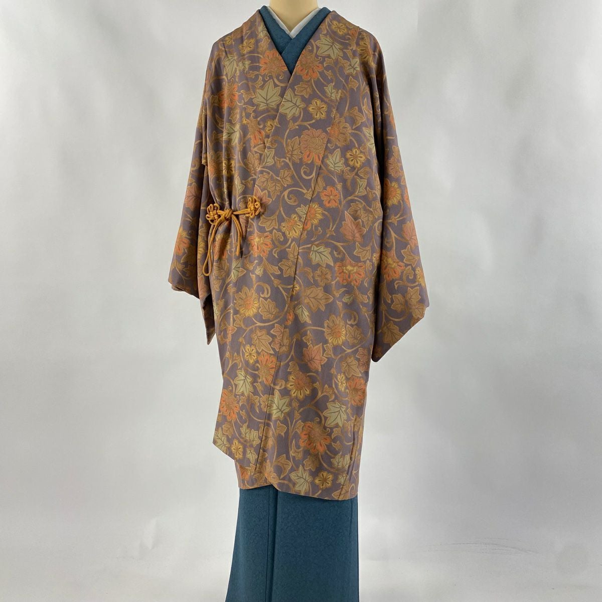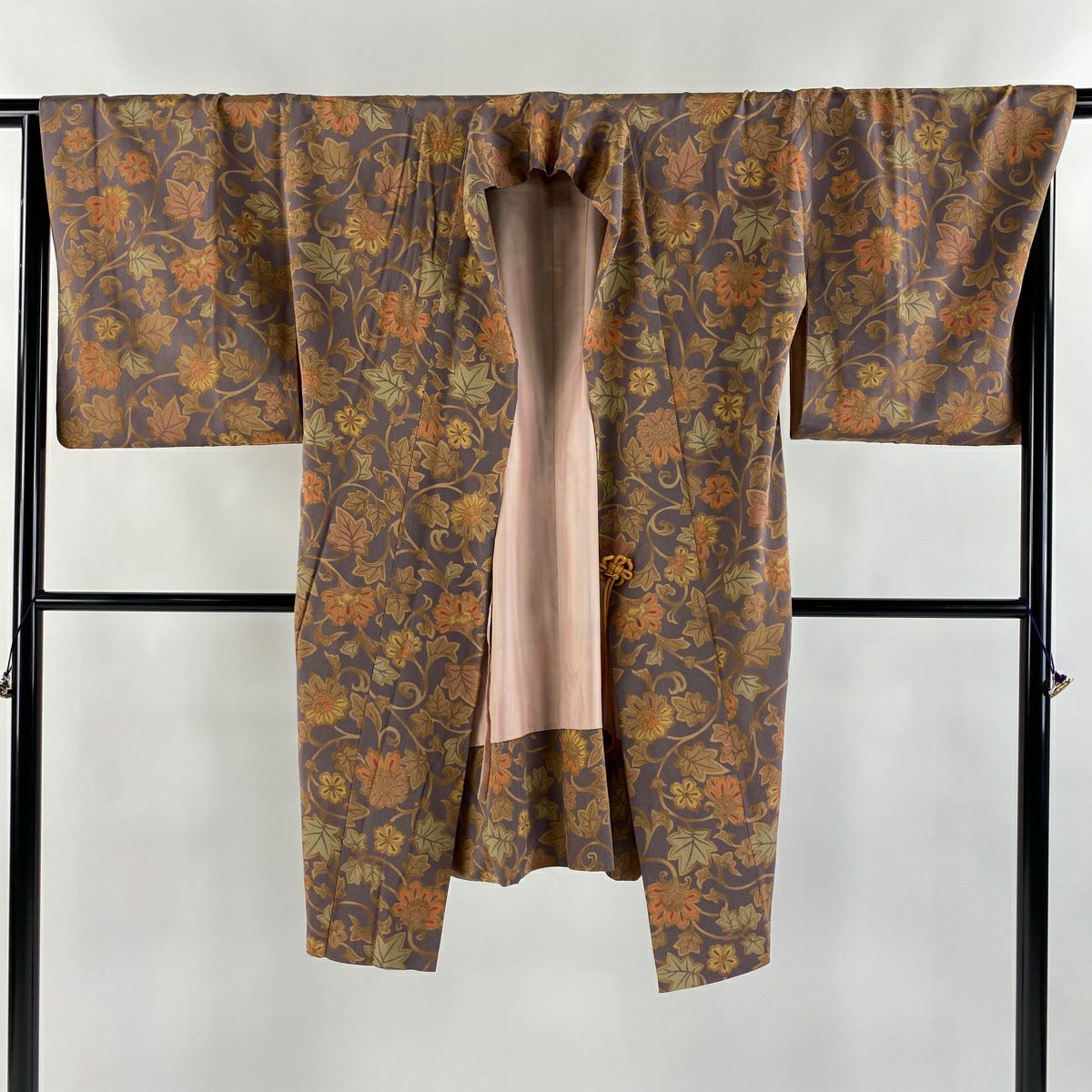 【美品】 道中着 身丈106cm 裄丈65cm M 和装コート 着物衿 葉と実 刺繍 金糸 灰紫 正絹 逸品