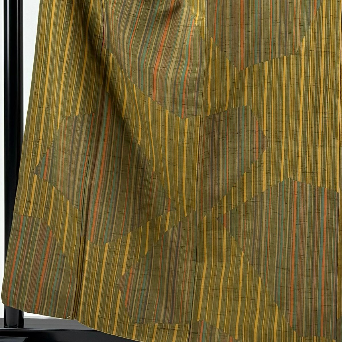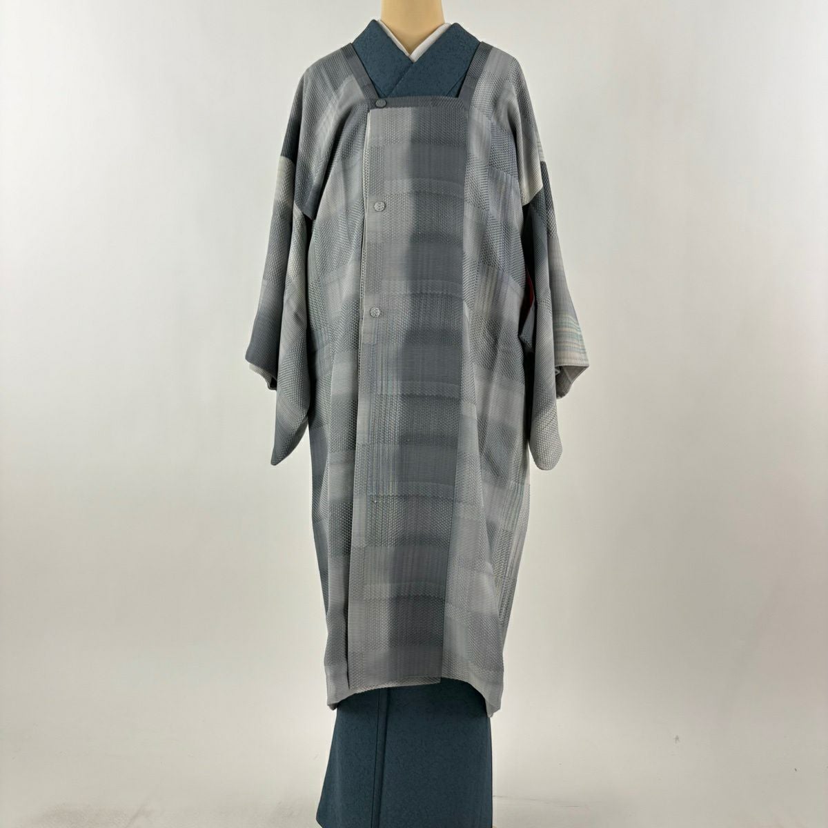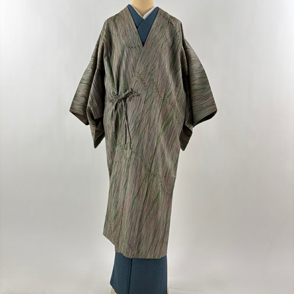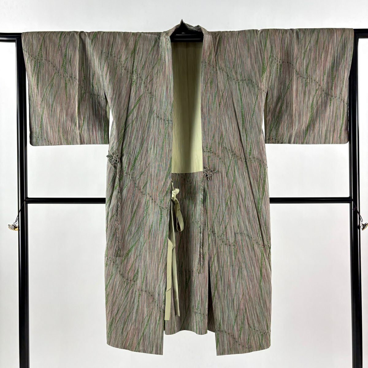 【美品】 道中着 身丈121.5cm 裄丈64.5cm M 和装コート 紬地 幾何学 縞 絞り 灰緑 正絹 逸品