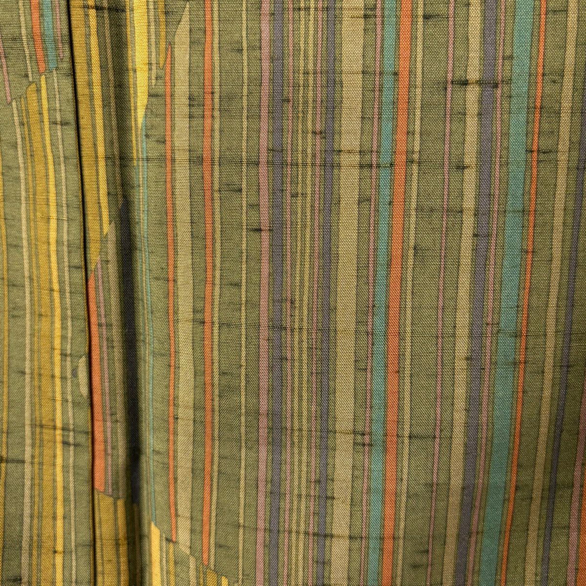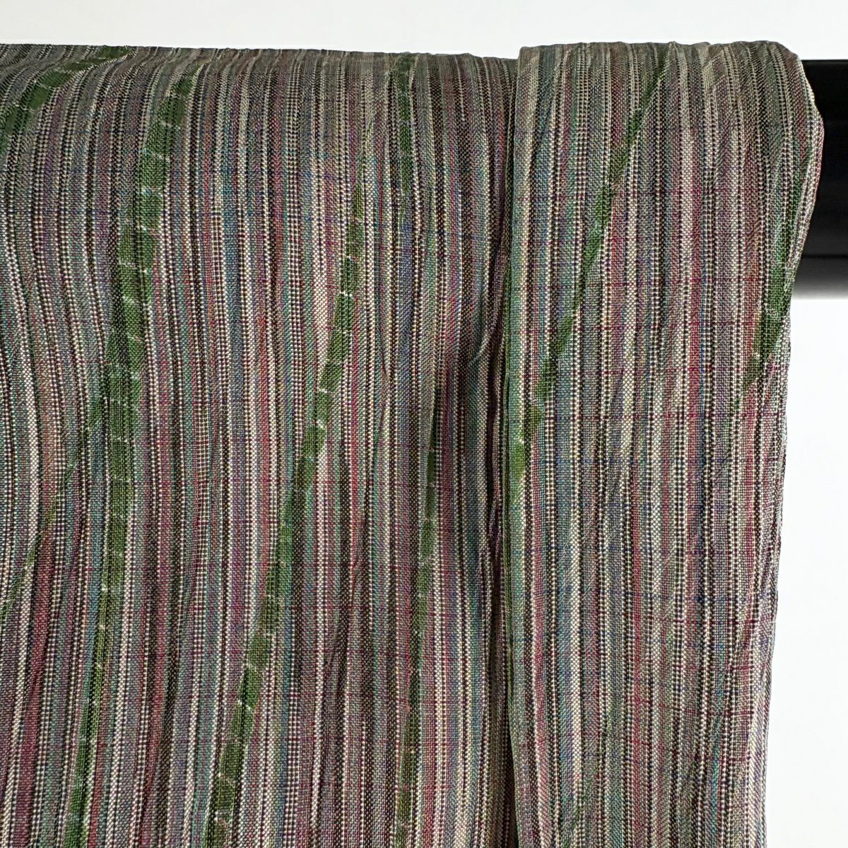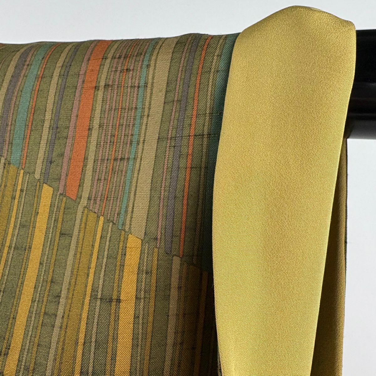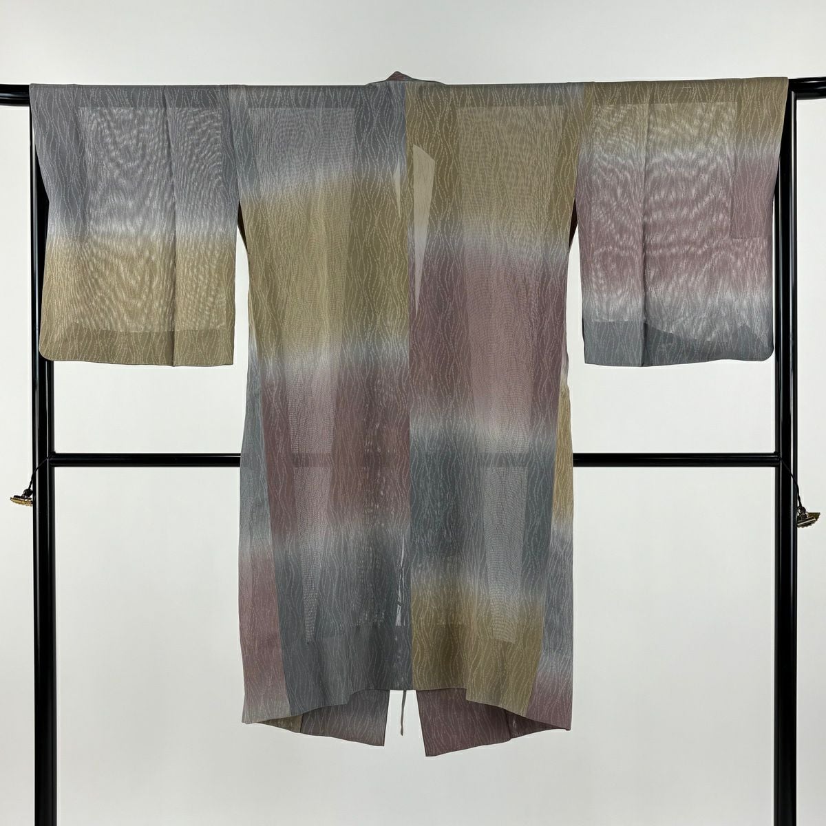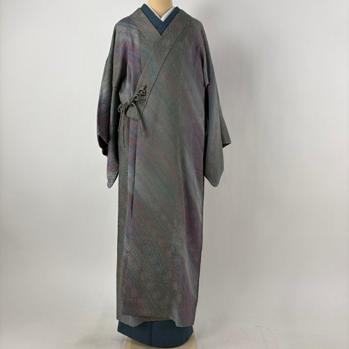 【美品】 道中着 身丈121.5cm 裄丈64.5cm M 和装コート 紬地 幾何学 縞 絞り 灰緑 正絹 逸品