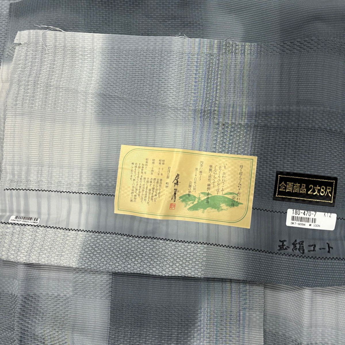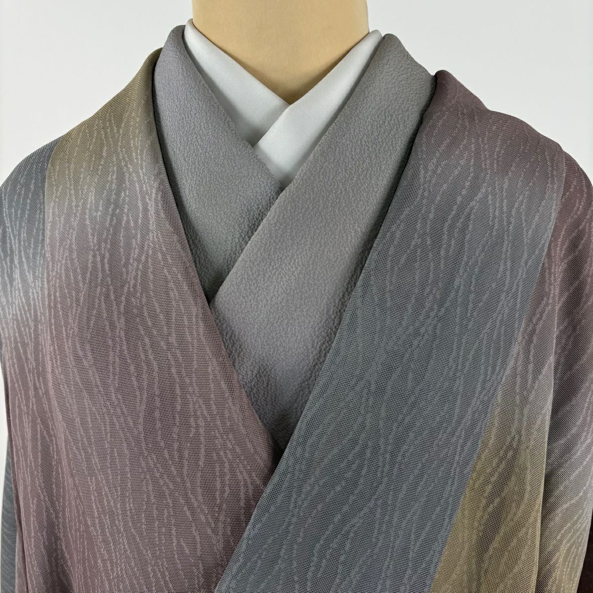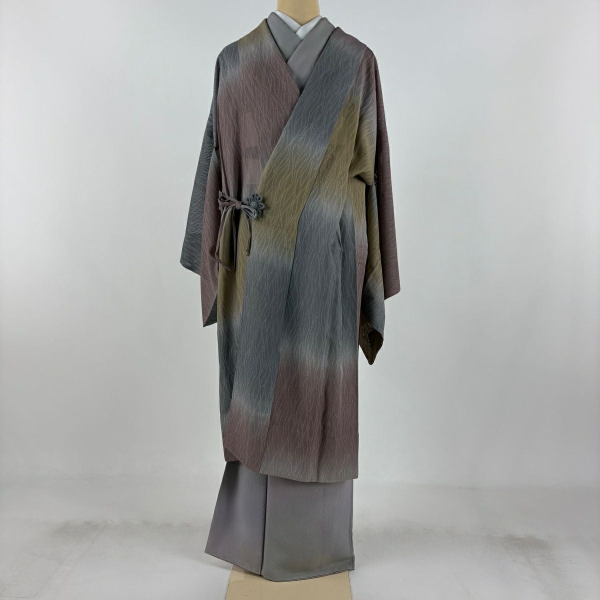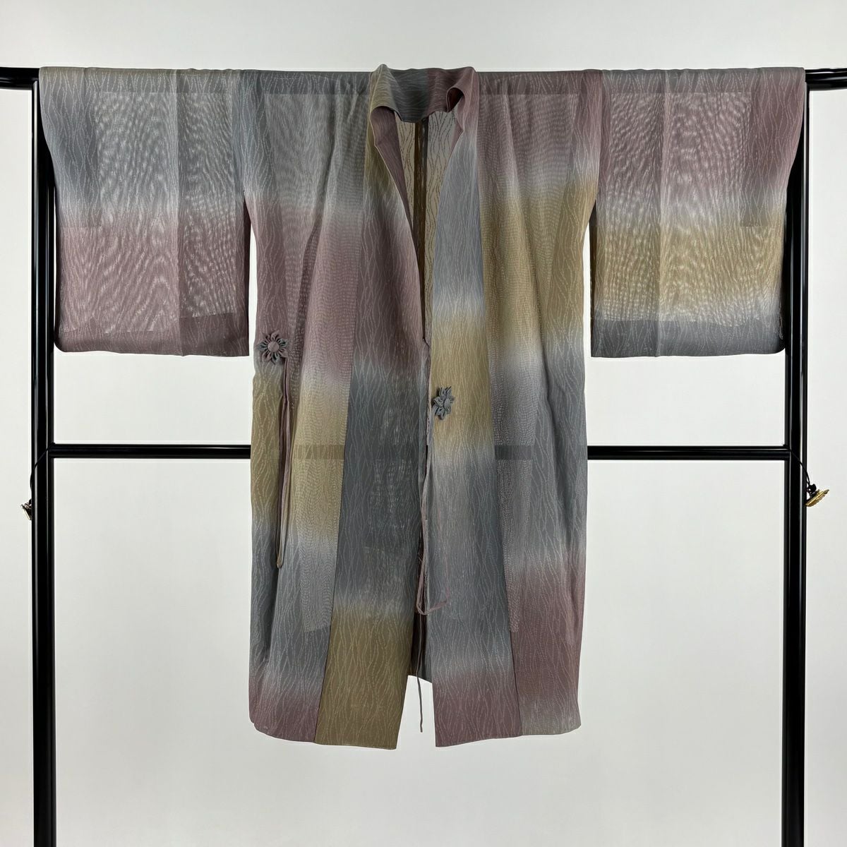 道行 身丈117cm 裄丈67cm M 岩浅公展 和装コート 角衿 落款あり 縞模様 ぼかし 灰色 正絹 逸品